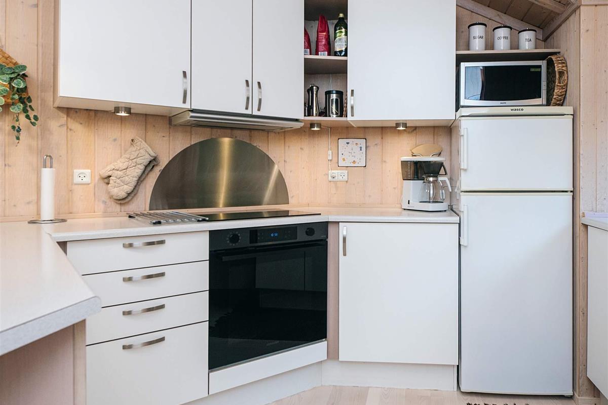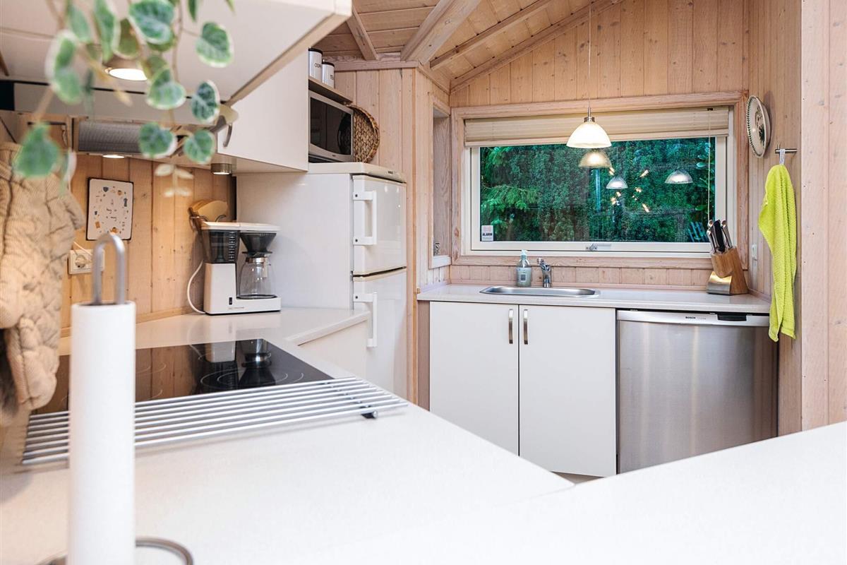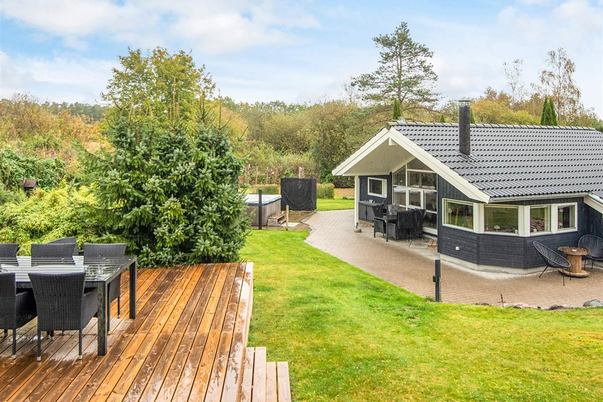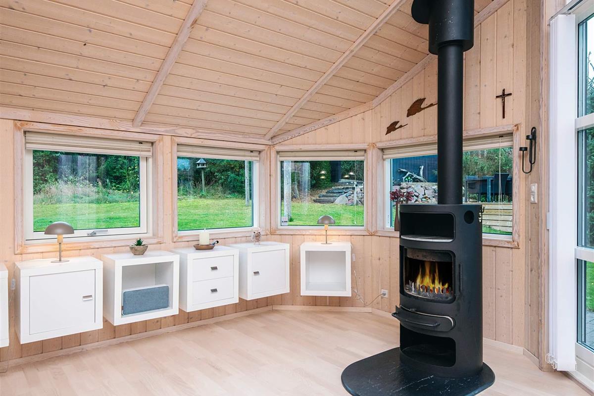 Und: Terrasse, überd. Terrasse, Carport, Außendusche, E-Heiz., Luft-Luft-Wärmepumpe, Grill, Naturgrundst. m. Bäumen 1200 m2, moderne Möblierung, Ferienhausgebiet, Nichtraucherhaus