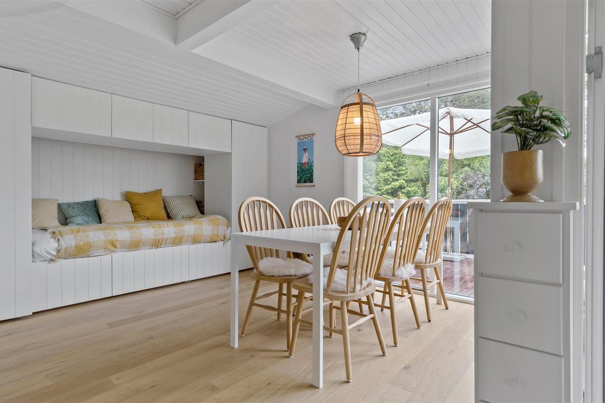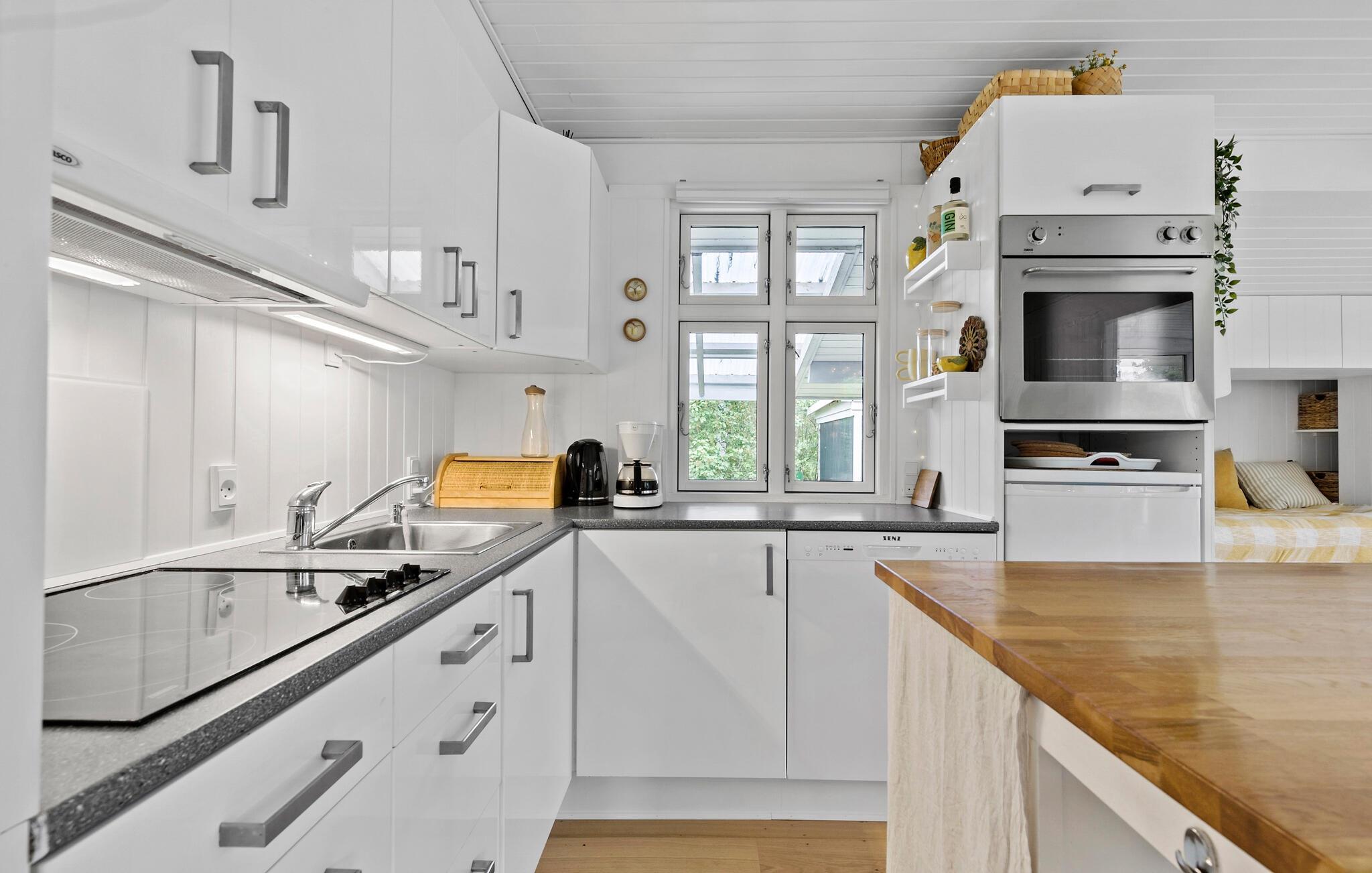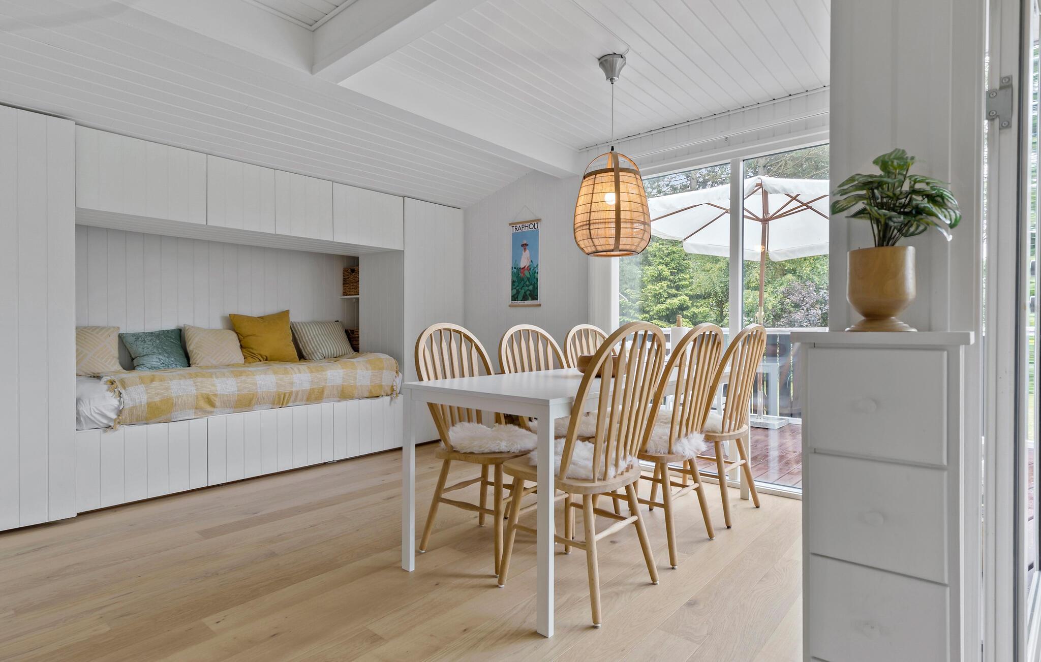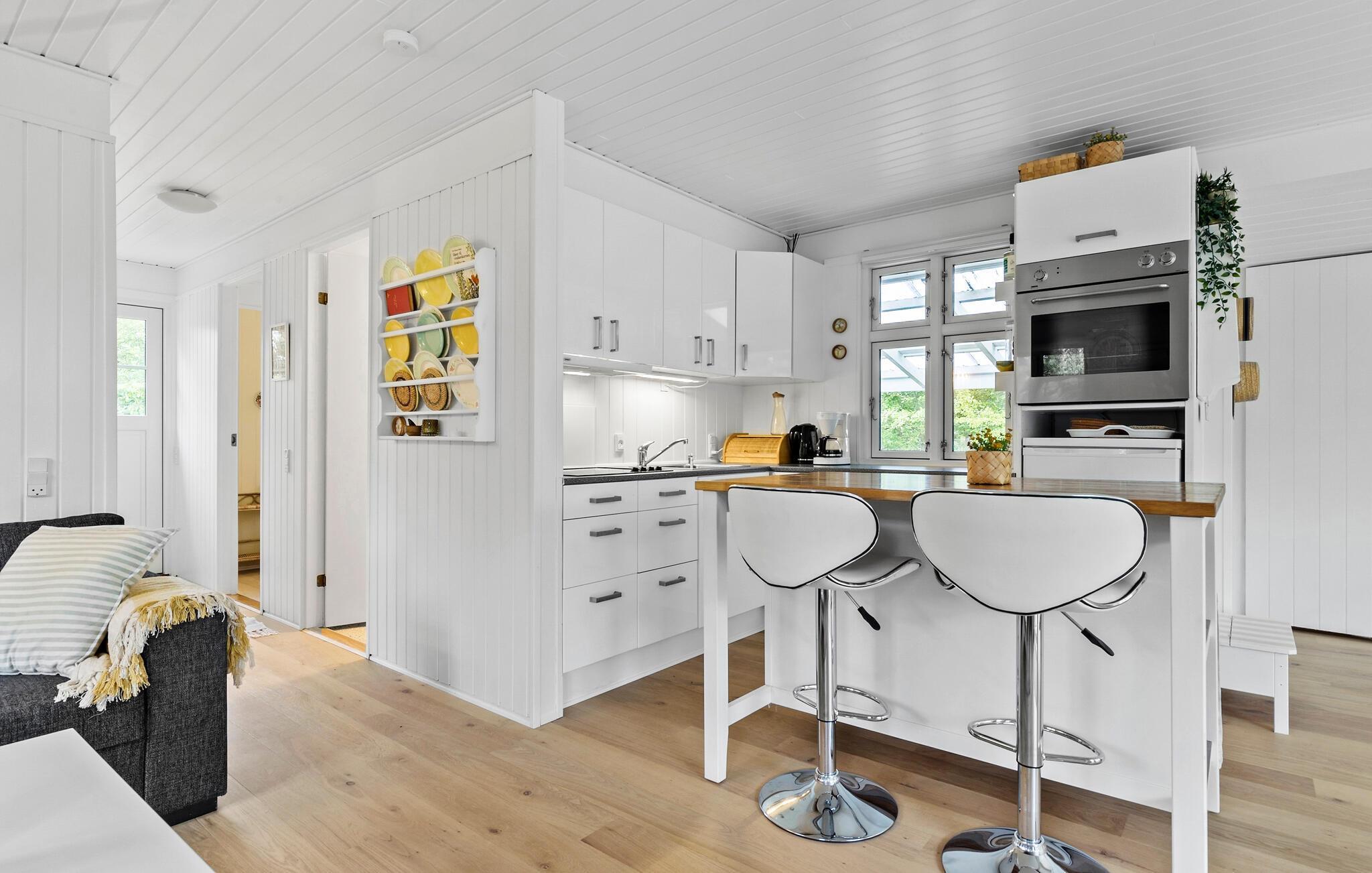 Dompel jezelf onder in de hyggesfeer van je vakantiehuis, dat zowel ontspanning als spannende excursiemogelijkheden biedt. Binnen vind je een uitnodigende sfeer met een vriendelijk ontwerp en lichtgekleurd hout. De open keuken is de ideale plek voor gezamenlijke maaltijden en gezellige kookavonden. Geniet van je ontbijt aan de stijlvolle eettafel of buiten op het terras en begin de dag ontspannen. Na je eerste kopje koffie kun je het jezelf gemakkelijk maken op de gezellige bank. De eettafel is niet alleen geschikt voor maaltijden, maar ook voor bordspellen en creatieve activiteiten. Laat je creativiteit de vrije loop en geniet van de tijd samen met het gezin.