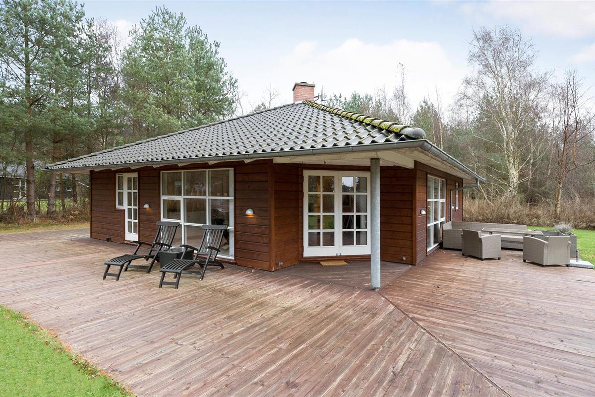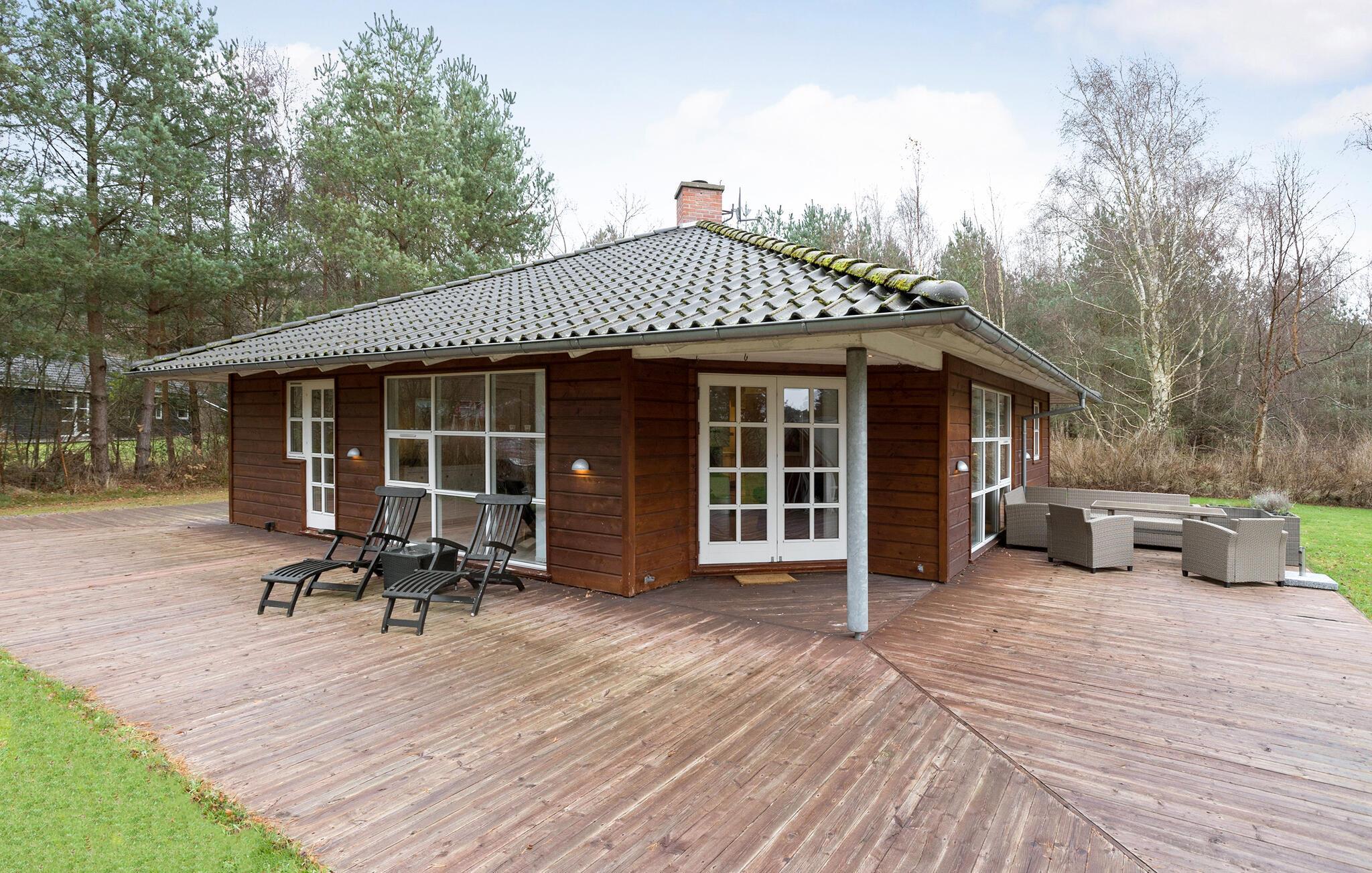 Een ruim houten terras rond het huis zorgt voor extra comfort: of je nu ligt te zonnebaden, buiten eet of kijkt hoe je kinderen spelen, je zult hier rust en ontspanning vinden.