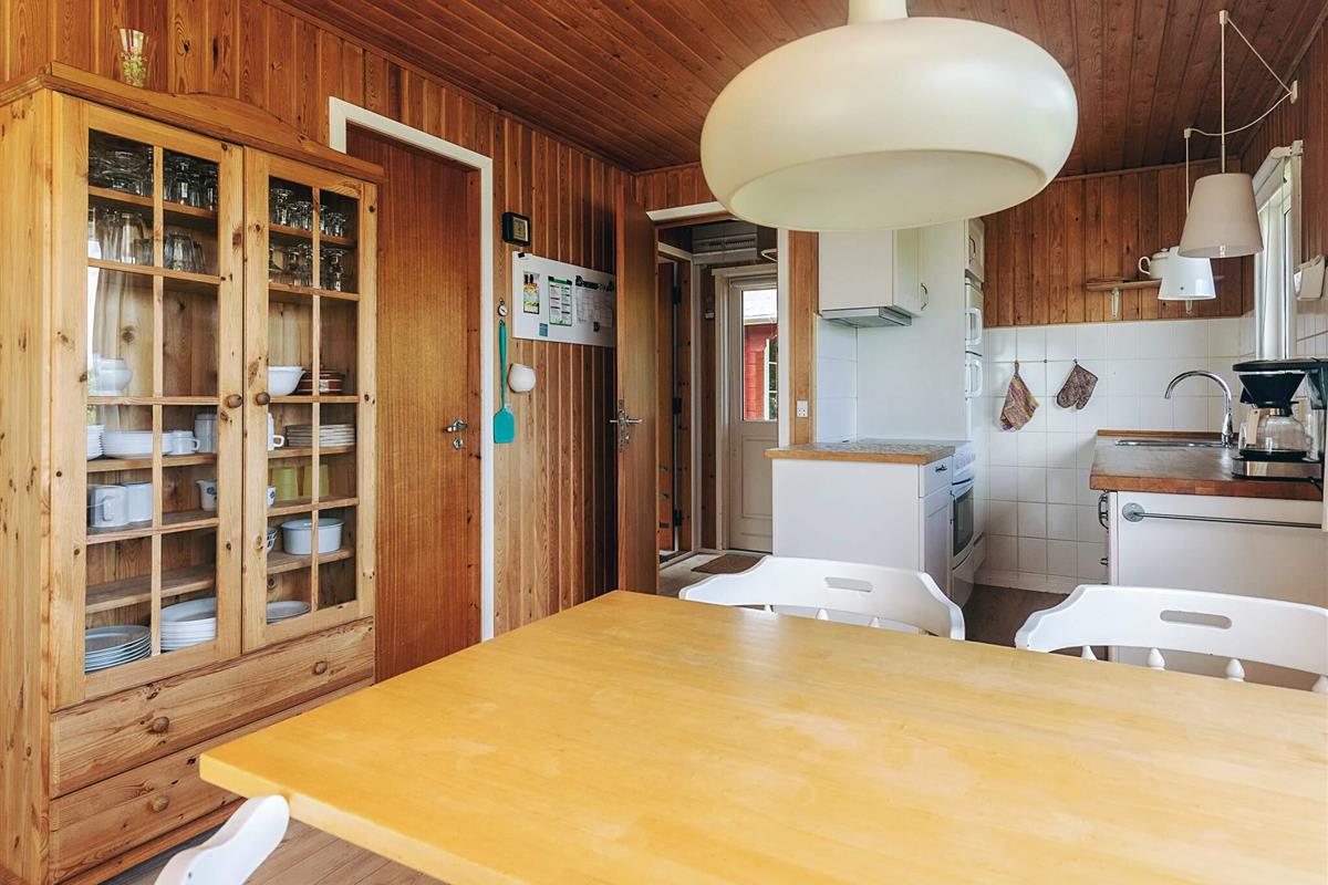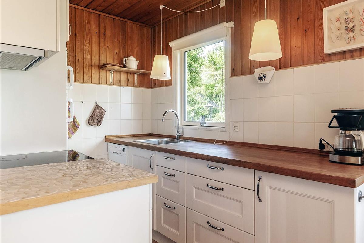 Das Ferienhaus bietet einen hellen, offenen Küchen-/Wohnbereich für das Familienleben, inklusive Holzofen und direktem Zugang zur Terrasse davor. Zur technischen Ausstattung gehören freies WLAN, Flachbild-TV und eine digitale Satellitenschüssel mit internationalen Sendern zur Auswahl. Die Küchenausstattung ist ausgestattet mit u.a. Ceranfeld, Mikrowelle und Geschirrspüler. Außerdem zwei Schlafzimmer und helles WC mit einfacher Handbrause im Haus. Für kleine Urlauber steht ein Hochstuhl bereit.