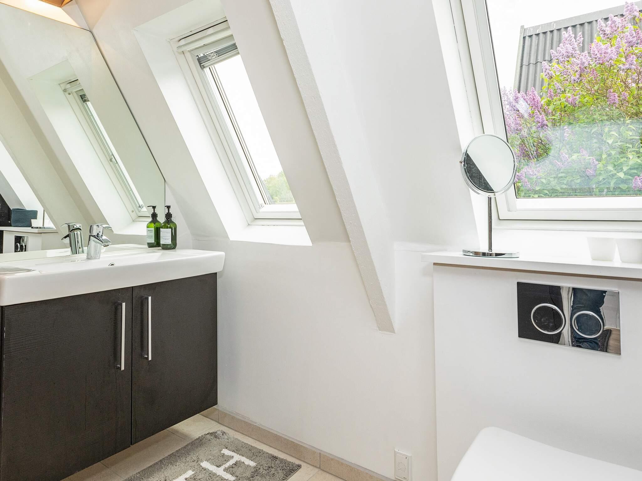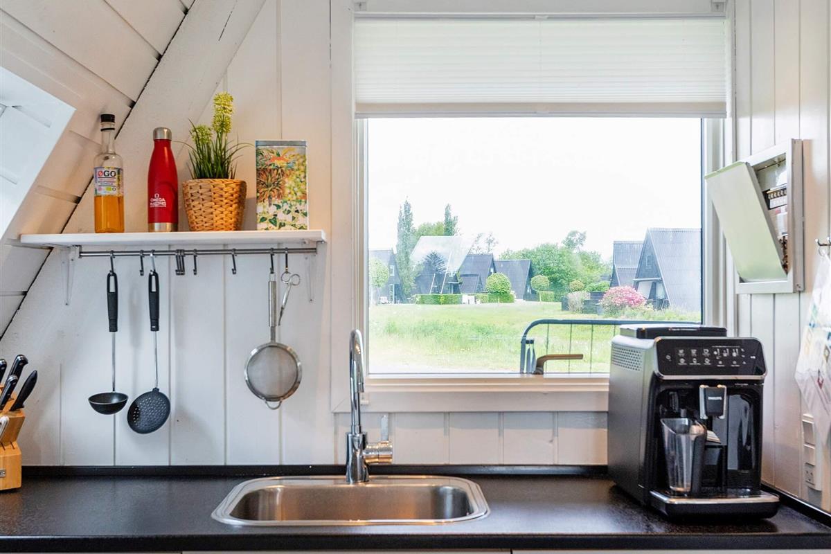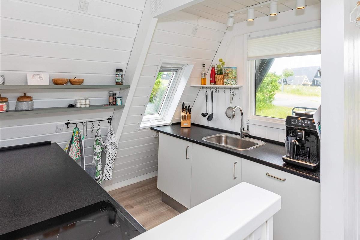 Gute Raumaufteilung im Ferienhaus. Im Erdgeschoss befindet sich ein offener Küchen-/Wohnbereich für das Familienleben mit Zugang zur Terrasse, modernen Möbeln und einem Smart-TV, auf dem Sie Ihre eigenen Fernsehprogramme streamen können. Zum Heizen stehen sowohl eine klimafreundliche Wärmepumpe als auch ein gemütlicher Holzofen zur Verfügung. Im Untergeschoss befindet sich außerdem ein Badezimmer.