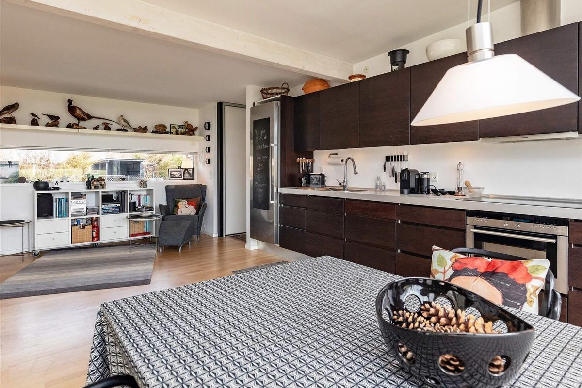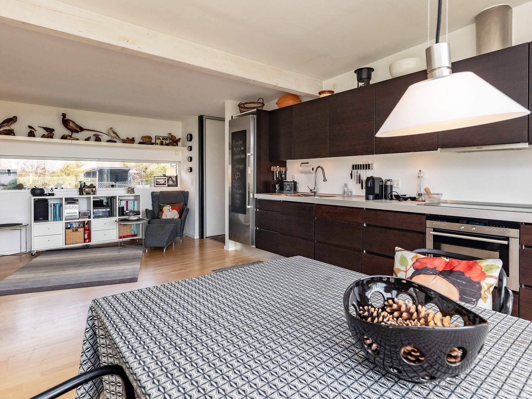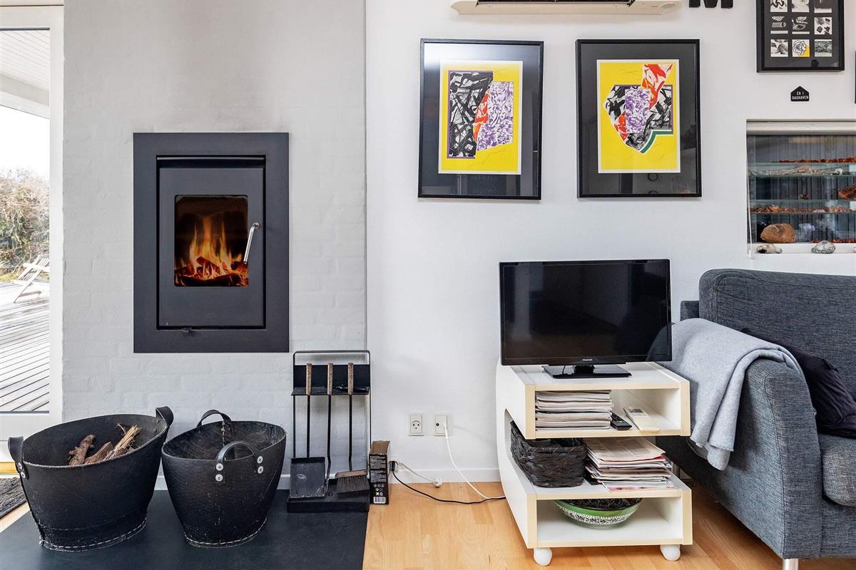 Helle, offene Küche in Verbindung mit dem Wohnzimmer, ausgestattet mit u.a. Kühlschrank, Gefrierschrank und Geschirrspüler. Das Wohnzimmer hat einen Smart-TV zum Streamen eigener Anbieter. Zudem Musikanlage mit CD-Player und ein gemütlicher Holzofen im Wohnzimmer.