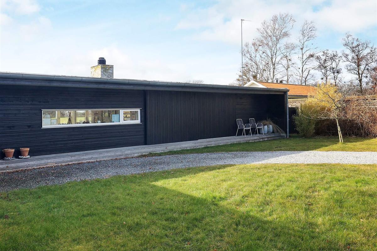 Große Terrasse, die sowohl offen als auch überdacht ist, als Verbindung zwischen Haus und Annex. Gartenmöbel, Liegestühle und Holzkohlegrill sind vorhanden. Carport auf dem Grundstück. Am Ende des Gartens fließt ein kleiner Bach in Richtung Felder.