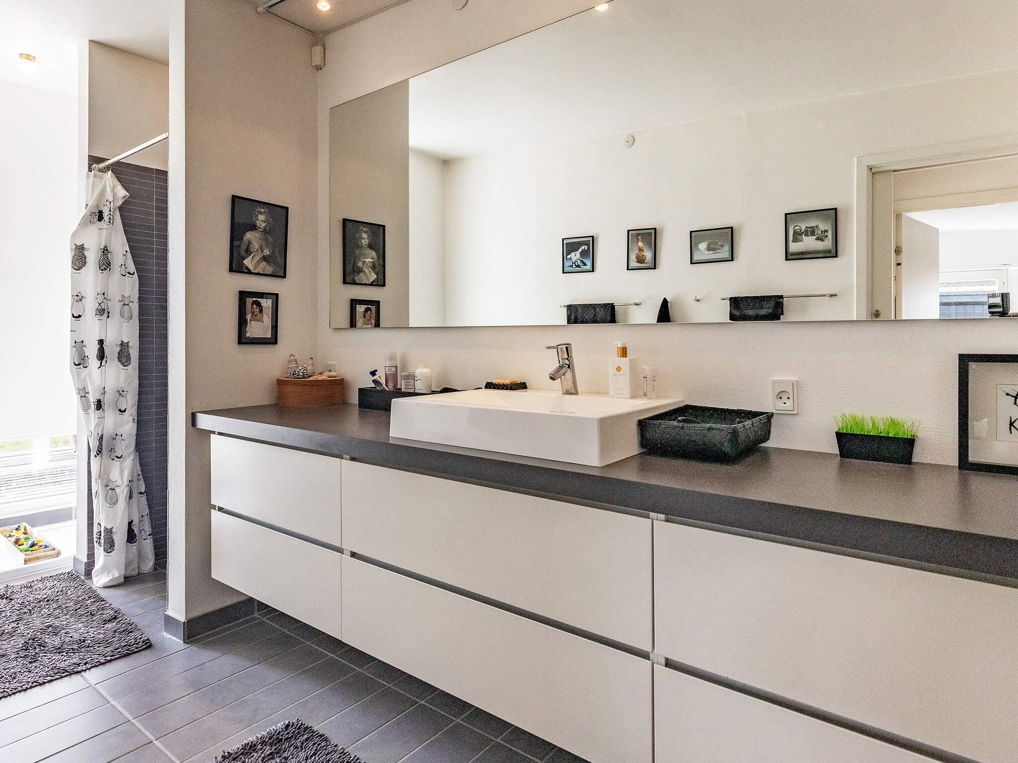 Im Haus attraktives Badezimmer mit WC, Waschbecken, Dusche, Whirlwanne für eine Person und Sauna für drei Personen. Klimafreundliche Wärmepumpe im Küchen-/Wohnbereich.