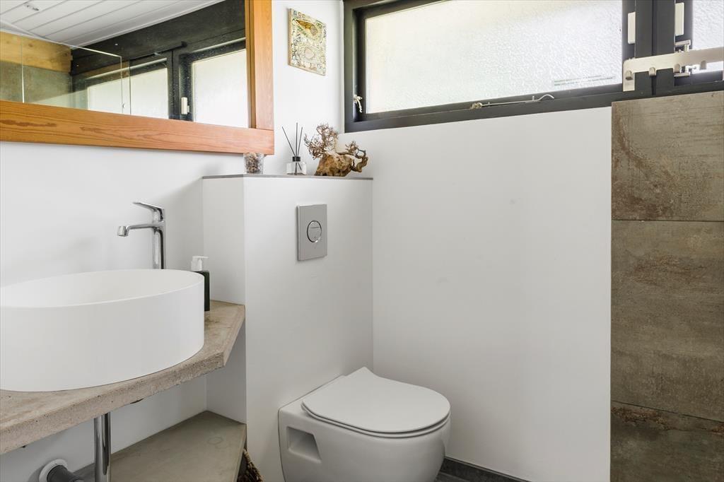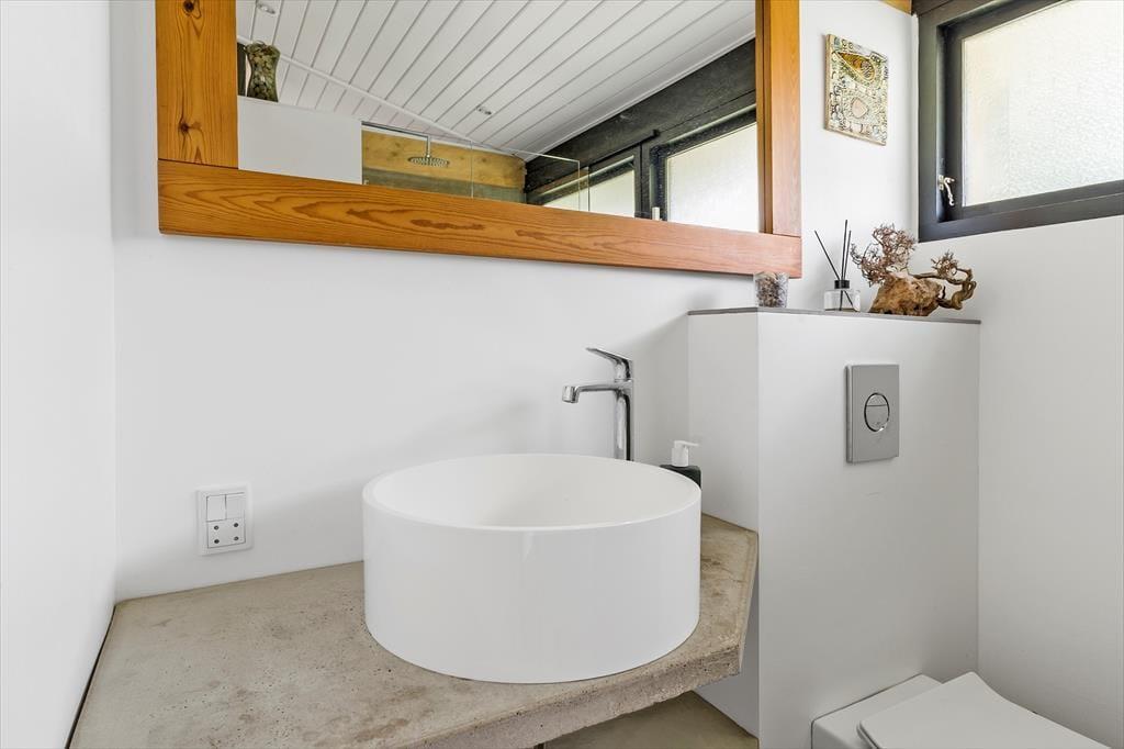 Das Badezimmer liegt gegenüber dem Schlafzimmer.