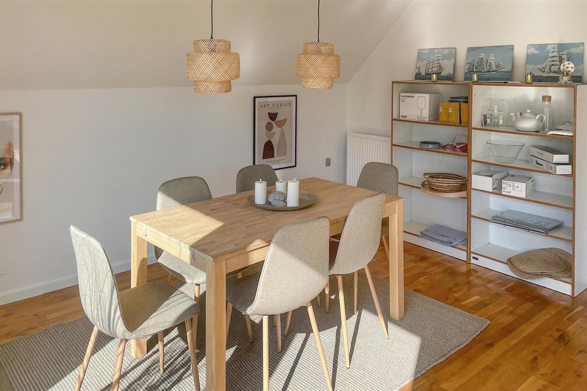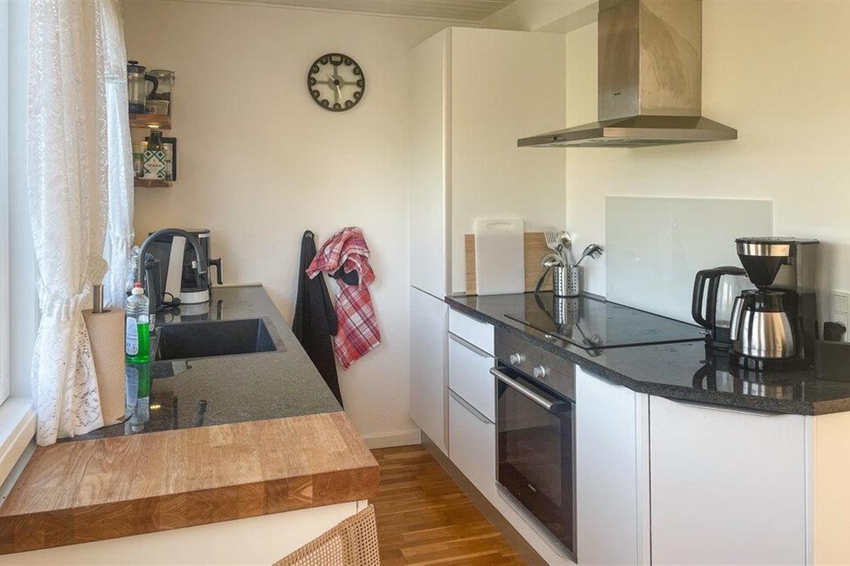 Dit functioneel ingerichte vakantiehuis biedt je een goede basis voor een rustig verblijf in een natuurlijke omgeving. Maak het jezelf gemakkelijk in de open woon- en eetkamer. Geniet van het uitzicht op de tuin door de grote ramen of neem samen plaats aan de eettafel. De inrichting is eenvoudig maar gezellig, met een bank, verschillende fauteuils en een tv. De lichte keuken biedt ruimte voor self-catering en heeft moderne kookfaciliteiten, evenals een kleine zithoek bij het raam.