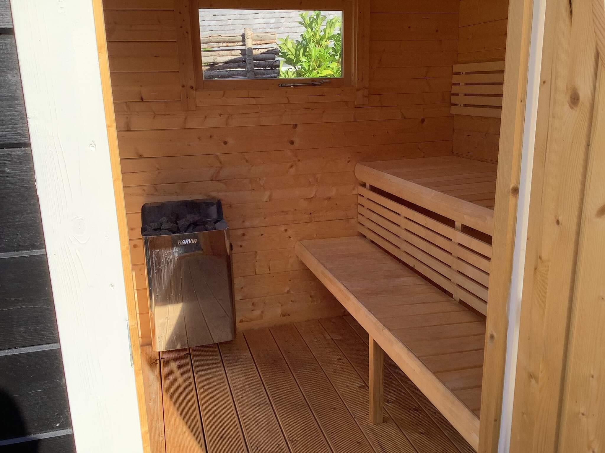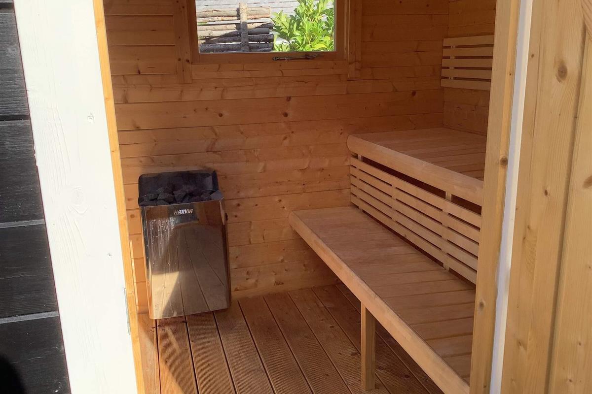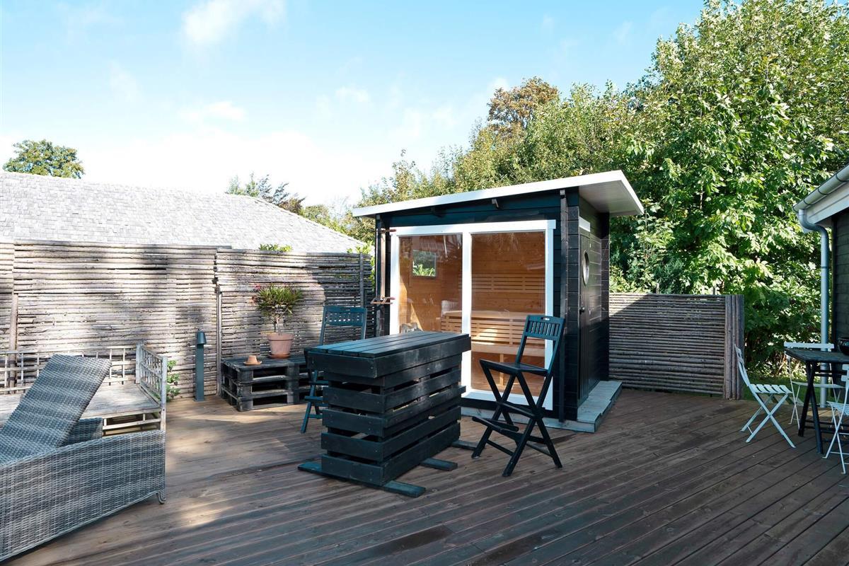 Wellnessbegeisterte freuen sich nach einem Tag am Strand über die Außensauna und eine erfrischende Außendusche. Die Terrasse ist komplett mit Gartenmöbeln und einem Grill für entspannte Abende an der frischen Luft ausgestattet.