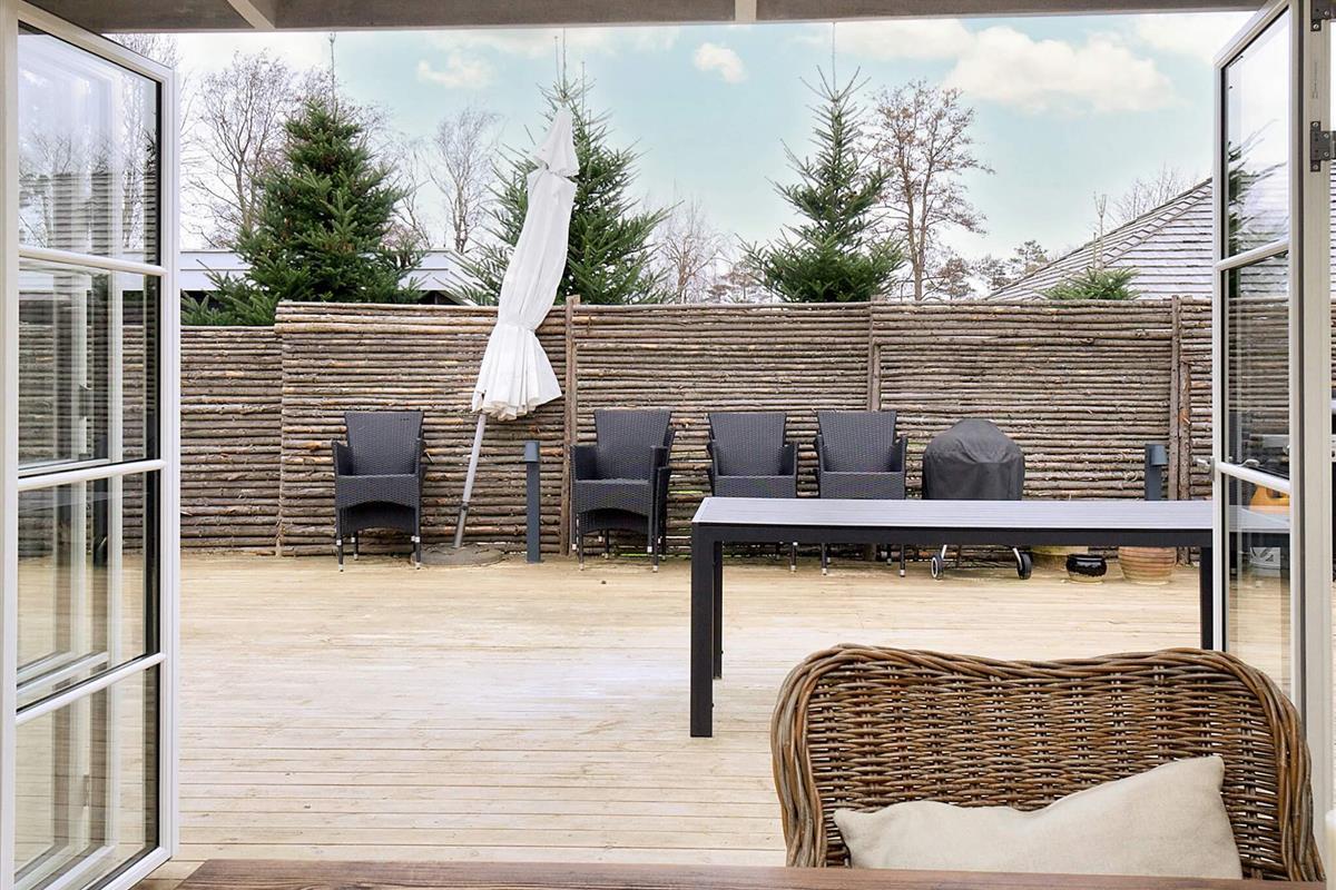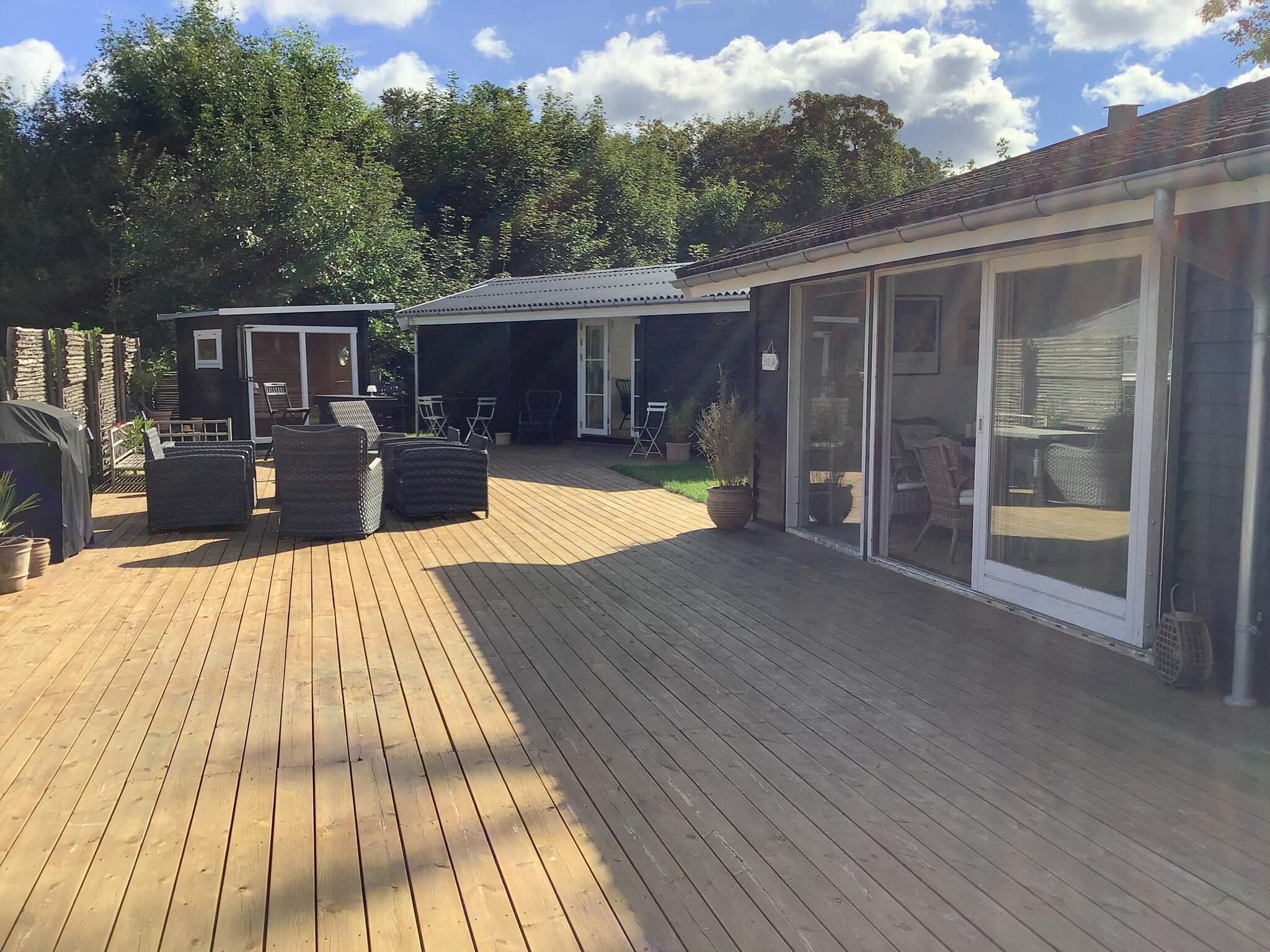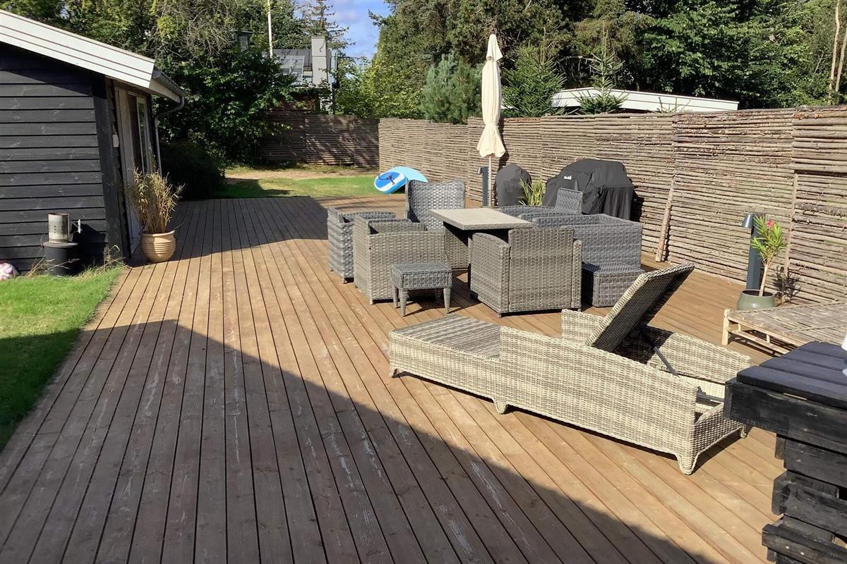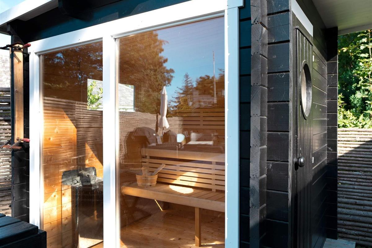 Wellnessbegeisterte freuen sich nach einem Tag am Strand über die Außensauna und eine erfrischende Außendusche. Die Terrasse ist komplett mit Gartenmöbeln und einem Grill für entspannte Abende an der frischen Luft ausgestattet.