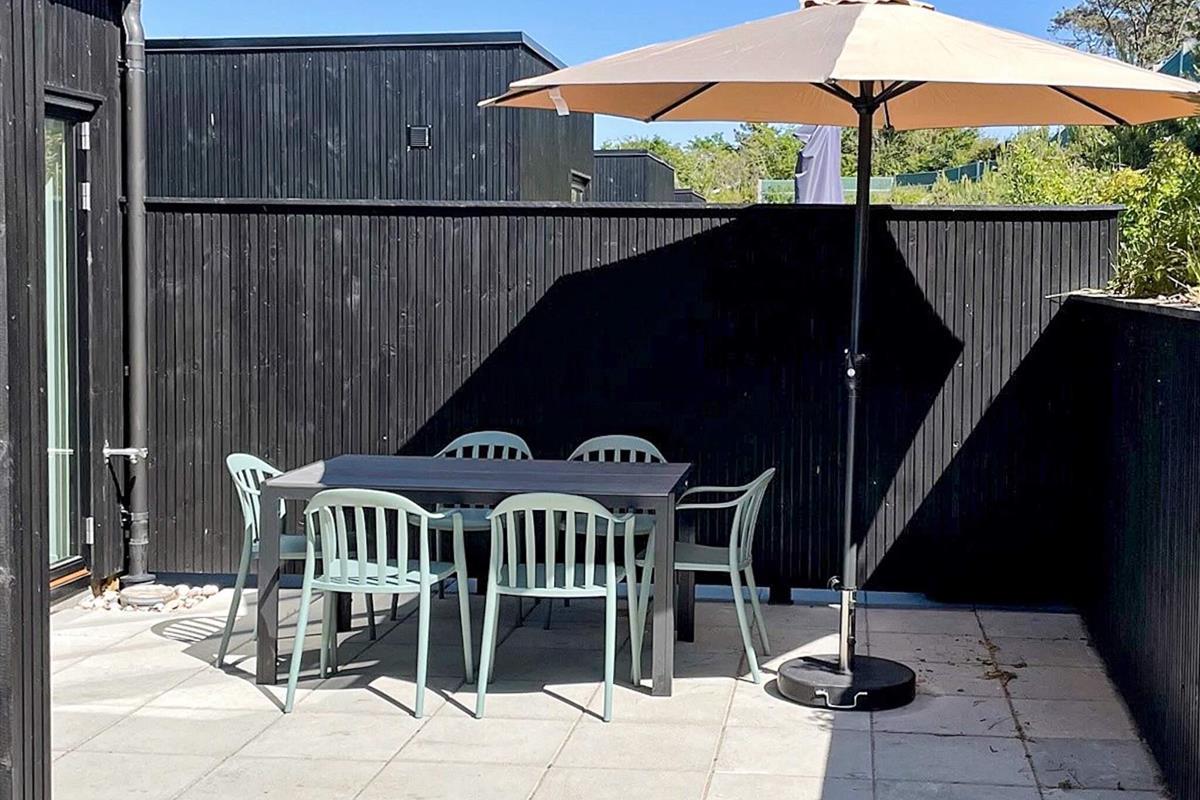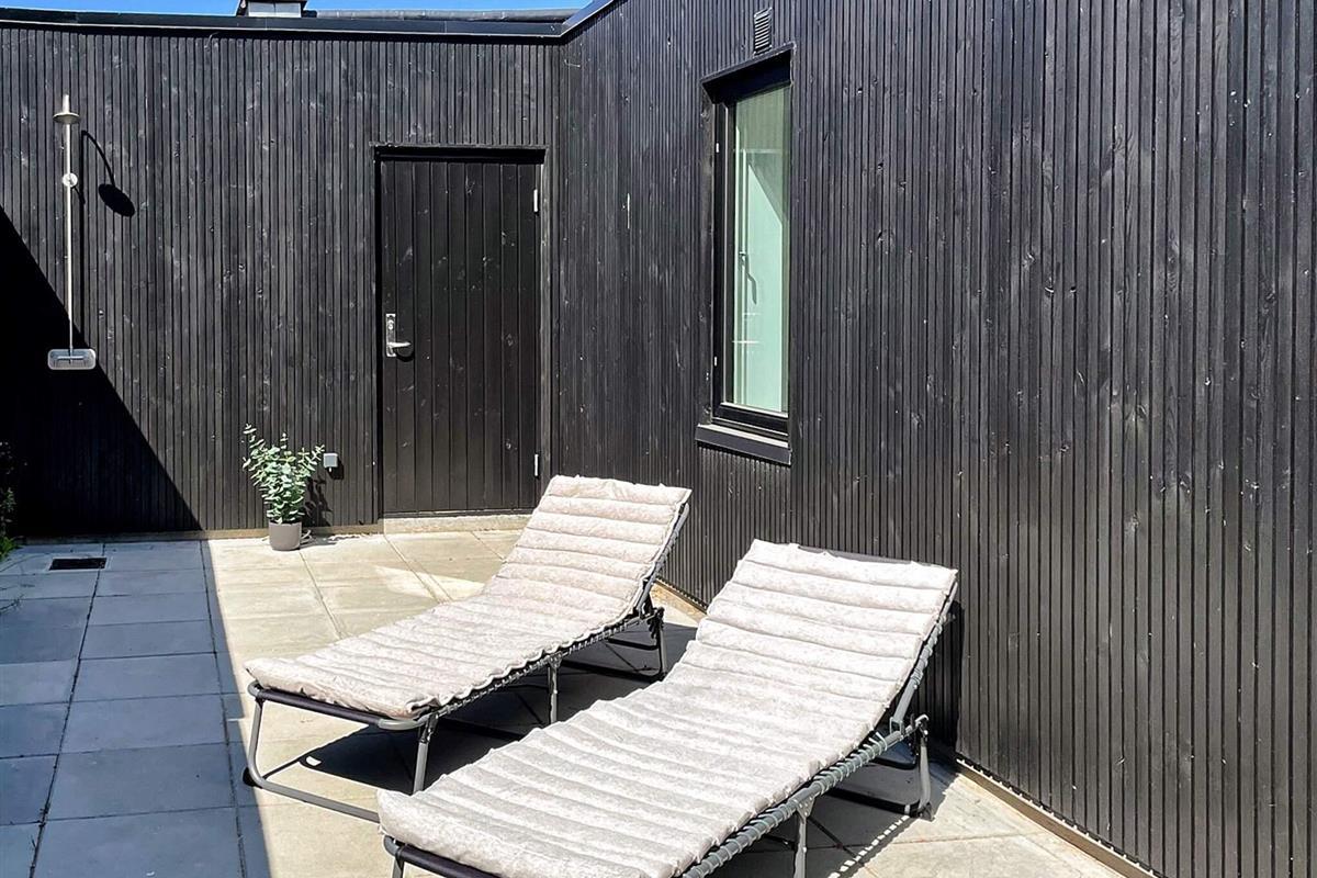Private Terrasse mit Gartenmöbeln, auf der Kinder sicher spielen können, sowie eine beheizte Außendusche zum Abduschen nach dem Strandbesuch.