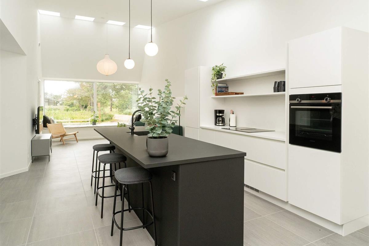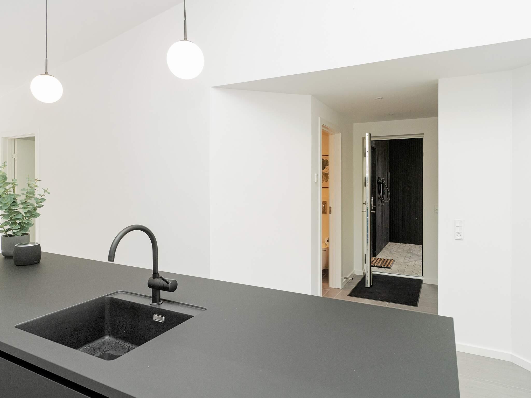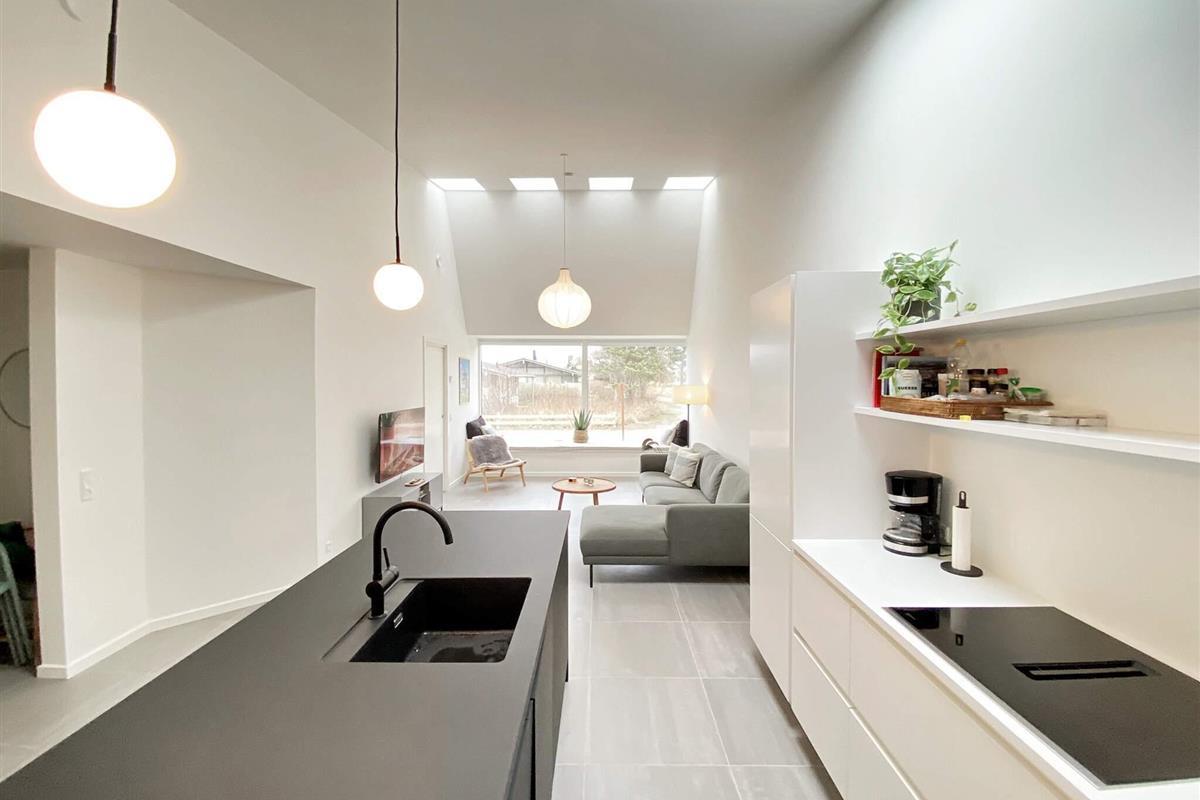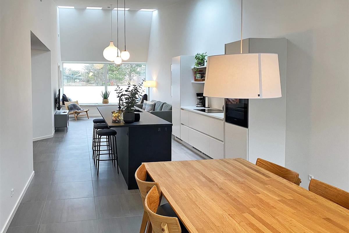 Hochwertige Materialien und geschmackvolle Einrichtungslösungen bieten einen offenen Küchen- und Wohnbereich mit hohen Decken, Kochinsel, Geschirrspüler, Induktionskochfeld mit integriertem Dunstabzug, Backofen sowie Kühl-/Gefrierkombination. Dachfenster sorgen für viel Tageslicht. In allen Räumen gibt es Fußbodenheizung. Zwei Schlafzimmer bieten Schlafplätze für 4 Personen, dazu zwei Badezimmer mit Duschkabine und Fußbodenheizung. Im Hauswirtschaftsraum befindet sich eine kombinierte Waschmaschine mit Trockner.