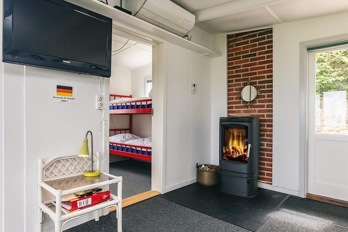 Im Haus helle Küche (mit eingeschränkter Deckenhöhe) sowie geräumiger Wohnbereich mit teils herrlichem Meerblick, mehreren Sitzgelegenheiten, zwei Schlafplätzen und Holzofen für kühlere Abende. In einer abgeschirmten Ecke des Raumes befindet sich auch das halboffene Schlafzimmer mit Doppelbett (siehe Foto). Außerdem Kinderzimmer mit Etagenbett und Falttür im Haus. Das Badezimmer mit Dusche/WC und Sauna ist in einem separaten Gebäude einige Meter entfernt untergebracht.