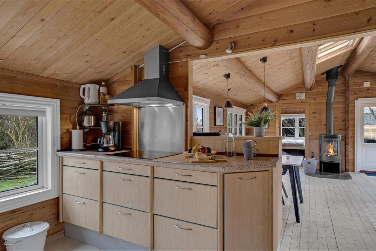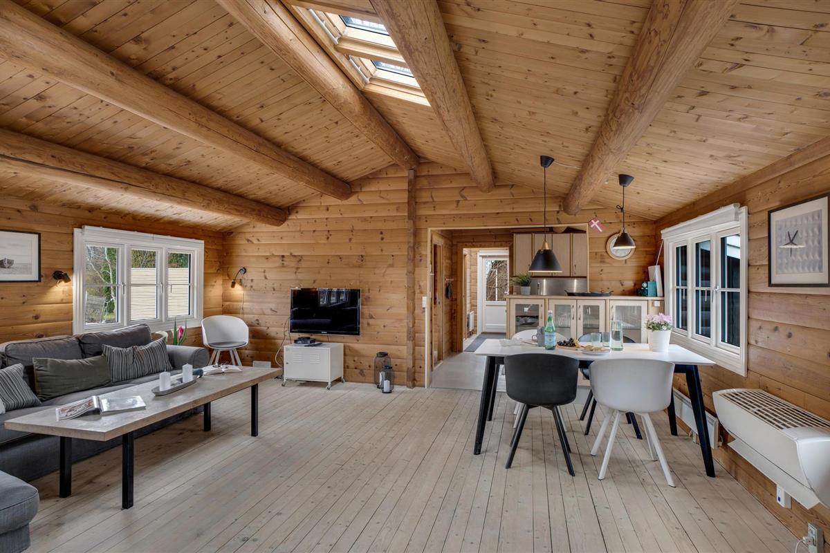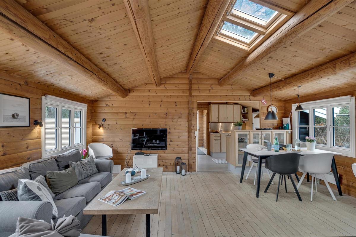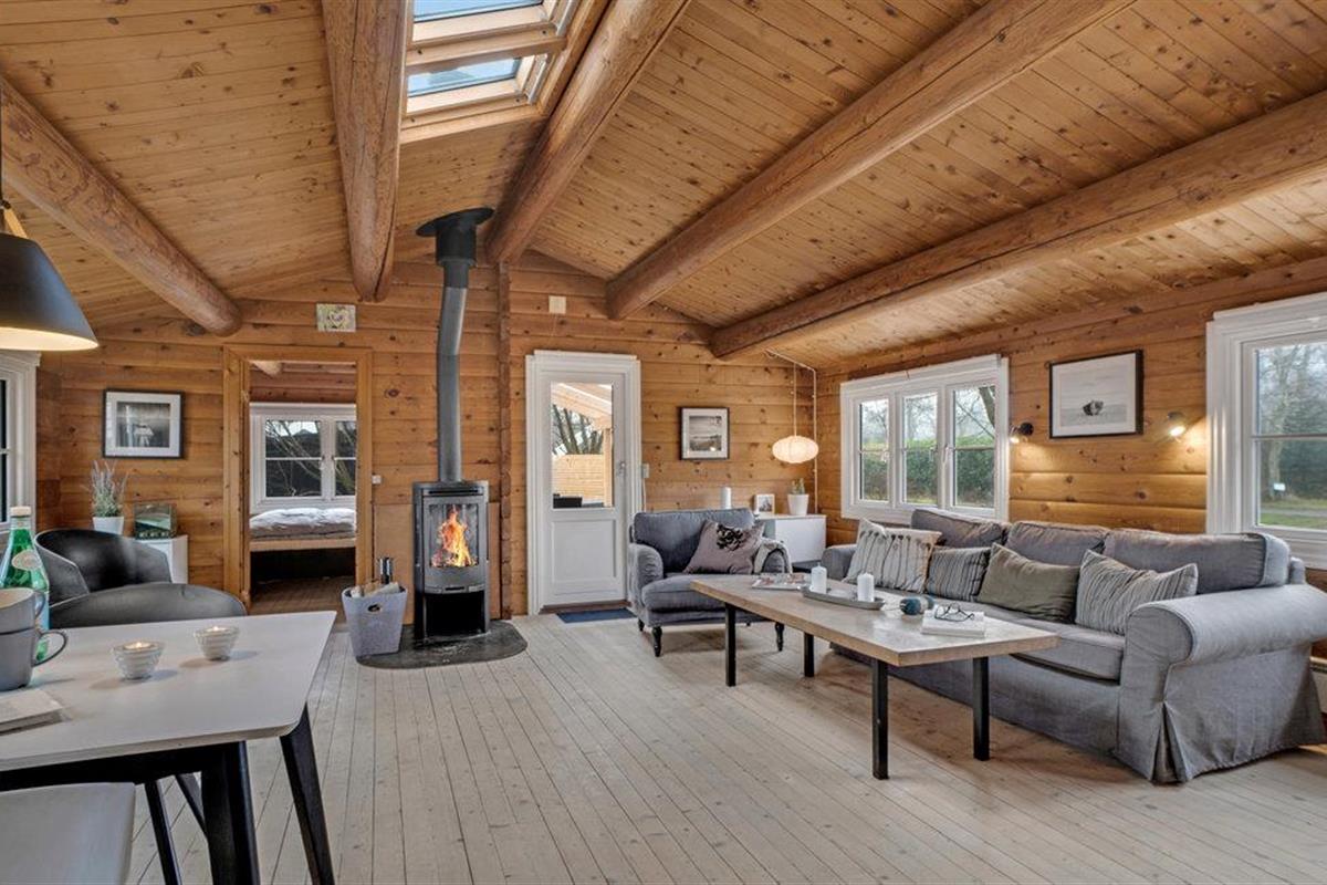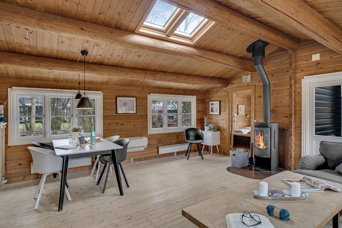 Stap binnen en ontspan in de ruime woonkamer met houten muren en zichtbare balken die een warme sfeer creëren. Maak het jezelf gemakkelijk op de gezellige banken, geniet van de houtkachel op koelere dagen of breng de avonden samen door voor de tv. Gebruik de aangrenzende eethoek met lichtgekleurde meubels voor gezellige maaltijden. De mooie, open keuken nodigt het hele gezin uit om samen te koken.