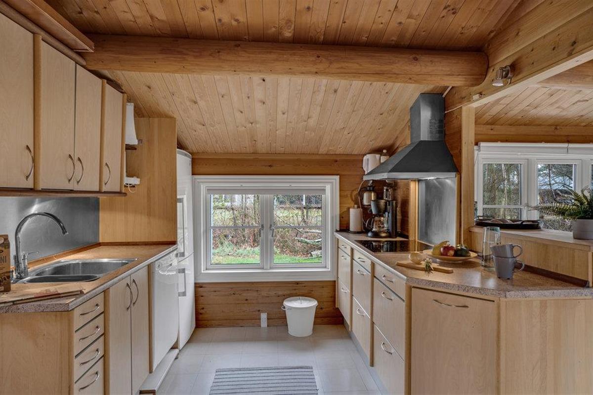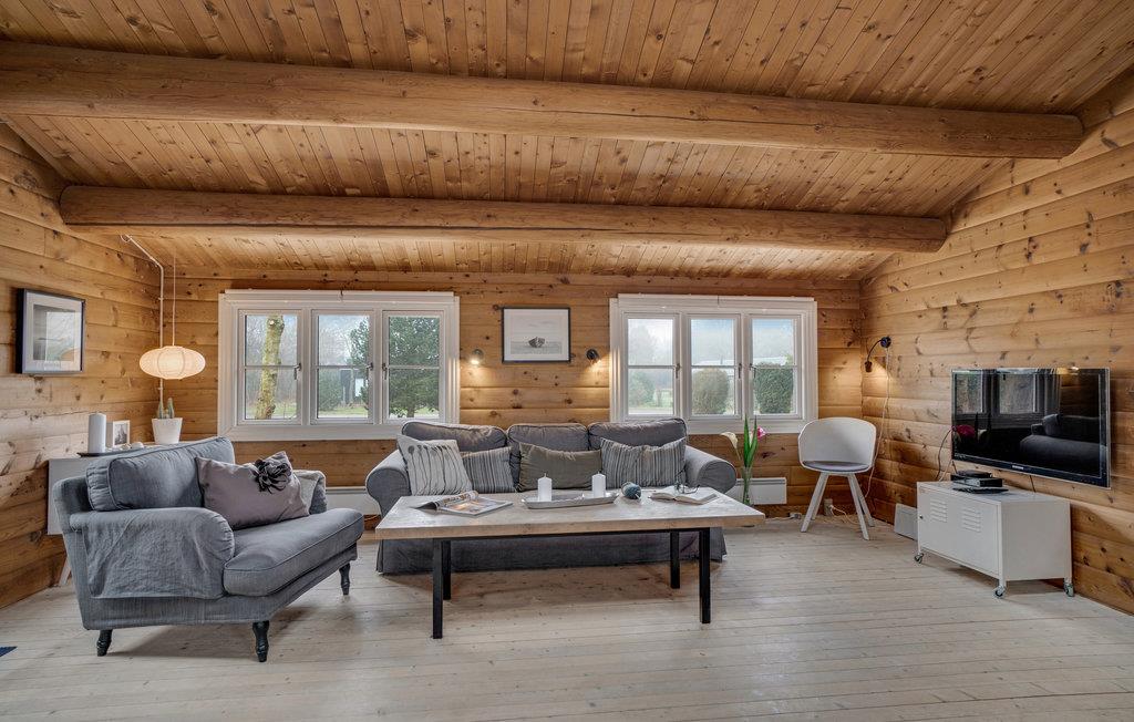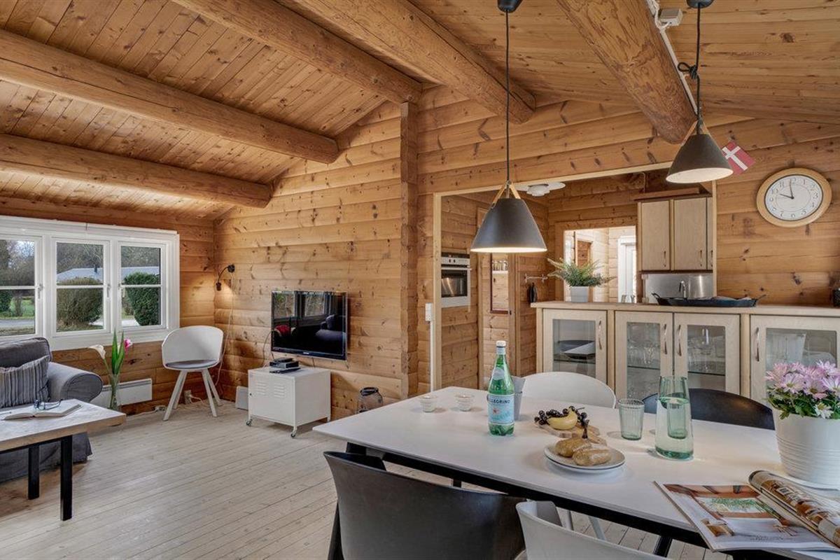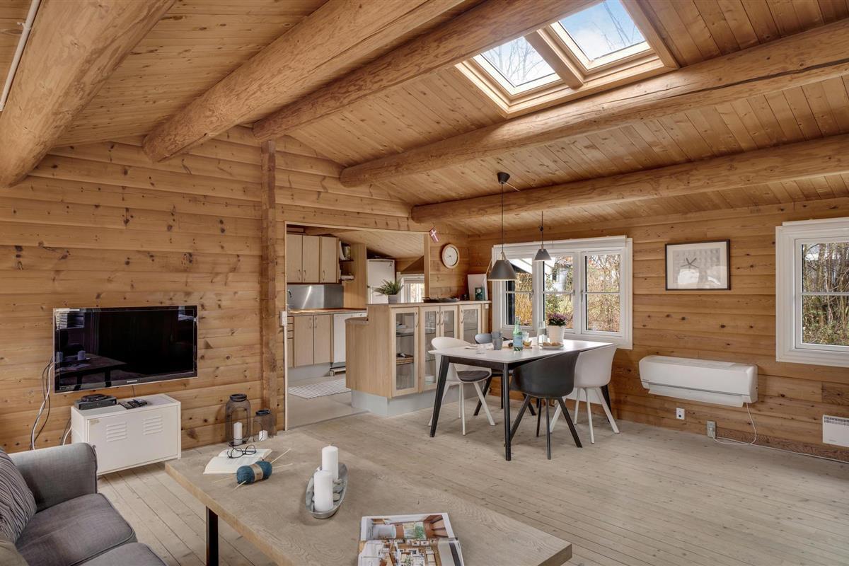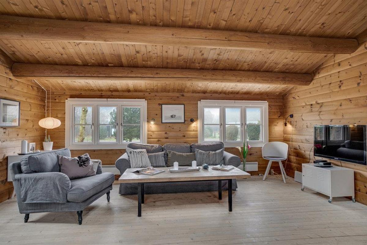 Stap binnen en ontspan in de ruime woonkamer met houten muren en zichtbare balken die een warme sfeer creëren. Maak het jezelf gemakkelijk op de gezellige banken, geniet van de houtkachel op koelere dagen of breng de avonden samen door voor de tv. Gebruik de aangrenzende eethoek met lichtgekleurde meubels voor gezellige maaltijden. De mooie, open keuken nodigt het hele gezin uit om samen te koken.
