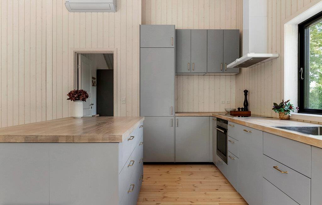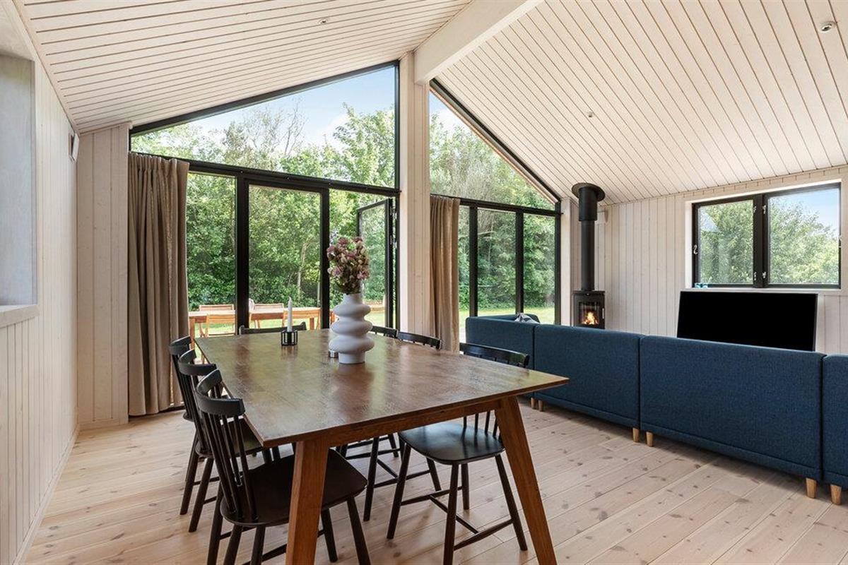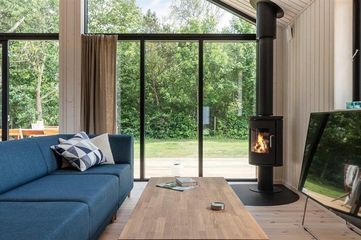 Je vakantiehuis biedt je de ideale omgeving voor een ontspannen tijd aan de kust. De rustige omgeving en stijlvolle ambiance creëren een aangename sfeer voor gezinnen die natuur en comfort even belangrijk vinden. De ruime woonkamer met hoge plafonds en panoramische ramen opent naar het terras en biedt een onbelemmerd uitzicht op het platteland. Ontspan op de grote bank of lees een boek bij de houtkachel. Het gecombineerde eet- en woongedeelte nodigt uit tot gezellig samenzijn in de avonduren. In de open keuken met kookeiland en moderne apparatuur kun je samen je favoriete gerechten bereiden en genieten van het uitzicht op het groen door de grote ramen.