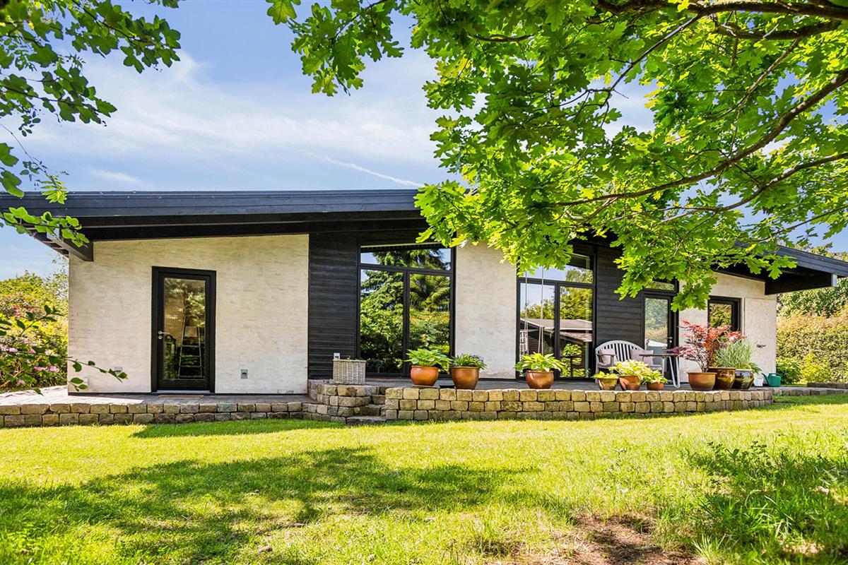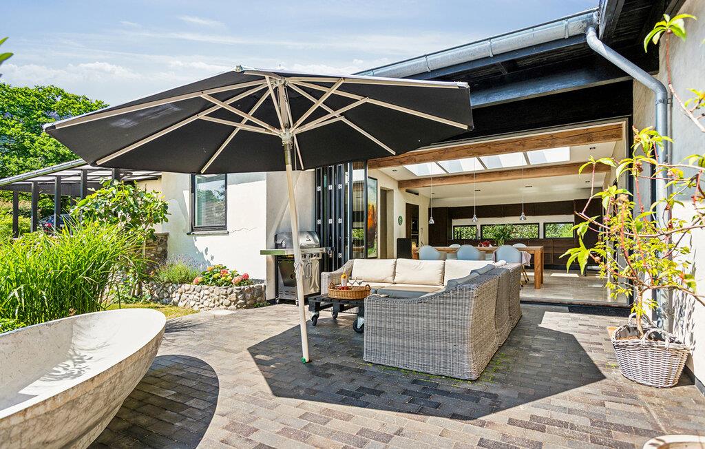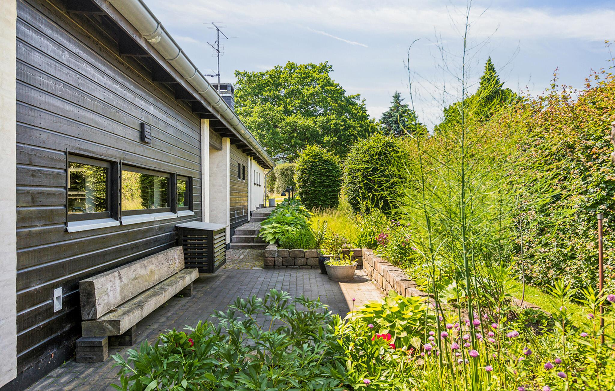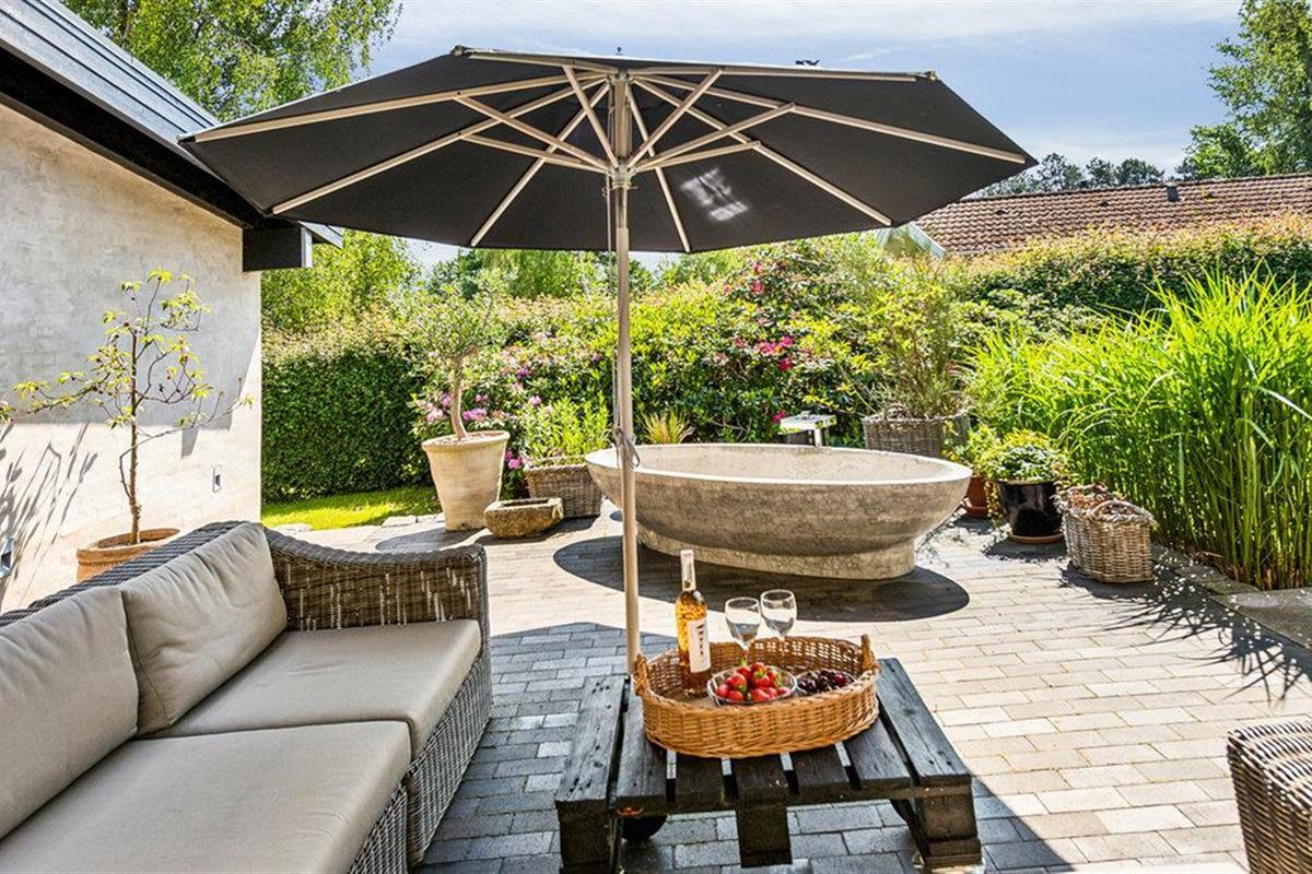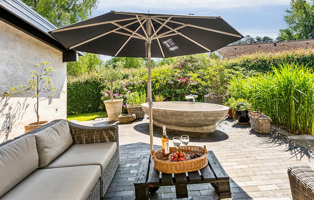 Geniet van een comfortabel vakantiehuis nabij het strand met tuin, open haard en buitenbad in Gilleleje.
