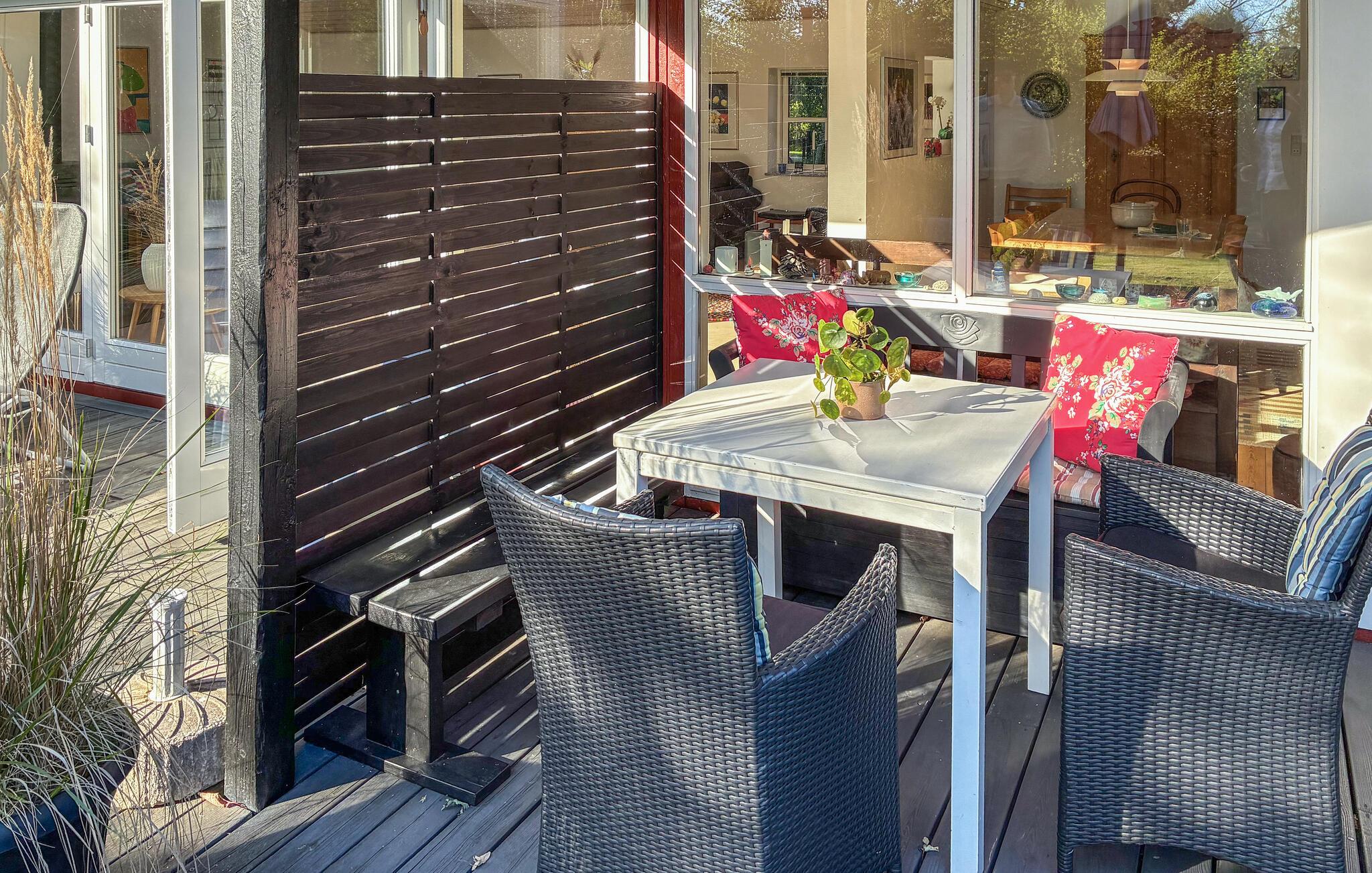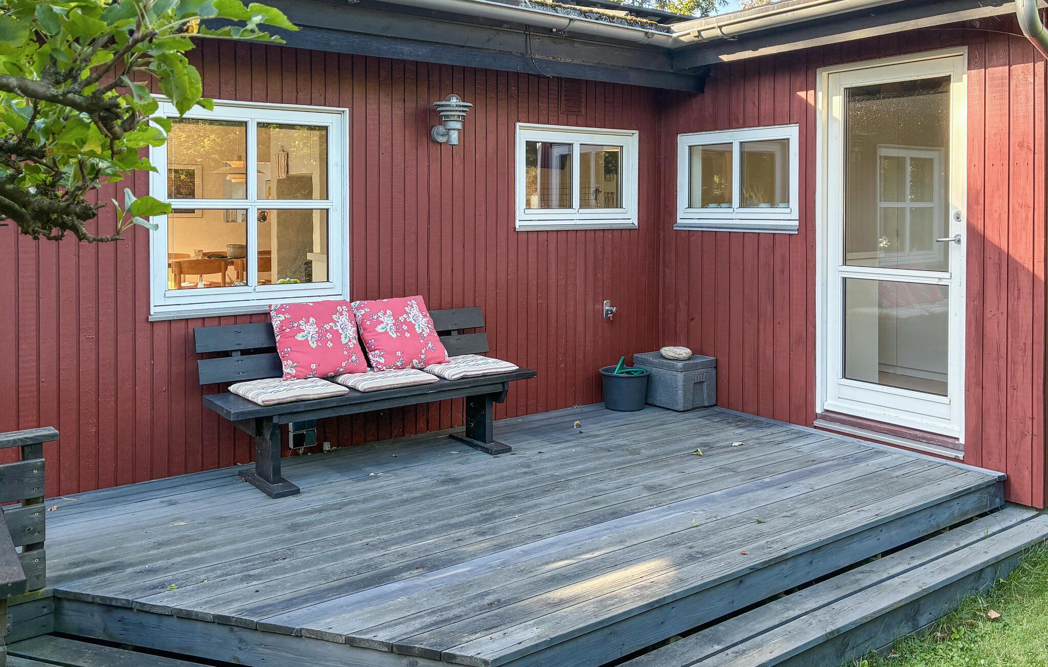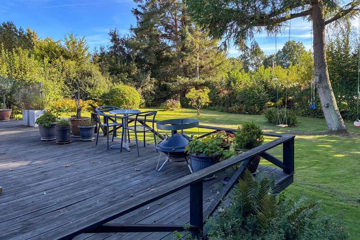 Buiten nodigt het ruime houten terras je uit om te vertoeven. Ontbijt in de frisse lucht, barbecue 's avonds en geniet van het uitzicht op de goed onderhouden, groene tuin. Je vindt er schaduwrijke plekjes onder de bomen, terwijl kinderen kunnen spelen of schommelen op het gazon. Een zwemsteiger wacht op je op het nabijgelegen strand voor verfrissende zomermomenten.