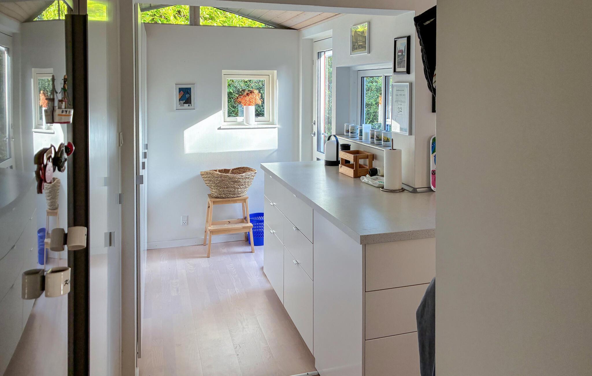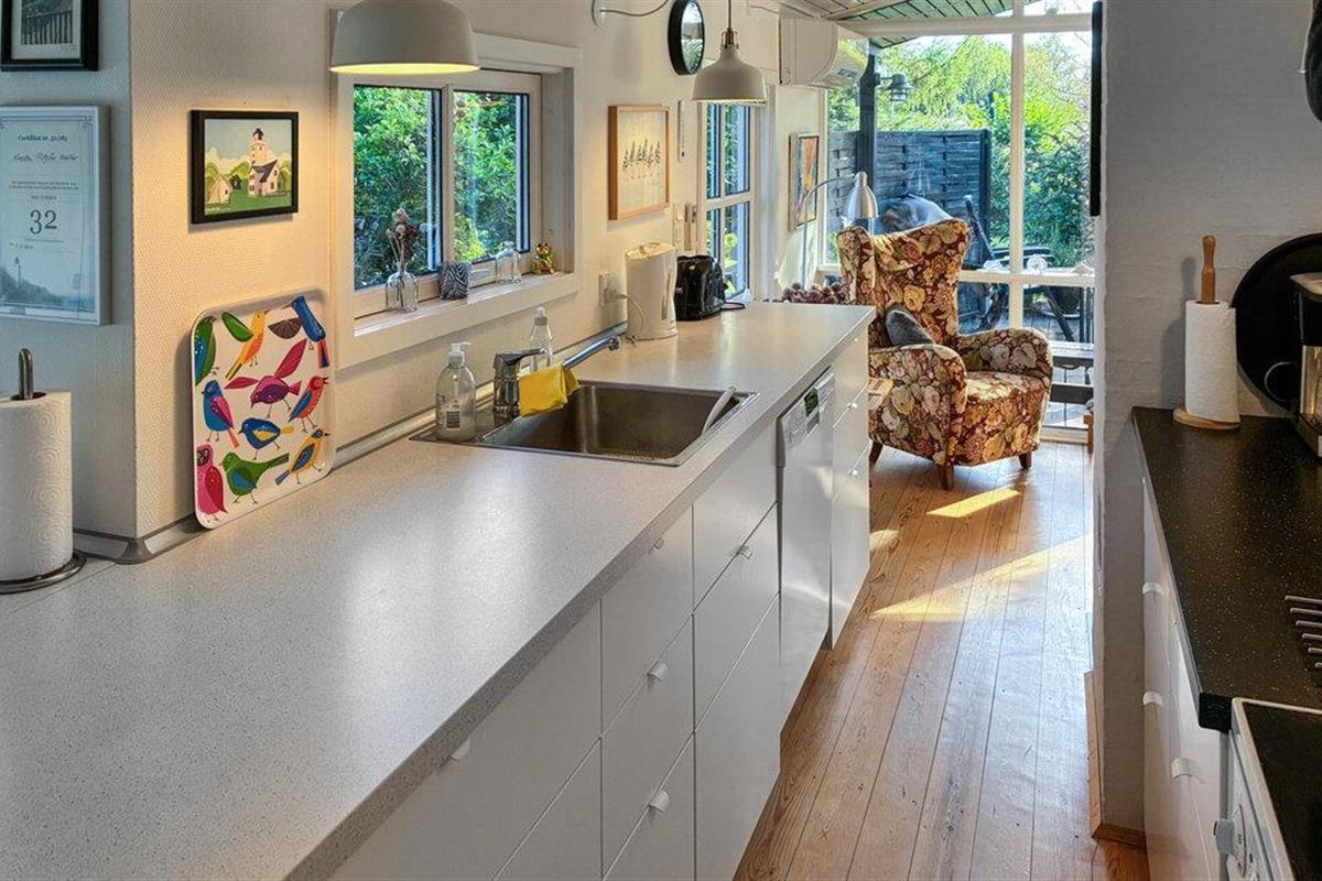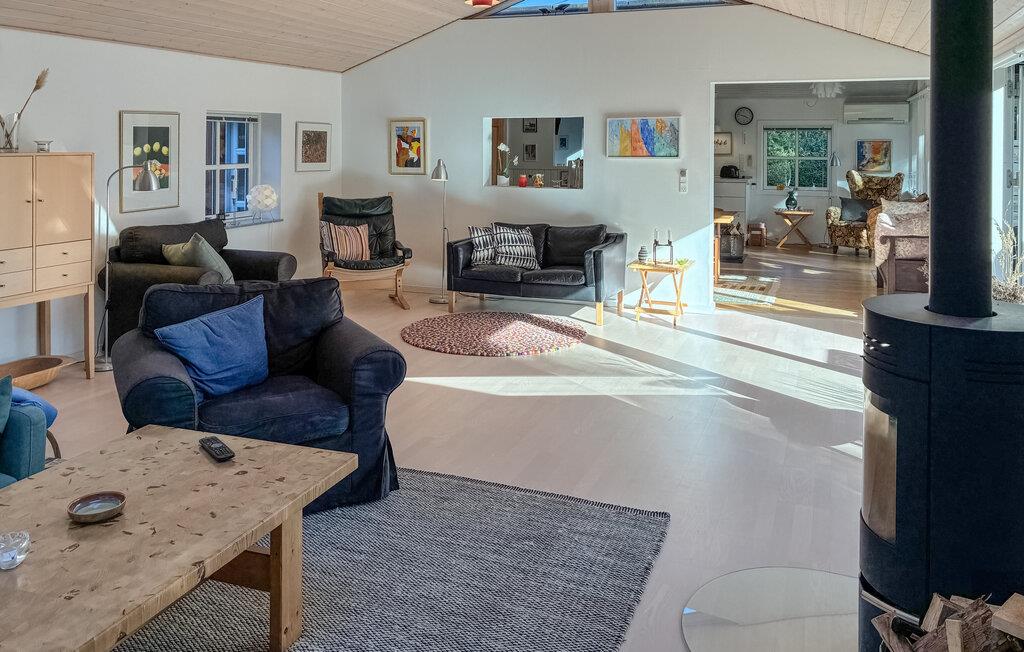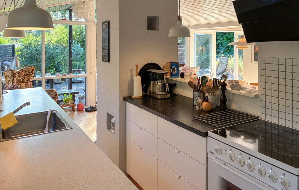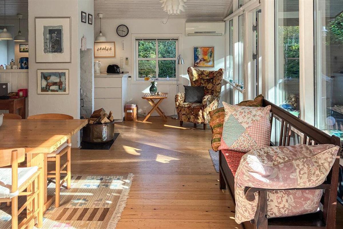 Verheug je op een verblijf in je vakantiehuis, dat Scandinavisch design combineert met huiselijke gezelligheid. Binnen vind je een smaakvol interieur met veel licht, warme kleuren en mooie meubels. Maak het jezelf gemakkelijk op de banken in de grote woonkamer, terwijl de open haard voor gezellige warmte zorgt op kille avonden. De grote ramen bieden uitzicht op de tuin en creëren een gevoel van ruimte. In de open keuken vind je alles wat je nodig hebt om samen maaltijden te bereiden. Geniet ervan aan de eettafel met directe toegang tot het terras.