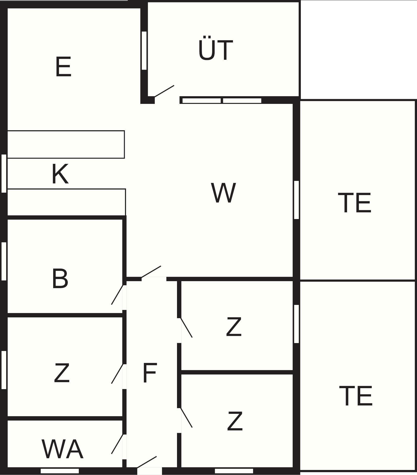 Küche: E-Herd, Kühlschr. m. Gefrierfach, Mikrow., Abzugsh., Kaffeem., Waschm, Trockner
