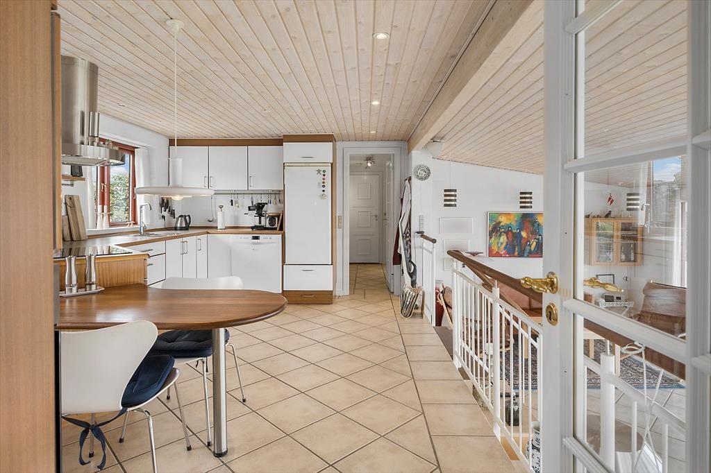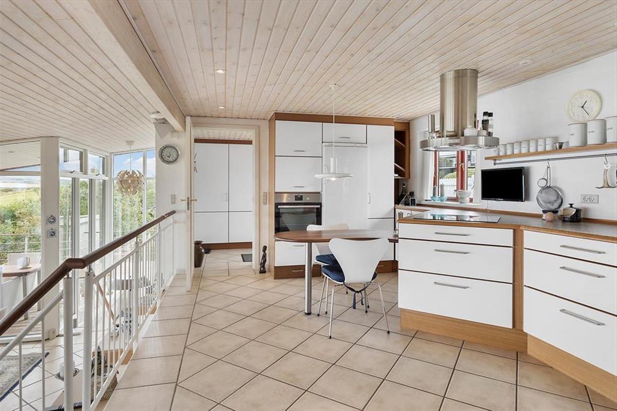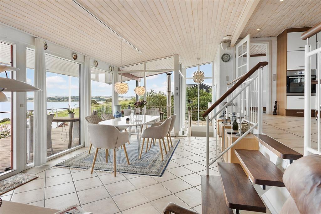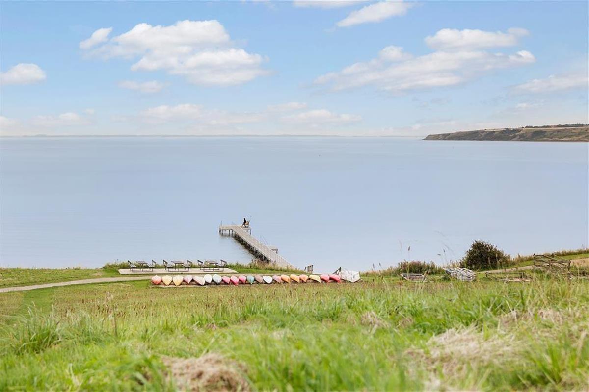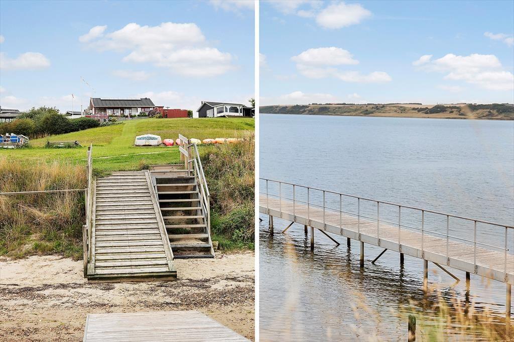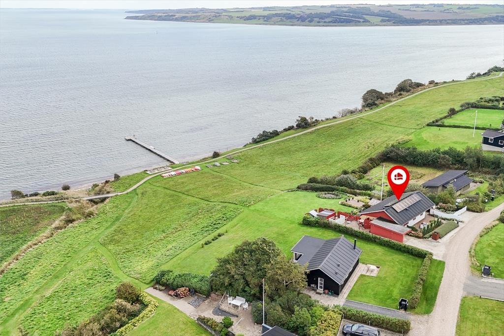 It almost feels as though the Limfjord flows right into the living room – that’s how close you are to the water in this charming holiday home near Gjellerodde. Large windows draw the light and the view deep into the living space, where the open-plan layout creates a natural connection between the kitchen and living area. The split-level design adds an architectural twist that makes the rooms feel vibrant and full of character. Whether you’re enjoying breakfast together, relaxing with a good book on the sofa, or simply soaking up the peace and quiet, the stunning fjord view is a constant companion. This is holiday ambience at its finest – focused on presence, scenic beauty and relaxation in delightful surroundings.