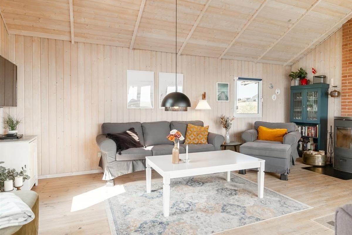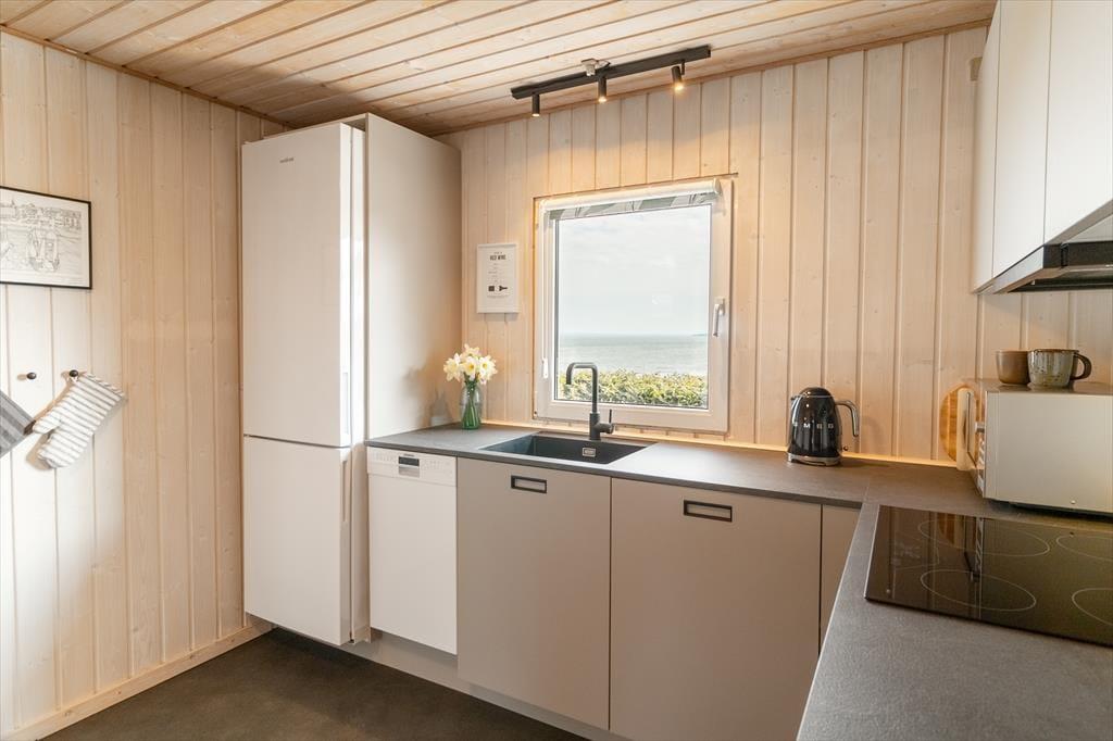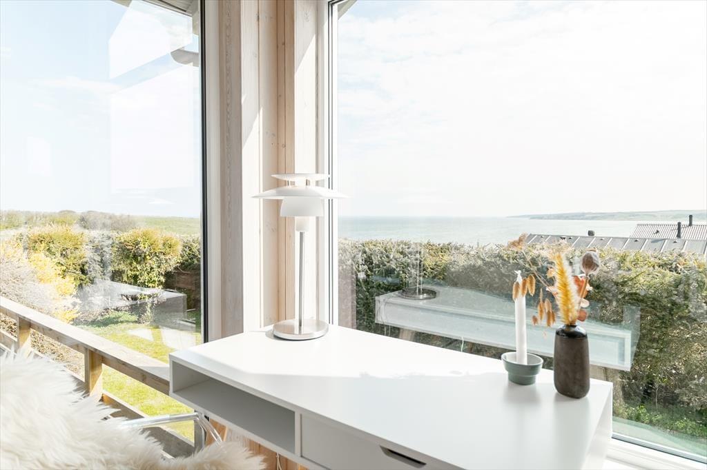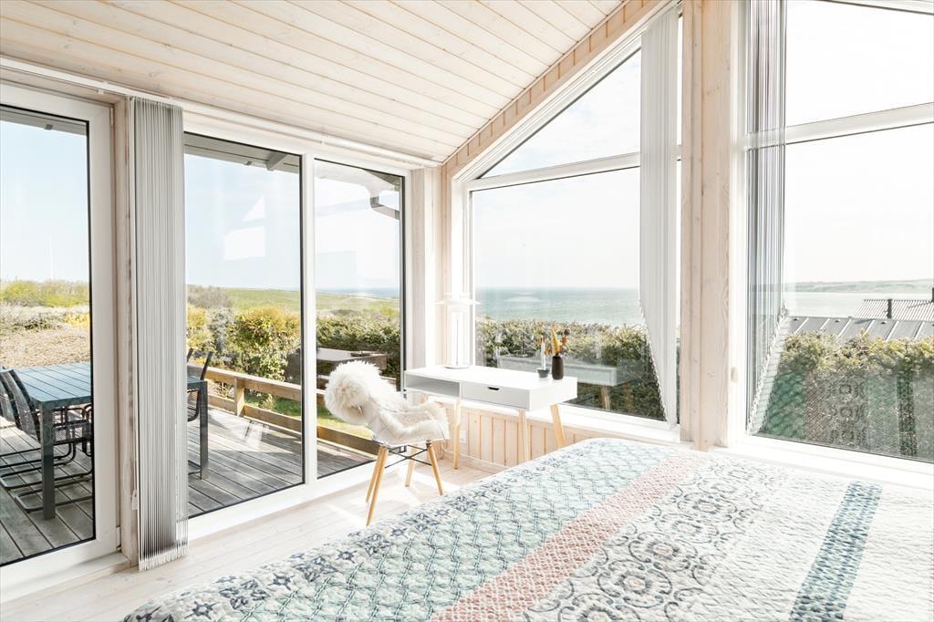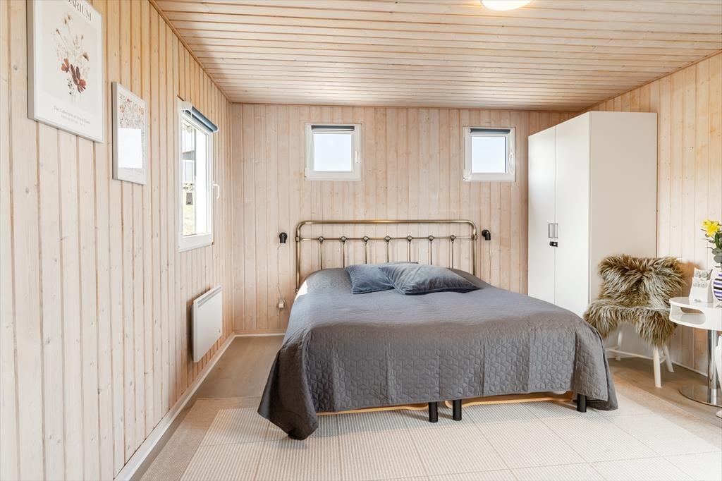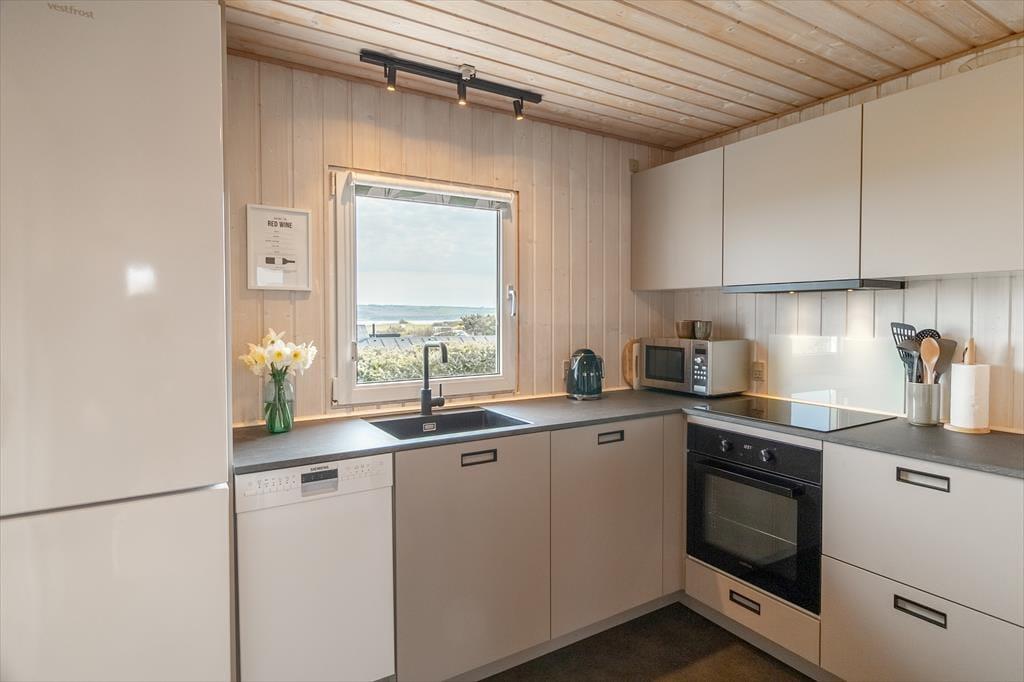 As you step into the architect-designed holiday home, the first things you notice are the light – and the silence. The house has been carefully renovated with respect for the original architecture and exudes consistent quality. Large panoramic windows face the Limfjord, allowing both daylight and the captivating landscape to fill the living room. It’s clear that every detail has been considered: From the open and inviting living area, where the wood-burning stove crackles warmly on cool evenings, to the two bedrooms and the charming annex – all with double beds and a sense of privacy and comfort. In the master bedroom, you’re treated to a breathtaking view – the perfect place to wake slowly and let your eyes rest on the shimmering surface of the fjord. The brand-new kitchen is openly connected to the living room, creating a natural setting for togetherness, cooking, and board games, while the heat pump ensures the perfect temperature at all times. The bathroom includes everything you need, including a convenient washer-dryer combo – making everyday life easy, even on holiday.