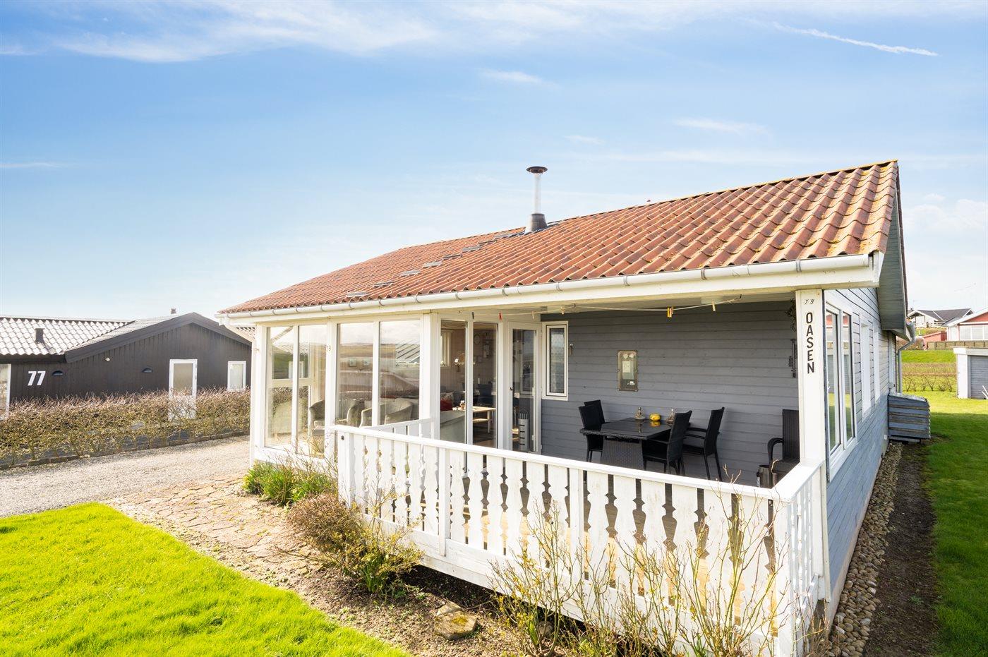 De vakantiewoning is gelegen op een 800 m² groot natuural grond. Afstand tot de fjord 100 m. Dichtstbijzijnde winkel 500 m. Er is een golfbaan op een afstand van 1000 m. Bij de vakantiewoning hoort terras. Daarnaast is er een overdekt terras. Parkeerplaats bij het huis.