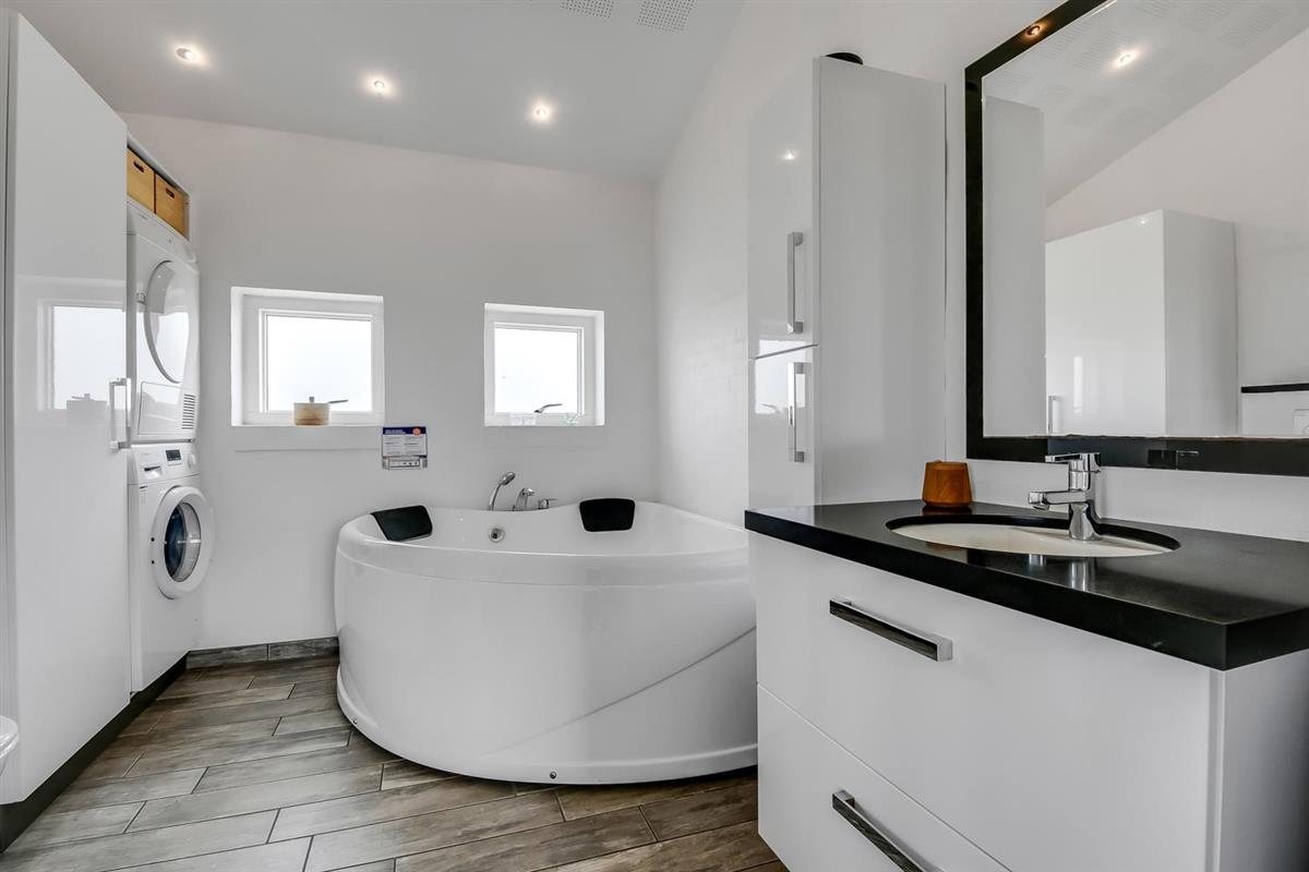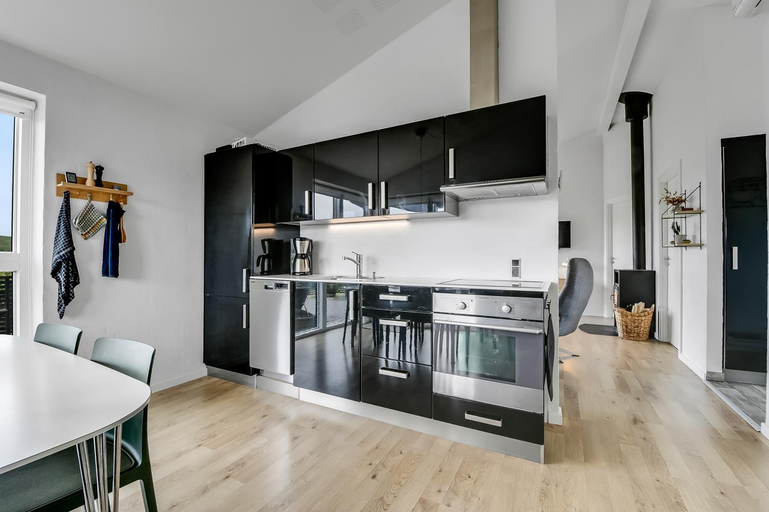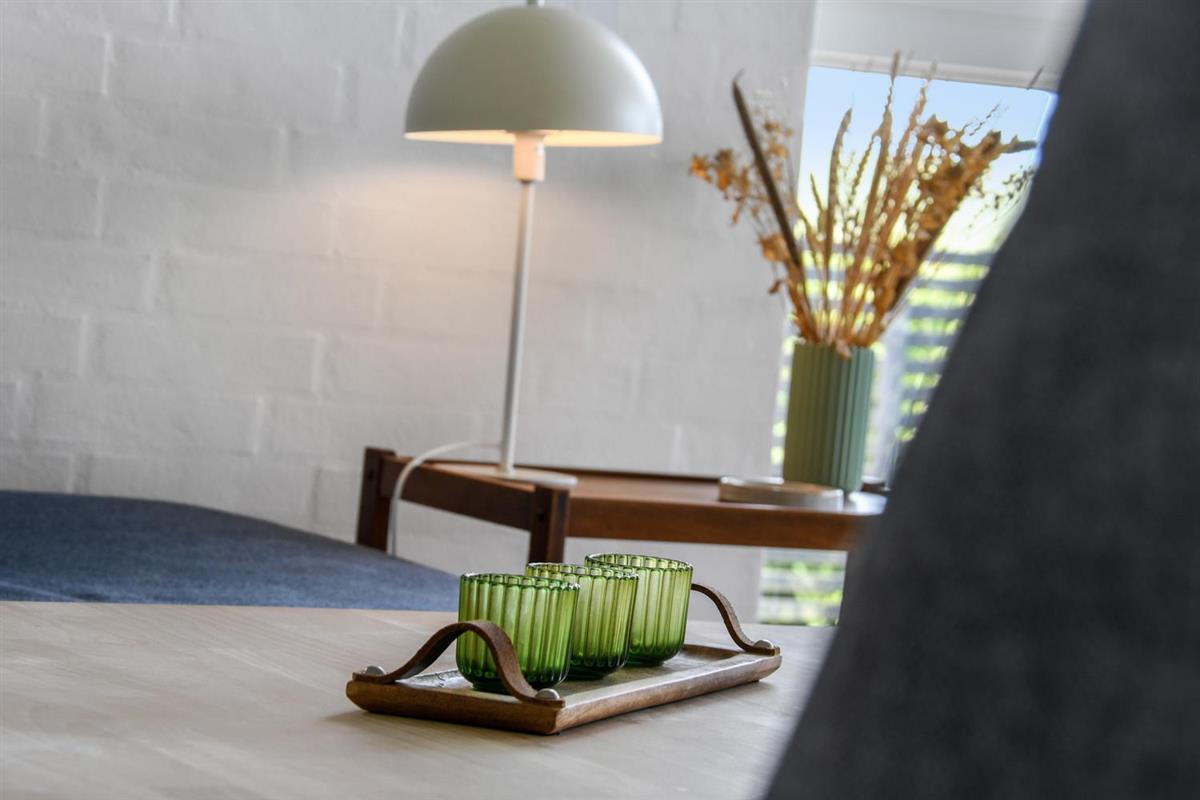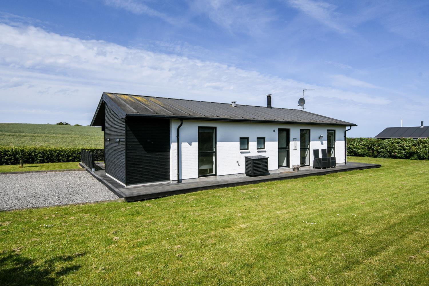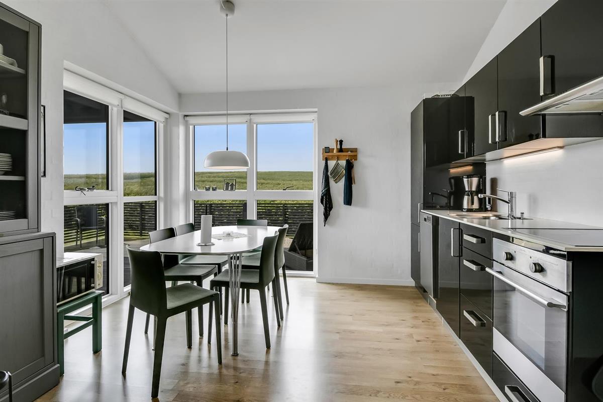 Schon wenn Sie auf das Haus zufahren, können Sie sehen, dass es ein sehr gepflegtes Ferienhaus ist. Es gibt einen kombinierten Wohnraum und Küche; die Küche ist mit einer Wand vom Wohnraum getrennt und bei der Küche steht auch der Esstisch. Schöner heller Wohnraum mit guten Ledermöbeln und Holzboden; hier gibt es TV mit dänischen und deutschen Programmen und einen DVD-Player, außerdem gibt es einen Brennofen, der zusammen mit der Wärmepumpe für eine gute Wärme sorgt, auch an den kalten Tagen; beide helfen dabei, die Nebenkosten-Rechnung niedriger zu machen. Die Küche ist gut ausgestattet und hat Herd mit Cerankochfeld, Abzugshaube, eingebauten Ofen, Geschirrspüler, Mikrowelle und einen Gefrier-/Kühlschrank - hier gibt es auch einen Holzboden -. Das Badezimmer ist mit Toilette, Dusche, Waschbecken, Whirlpool, Waschmaschine und Trockner ausgestattet. Drei gute Schlafräume: 1DB + 1DB + 1DB Schlafcouch. Für die kleinsten Gäste gibt es ein Kinderbett. Ein sehr modernes und einladendes Ferienhaus. Nichtraucher-Haus. 1 Haustiere erlaubt.