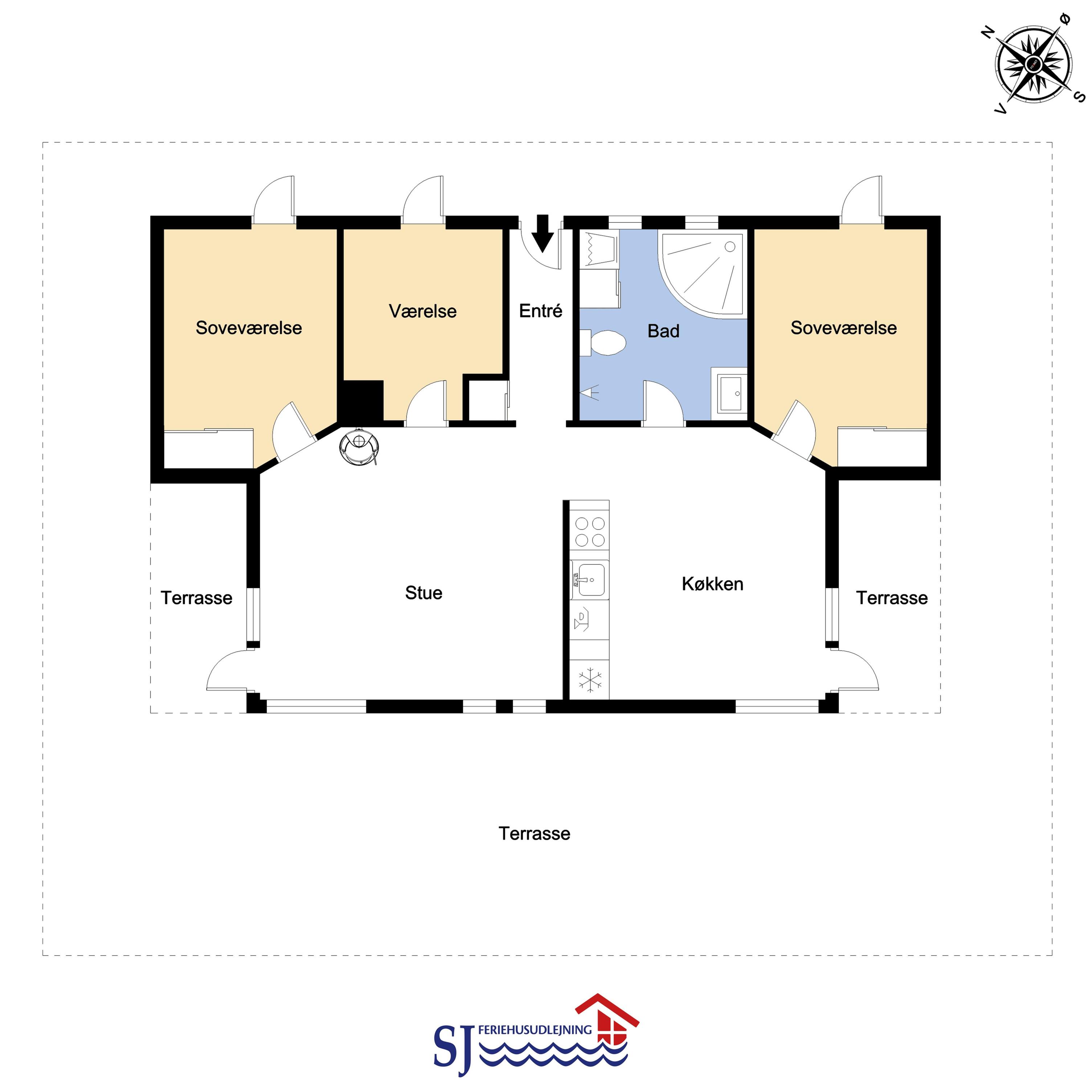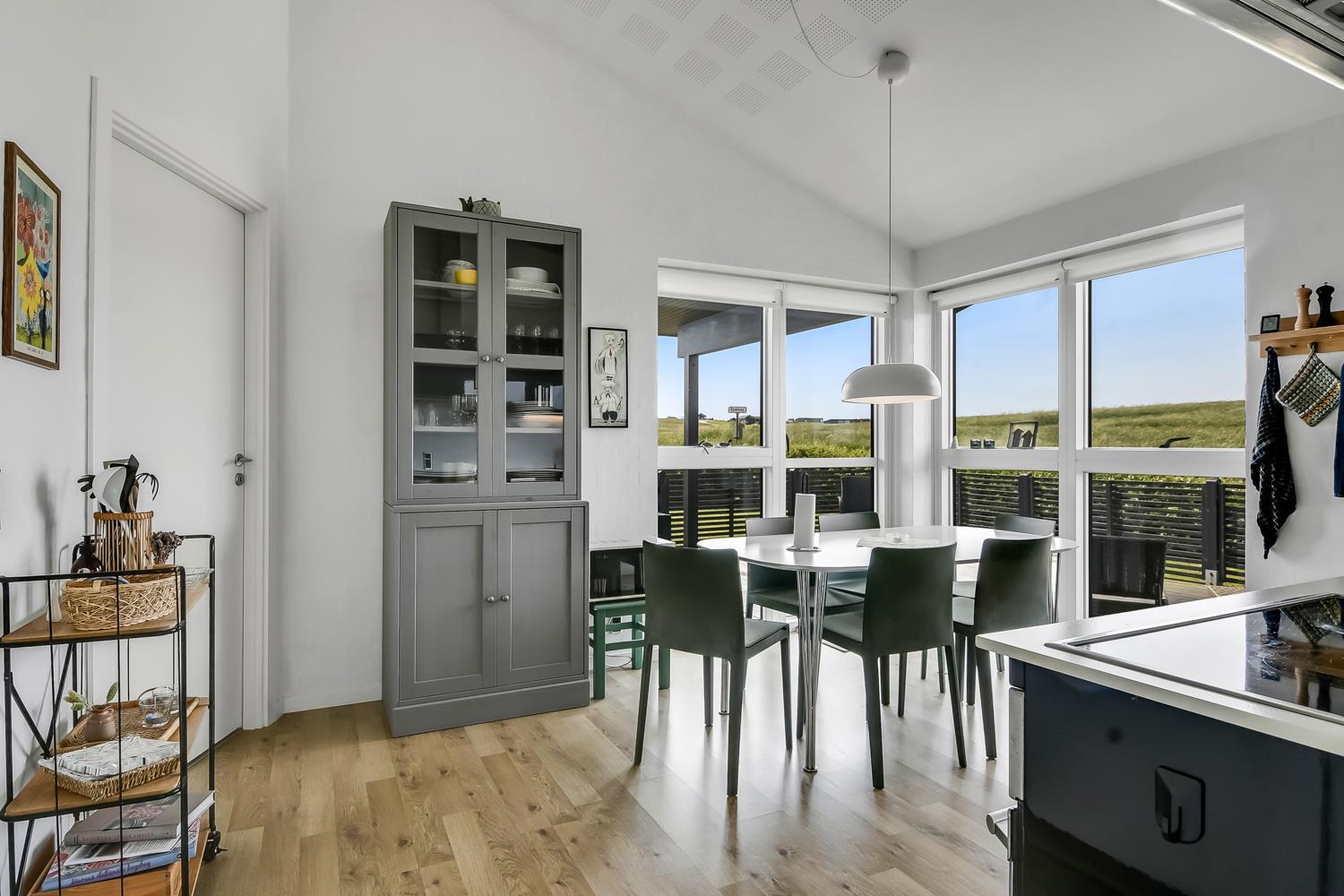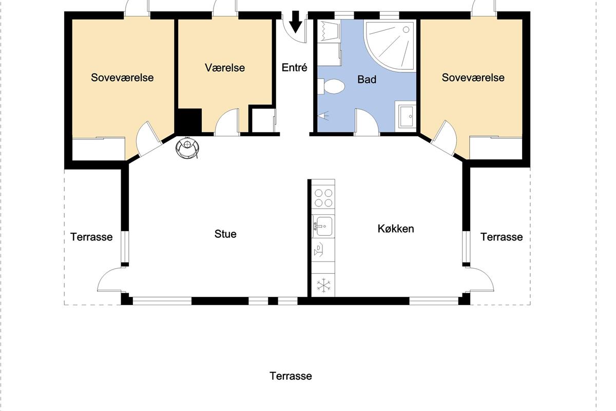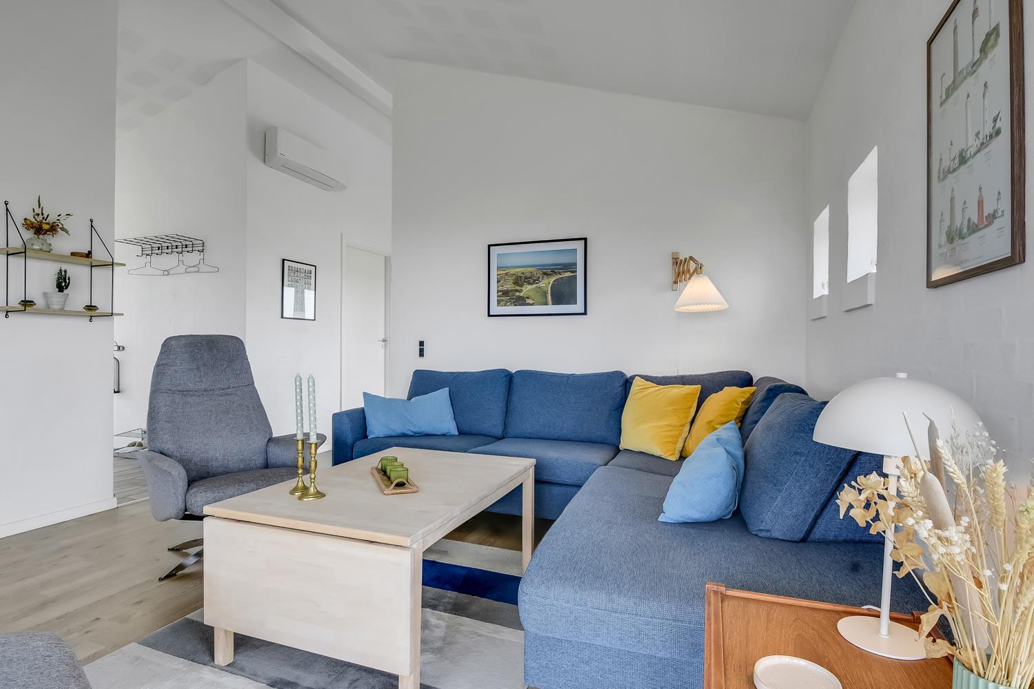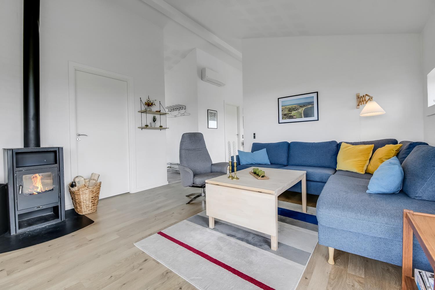 Schon wenn Sie auf das Haus zufahren, können Sie sehen, dass es ein sehr gepflegtes Ferienhaus ist. Es gibt einen kombinierten Wohnraum und Küche; die Küche ist mit einer Wand vom Wohnraum getrennt und bei der Küche steht auch der Esstisch. Schöner heller Wohnraum mit guten Ledermöbeln und Holzboden; hier gibt es TV mit dänischen und deutschen Programmen und einen DVD-Player, außerdem gibt es einen Brennofen, der zusammen mit der Wärmepumpe für eine gute Wärme sorgt, auch an den kalten Tagen; beide helfen dabei, die Nebenkosten-Rechnung niedriger zu machen. Die Küche ist gut ausgestattet und hat Herd mit Cerankochfeld, Abzugshaube, eingebauten Ofen, Geschirrspüler, Mikrowelle und einen Gefrier-/Kühlschrank - hier gibt es auch einen Holzboden -. Das Badezimmer ist mit Toilette, Dusche, Waschbecken, Whirlpool, Waschmaschine und Trockner ausgestattet. Drei gute Schlafräume: 1DB + 1DB + 1DB Schlafcouch. Für die kleinsten Gäste gibt es ein Kinderbett. Ein sehr modernes und einladendes Ferienhaus. Nichtraucher-Haus. 1 Haustiere erlaubt.