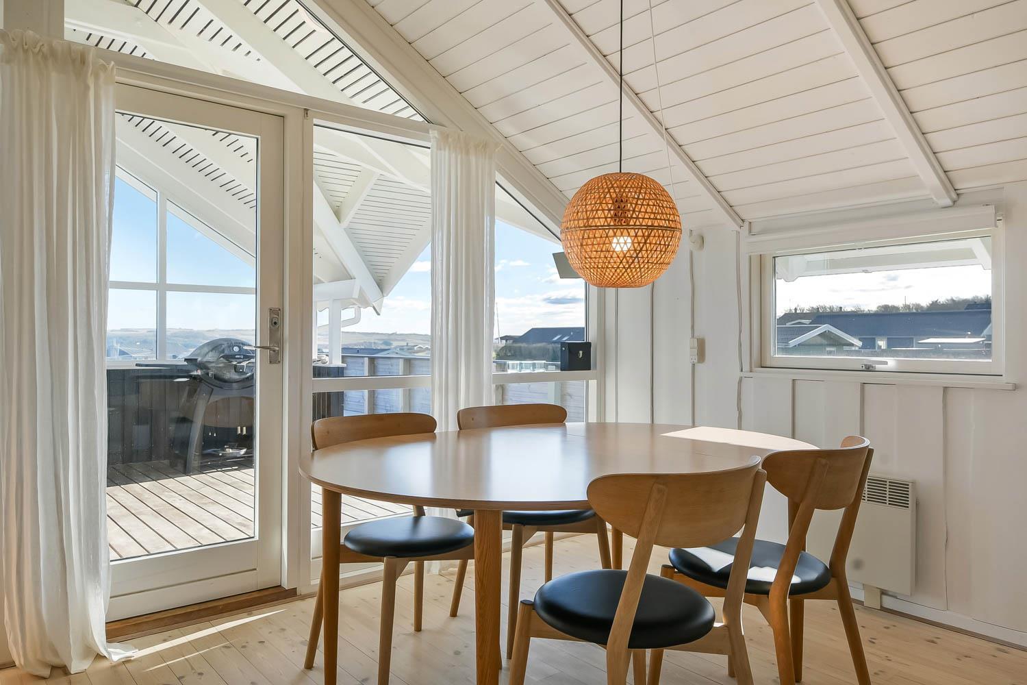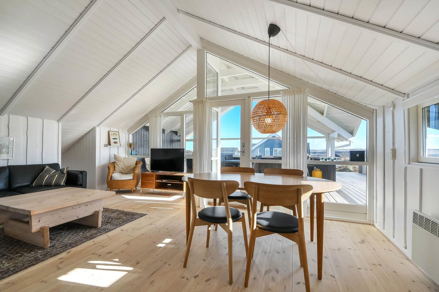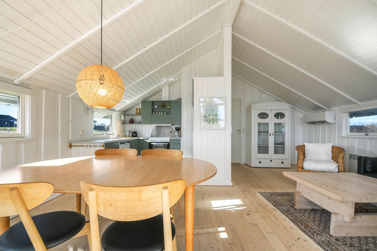 Ferienhaus auf etwa 72 m2 im Jahr 1998 erbaut und teilweise in 2022 renoviert. Kombinierter Wohn-/Essraum mit offenen Decken und grossen Fensterpartien mit schönem Blick zum Limfjord. Wohnraum mit gemütlicher Möblierung, Smart-TV mit dänischen und deutschen Programmen und der Möglichkeit für Streaming von TV / Radio / Apps über Chromcast, wofür Sie selber ein Abonnement haben. Dicht an der Küche steht der Esstisch. Die Küche ist mit E-Herd, Abzugshaube, Geschirrspüler und Kühlschrank mit Gefrierfach. Ausserdem gibt es 2 Schlafräume: 1DB + 1DB mit neuen Böden. Badezimmer: Toilette, Waschbecken, Dusche und Fliesenboden mit Fussbodenheizung. Rauchen ist nicht erlaubt. Max. 2 Haustiere sind erlaubt.