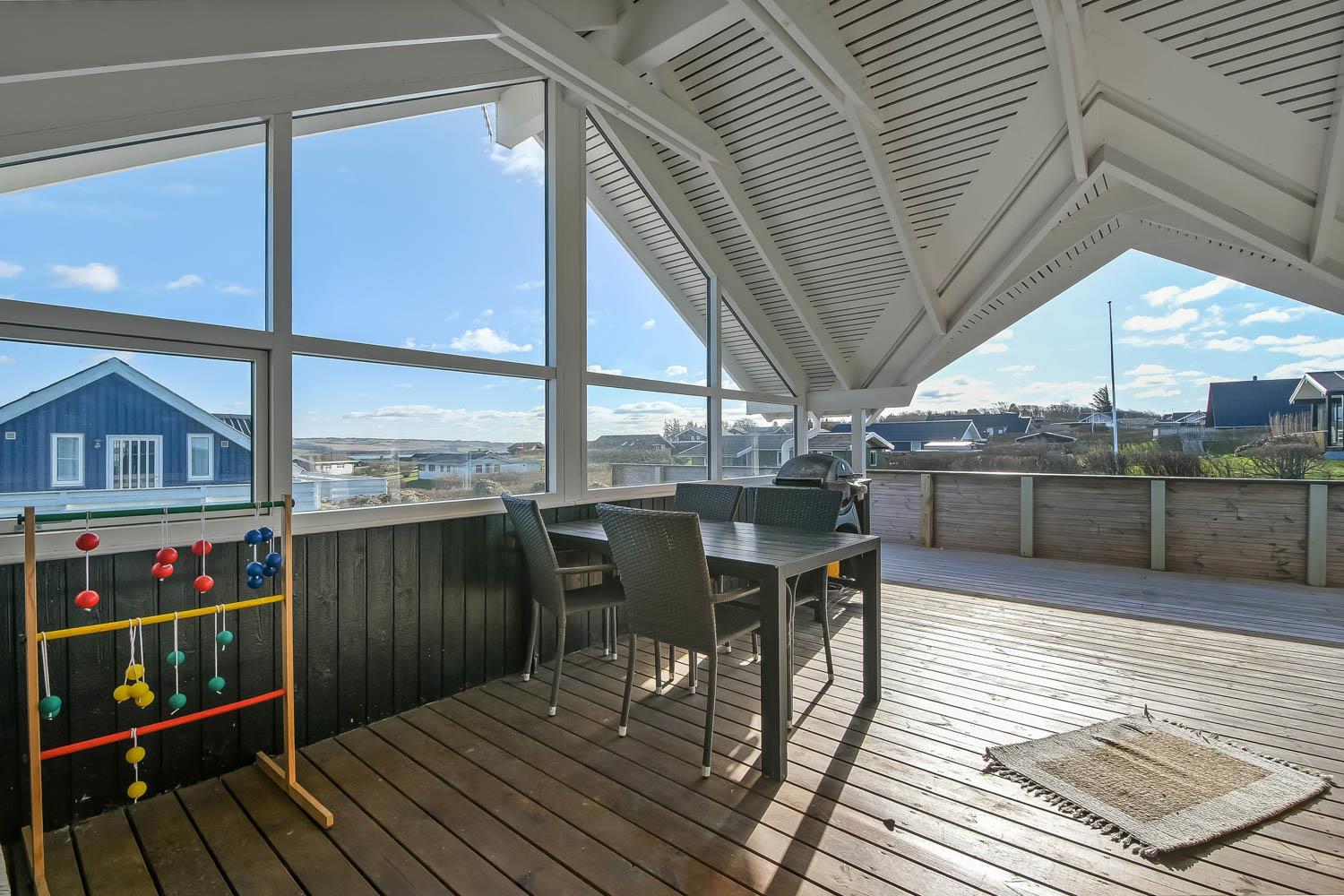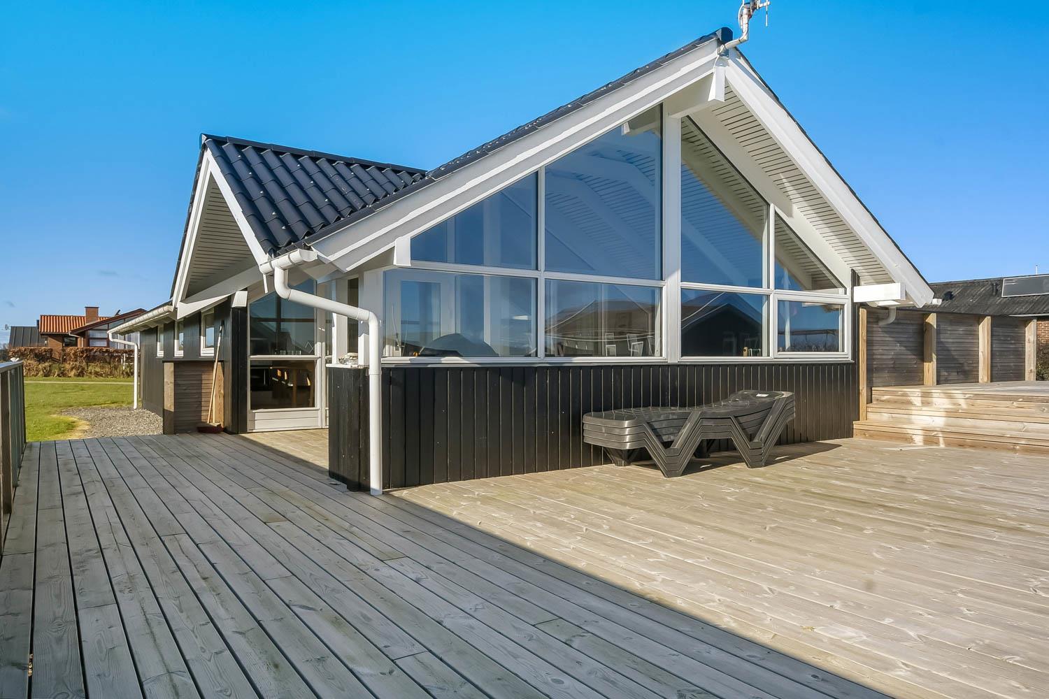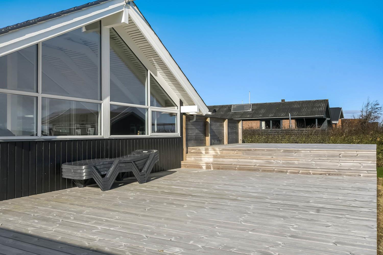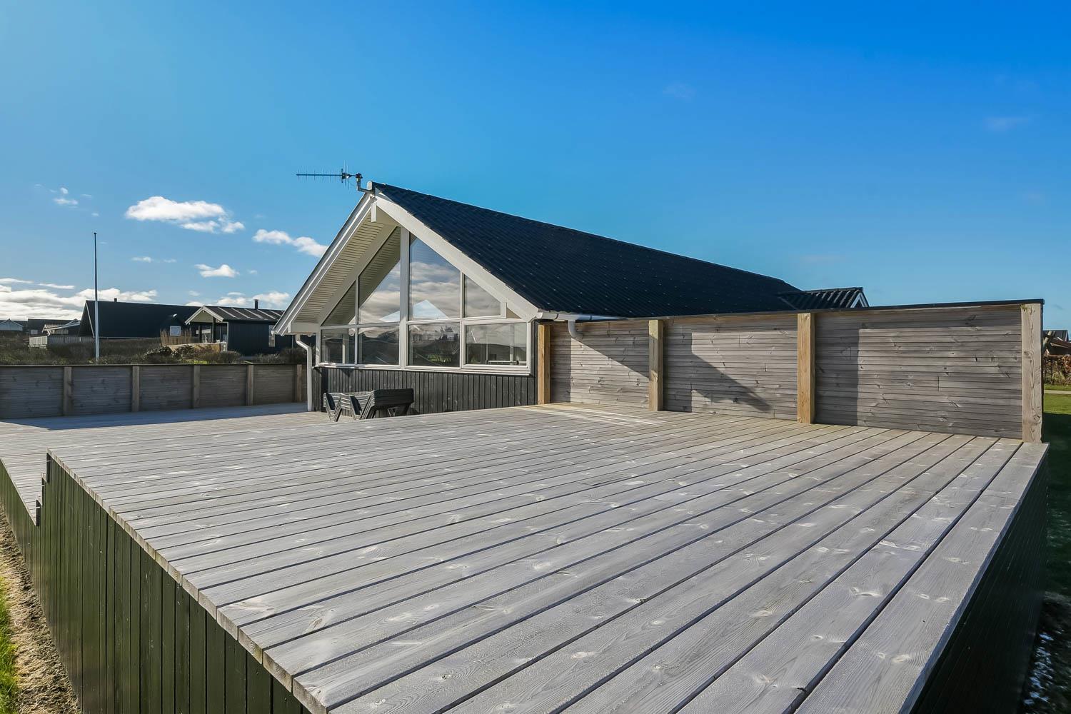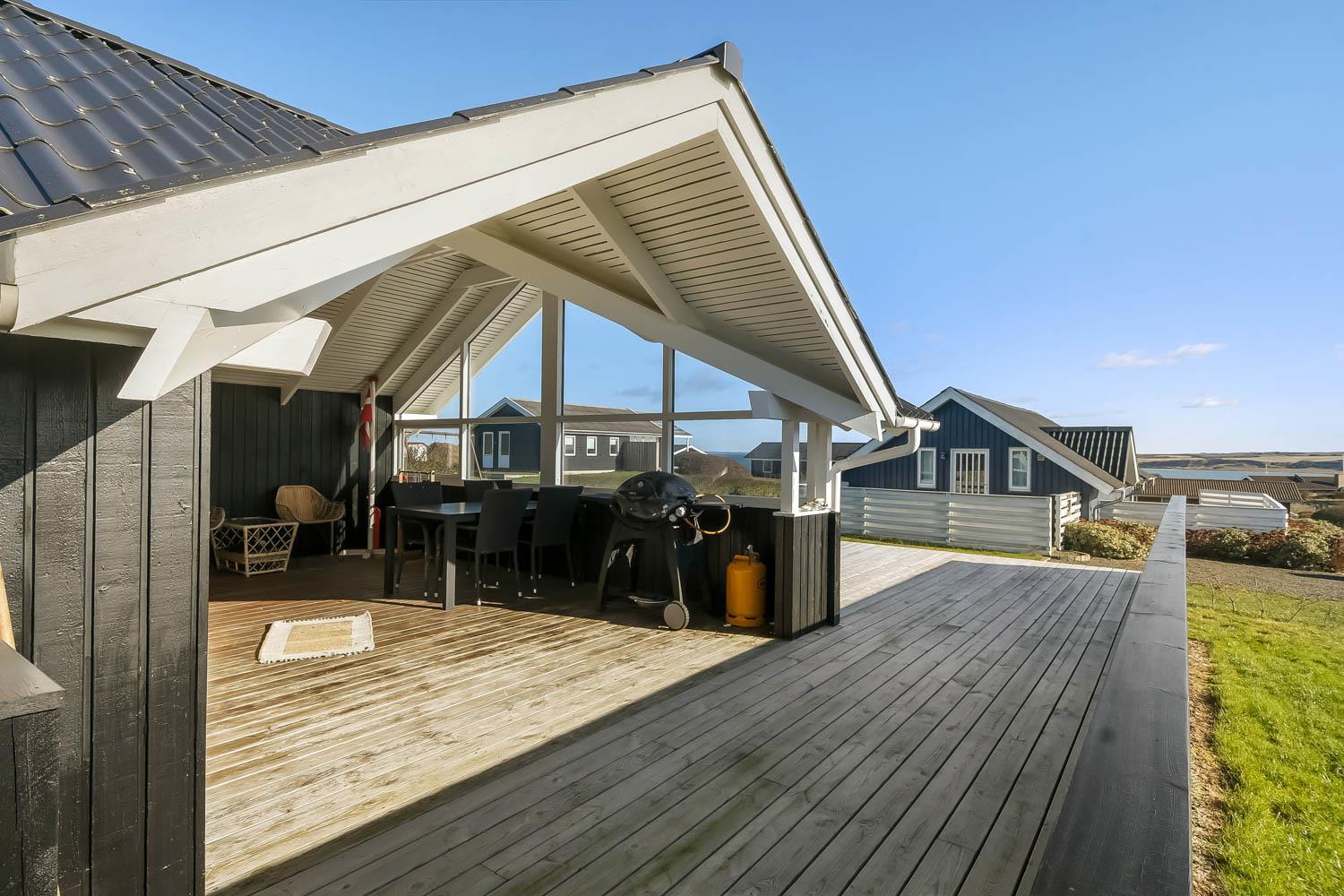 Die grosse überdachte Holzterrasse ist etwas besonderes. Ausserdem finden Sie immer eine Stelle in der Sonne auf der Terrasse, die nicht überdacht ist. Hohe, ungestörte Lage auf einem gepflegten Grundstück auf etwa 844 m2 bloss 500 m vom Limfjord entfernt. Gartenmöbel, Sonnenliegen und Grill können nach Bedarf auf der Terrasse umgestellt werden. Vom Haus aus geht ein Wegesystem, das Sie in wenigen Minuten direkt zum Fjord, Badestrand und Badesteig führen. Dicht am Haus liegt ein neuer Naturspielplatz aus Holz mit Rutsche, Schaukel und vielem anderen. In der Saison gibt es einen Eiskiosk und ein Restaurant. Vom Haus etwa 4 km entfernt liegt der Ort Lemvig mit vielen Geschäften, Fischrestaurant, Kino, Skaterbahn, Museum u.a.