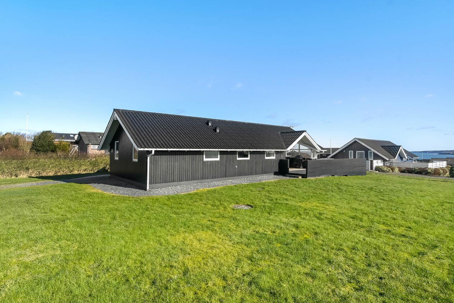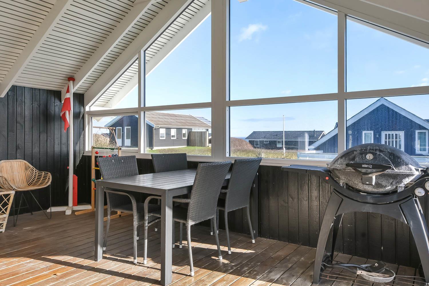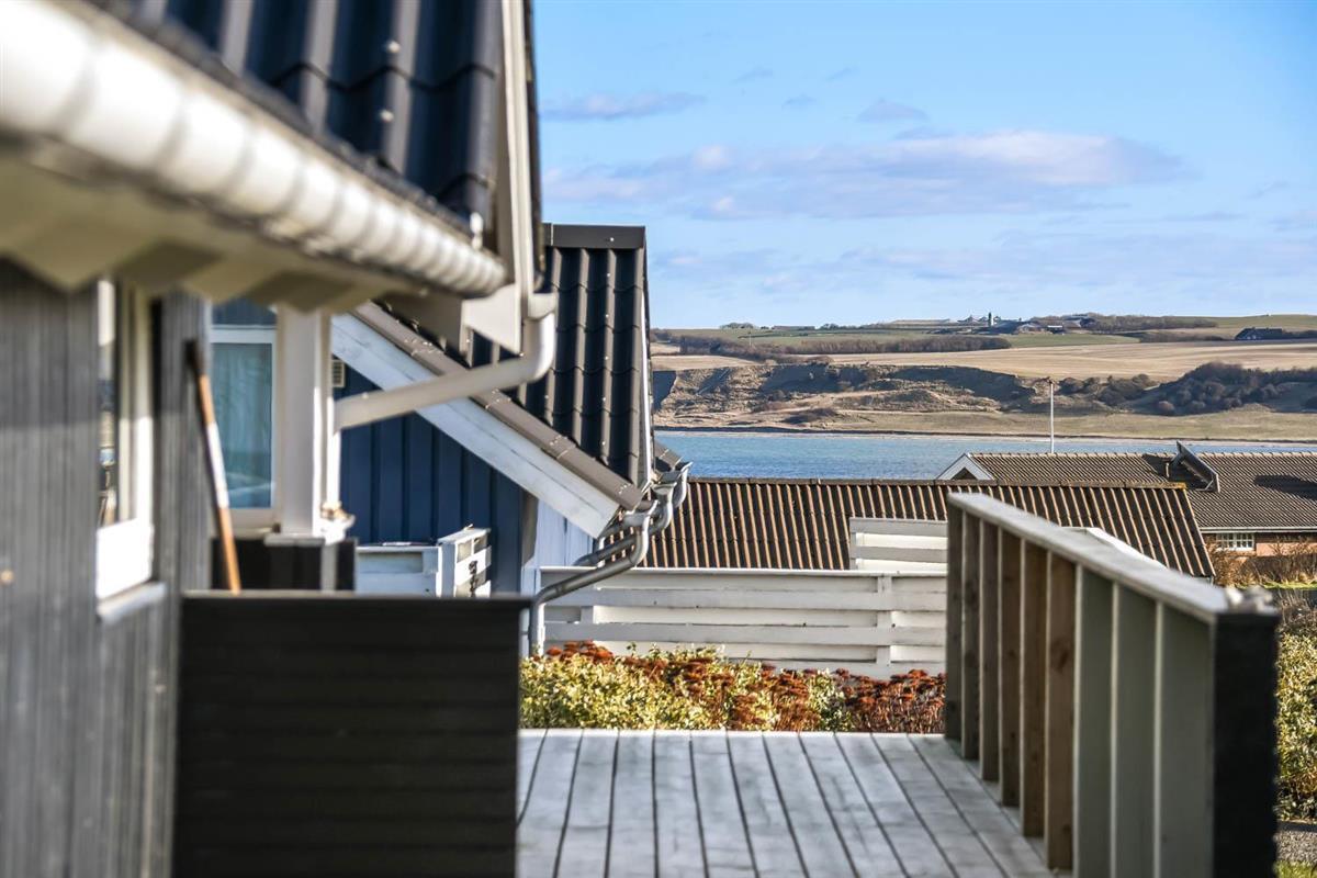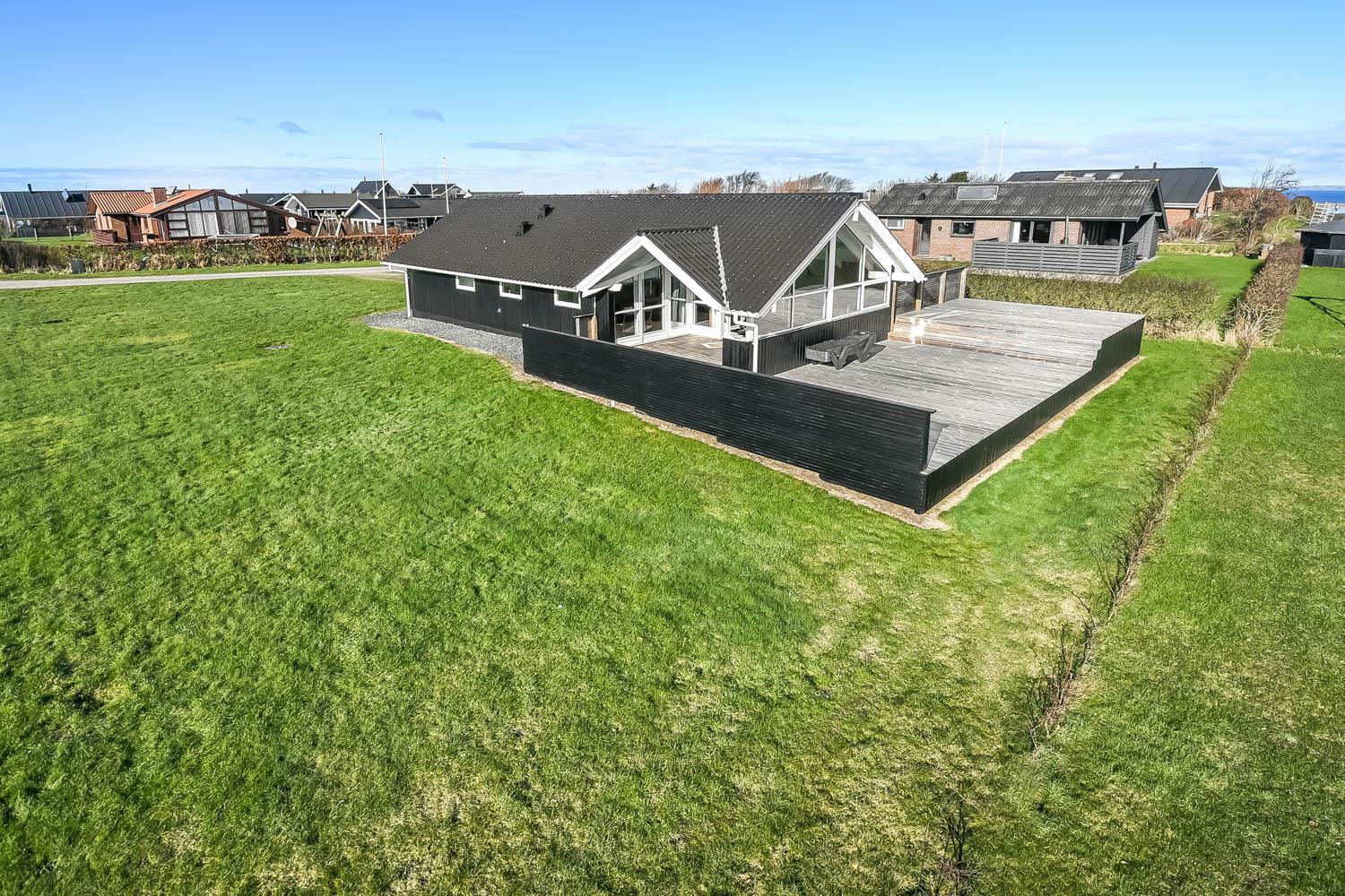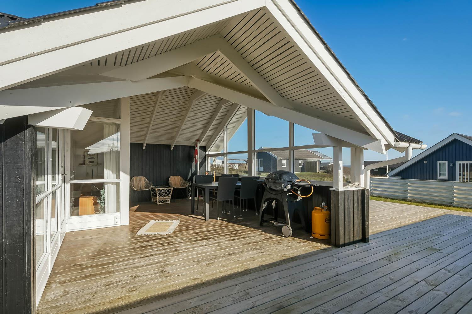 Die grosse überdachte Holzterrasse ist etwas besonderes. Ausserdem finden Sie immer eine Stelle in der Sonne auf der Terrasse, die nicht überdacht ist. Hohe, ungestörte Lage auf einem gepflegten Grundstück auf etwa 844 m2 bloss 500 m vom Limfjord entfernt. Gartenmöbel, Sonnenliegen und Grill können nach Bedarf auf der Terrasse umgestellt werden. Vom Haus aus geht ein Wegesystem, das Sie in wenigen Minuten direkt zum Fjord, Badestrand und Badesteig führen. Dicht am Haus liegt ein neuer Naturspielplatz aus Holz mit Rutsche, Schaukel und vielem anderen. In der Saison gibt es einen Eiskiosk und ein Restaurant. Vom Haus etwa 4 km entfernt liegt der Ort Lemvig mit vielen Geschäften, Fischrestaurant, Kino, Skaterbahn, Museum u.a.