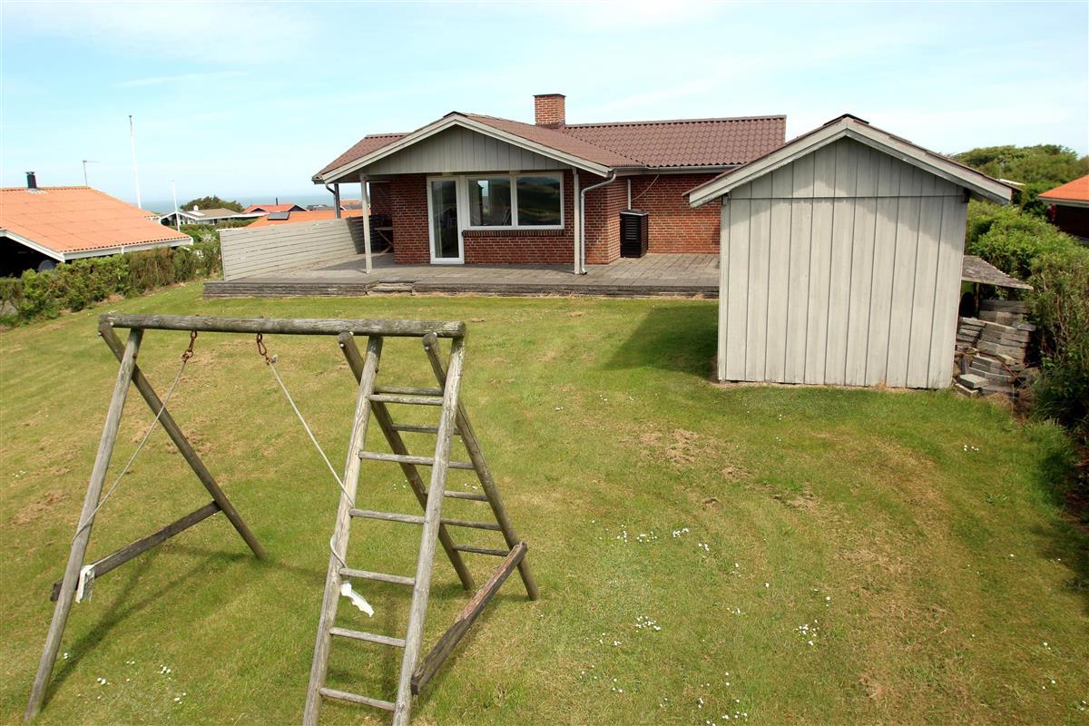 Vom Wohnzimmer aus gelangt man direkt auf eine teilweise überdachte Terrasse mit Gartenmöbeln, Sonnenliegen und Grill. Dank guter Windschutzmöglichkeiten lassen sich die Möbel flexibel umstellen, um je nach Wunsch Sonne oder Schatten zu genießen. Für die kleinen Gäste gibt es Schaukeln im Garten.