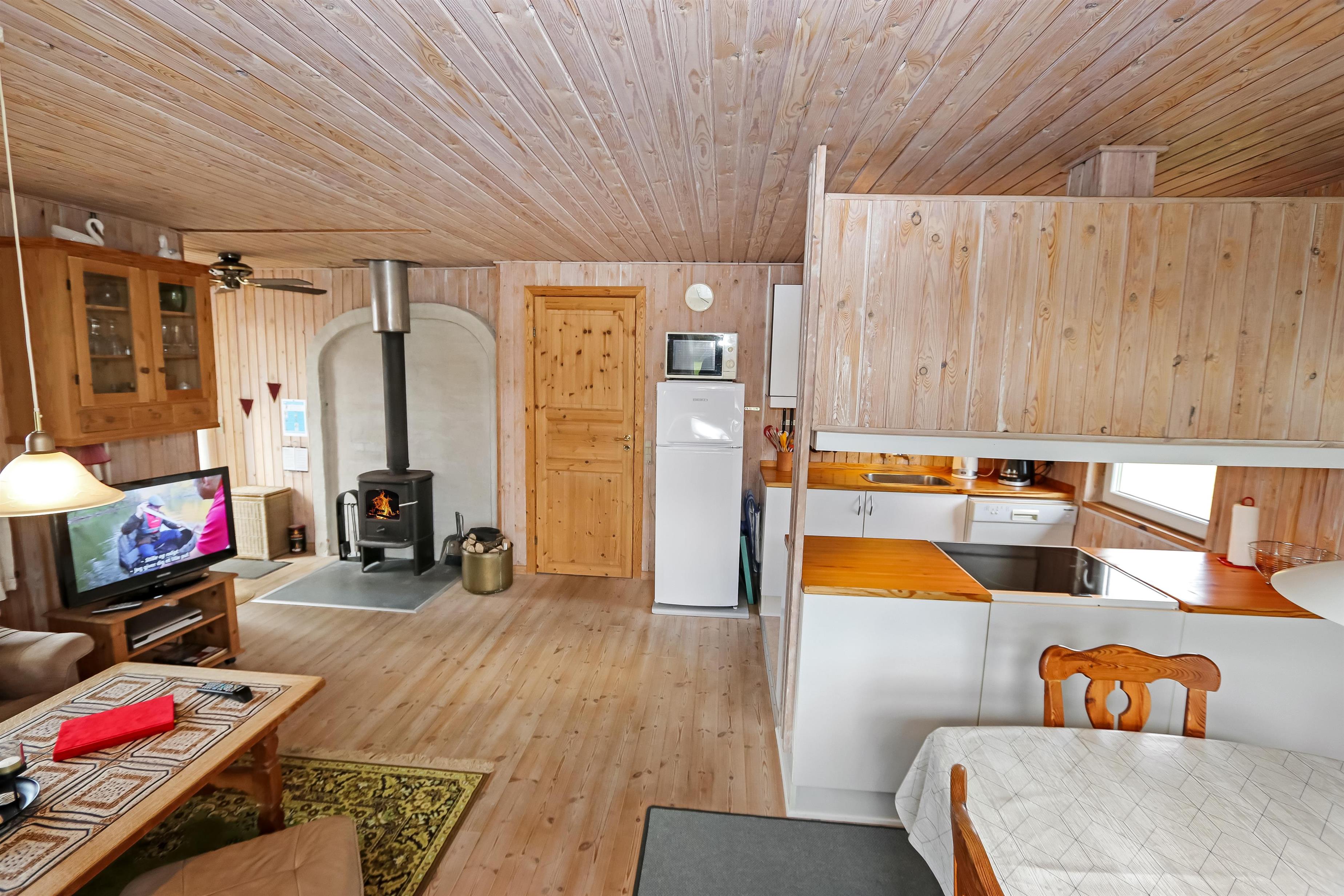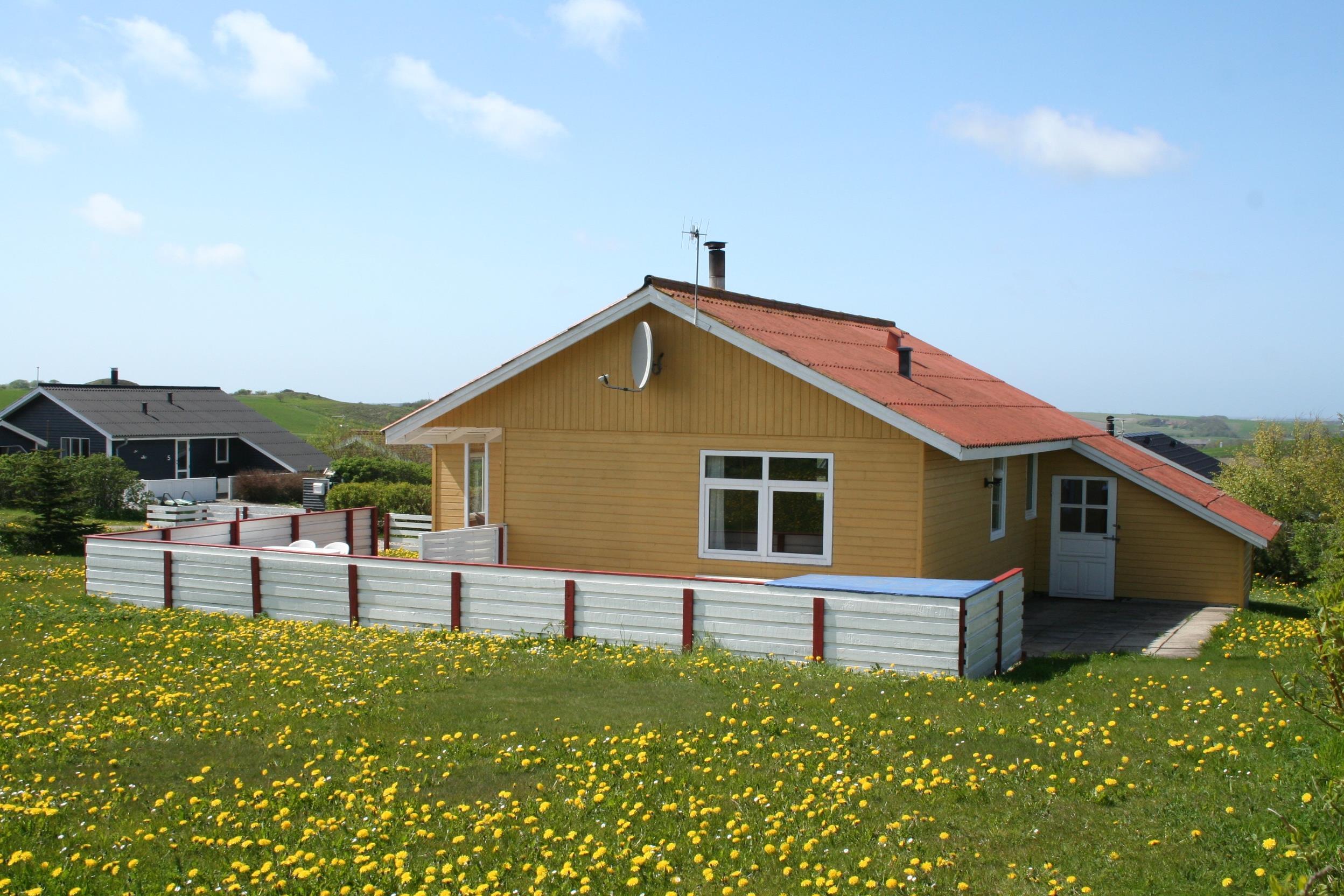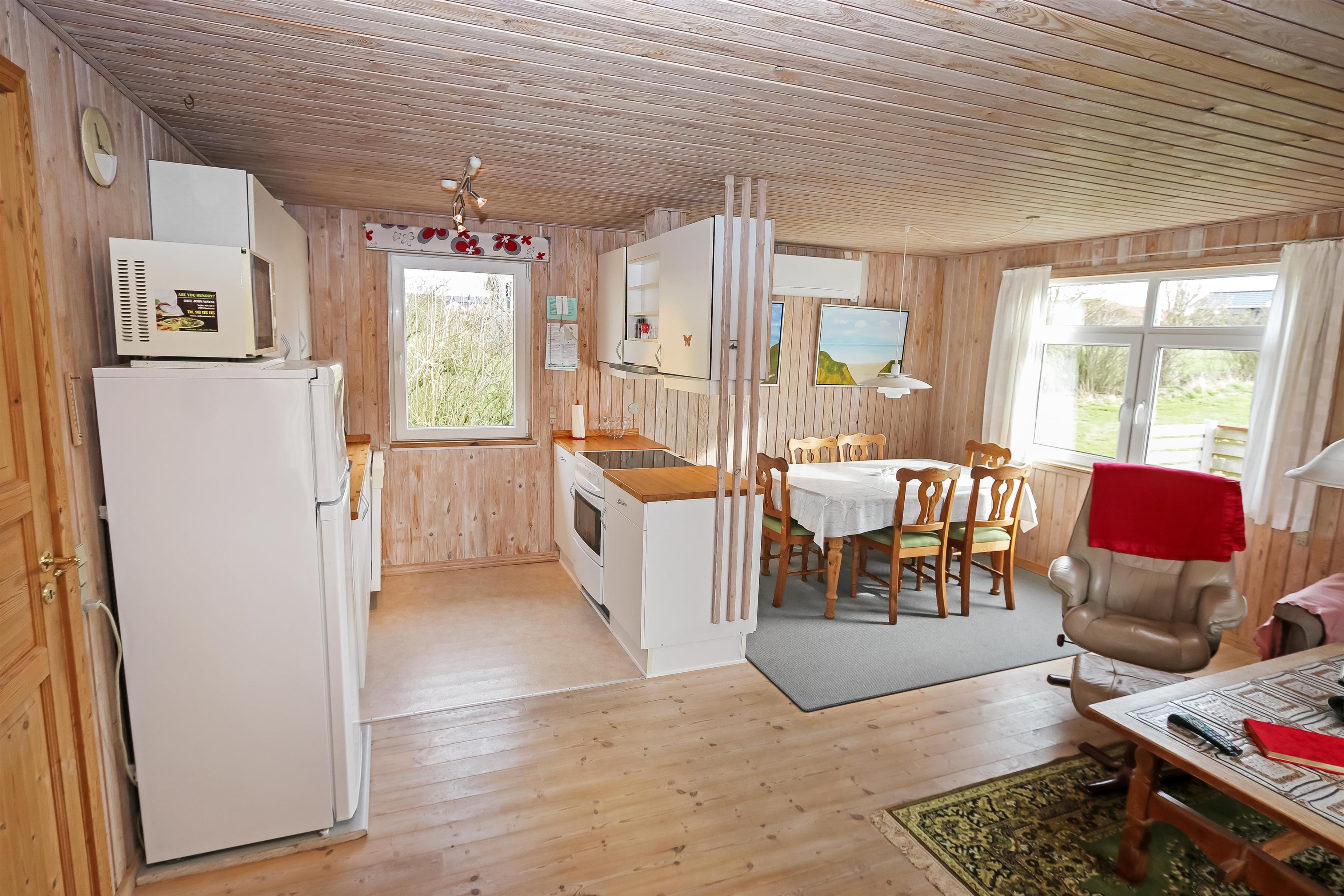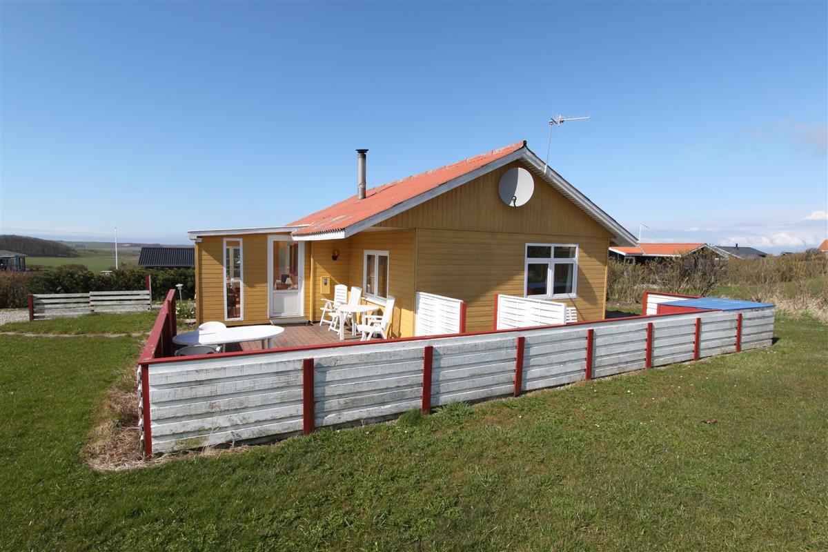 Holzferienhaus mit etwa 95 m². Der Wohnraum ist gemütlich eingerichtet, mit z.B. schönen Möbeln, TV mit dänischen und deutschen Programmen, einem Kaminofen, einer Wärmepumpe und praktischen Holzböden. 3 Schlafräume: 1DB + 1DB + 1E mit Holzboden. Gemütliche Küchenecke mit Herd mit Cerankochfeld, Mikrowelle, Kühlschrank mit Gefrierfach, Geschirrspüler und praktischer Linoleumboden. Von dem kombinierten Wohnraum/Küchenecke können Sie den schönen Blick über die Landschaft und den Limfjord geniessen. Badezimmer mit Toilette, Dusche, Waschbecken und Waschmaschine. Kinderbett und Kinderstuhl. Rauchen ist nicht erlaubt im Haus. Haustier nicht erlaubt. Ein richtig unglaublich gemütliches Ferienhaus.