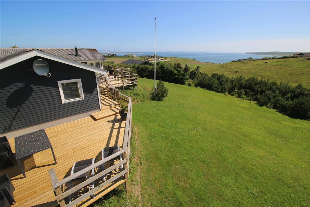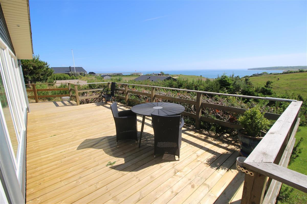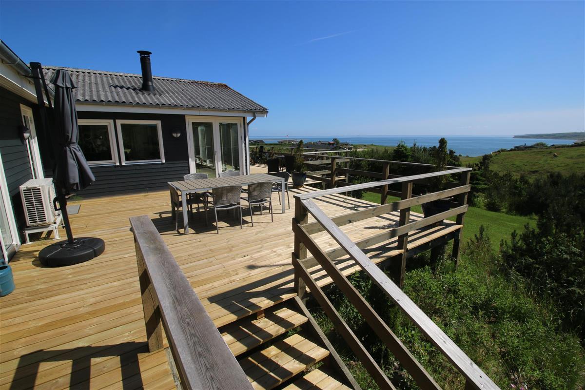 Von der Küche aus hat man Zugang zu einem großen Wintergarten mit Essbereich. Über das Wohnzimmer gelangt man auf mehrere Terrassen, alle mit Panoramablick über den Limfjord. Hier kann man ungestört sitzen und die Aussicht genießen. Auf den Terrassen gibt es Liegestühle, Grill und viele Gartenmöbel. Hoch gelegen auf einem herrlichen, gepflegten Hanggrundstück am Ende einer Sackgasse, mit vielen guten geschützten, sonnigen Plätzen, zahlreichen Aussichtspunkten. Vom Haus führen mehrere schöne Wege direkt hinunter zum Wasser. Nur ca. 500 m vom Einkauf entfernt. Schaukel für die kleinsten Kinder.