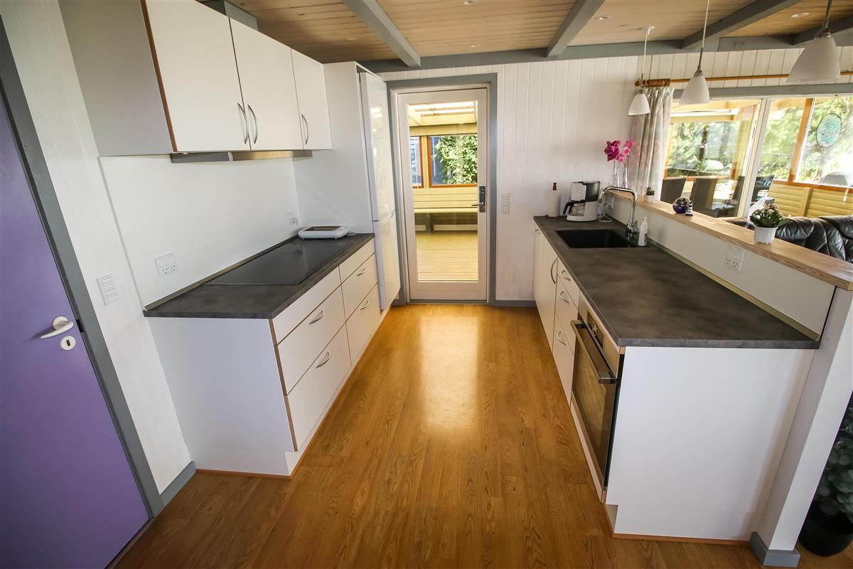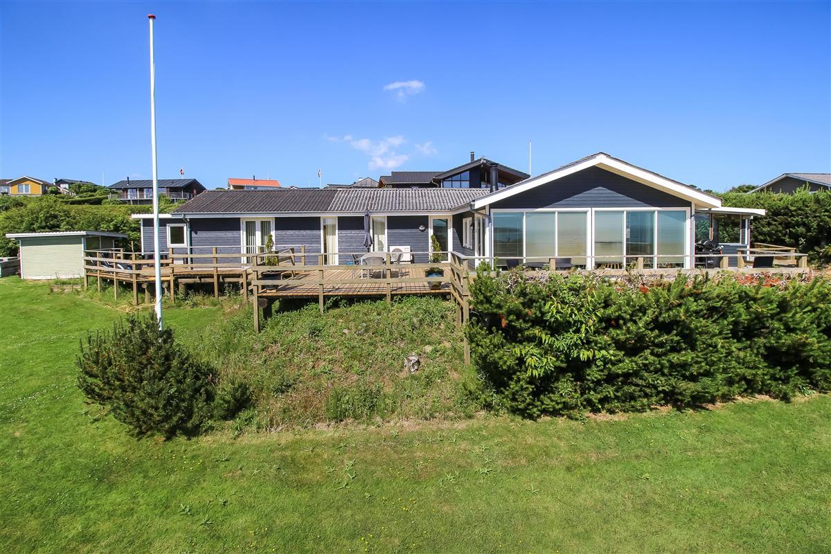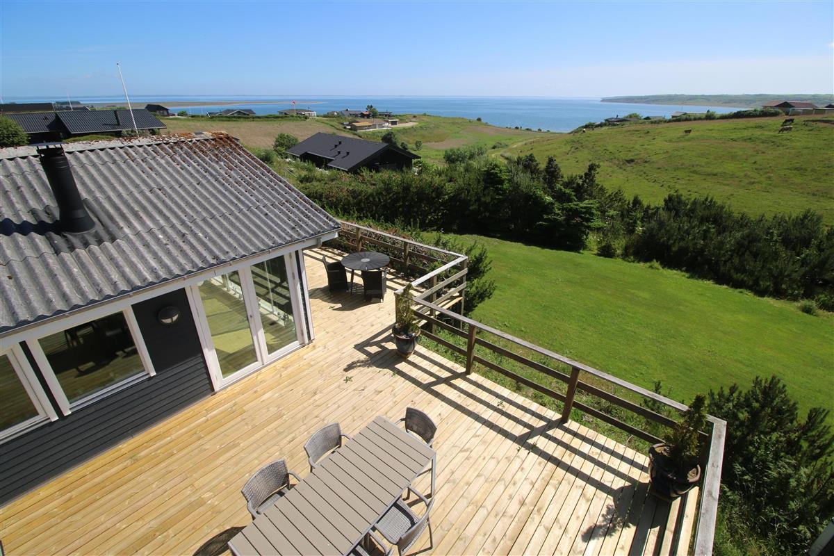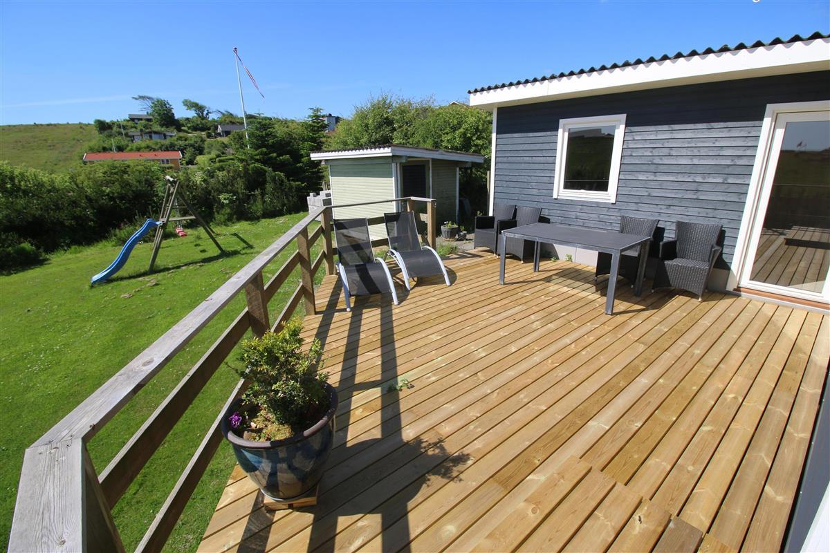 Von der Küche aus hat man Zugang zu einem großen Wintergarten mit Essbereich. Über das Wohnzimmer gelangt man auf mehrere Terrassen, alle mit Panoramablick über den Limfjord. Hier kann man ungestört sitzen und die Aussicht genießen. Auf den Terrassen gibt es Liegestühle, Grill und viele Gartenmöbel. Hoch gelegen auf einem herrlichen, gepflegten Hanggrundstück am Ende einer Sackgasse, mit vielen guten geschützten, sonnigen Plätzen, zahlreichen Aussichtspunkten. Vom Haus führen mehrere schöne Wege direkt hinunter zum Wasser. Nur ca. 500 m vom Einkauf entfernt. Schaukel für die kleinsten Kinder.