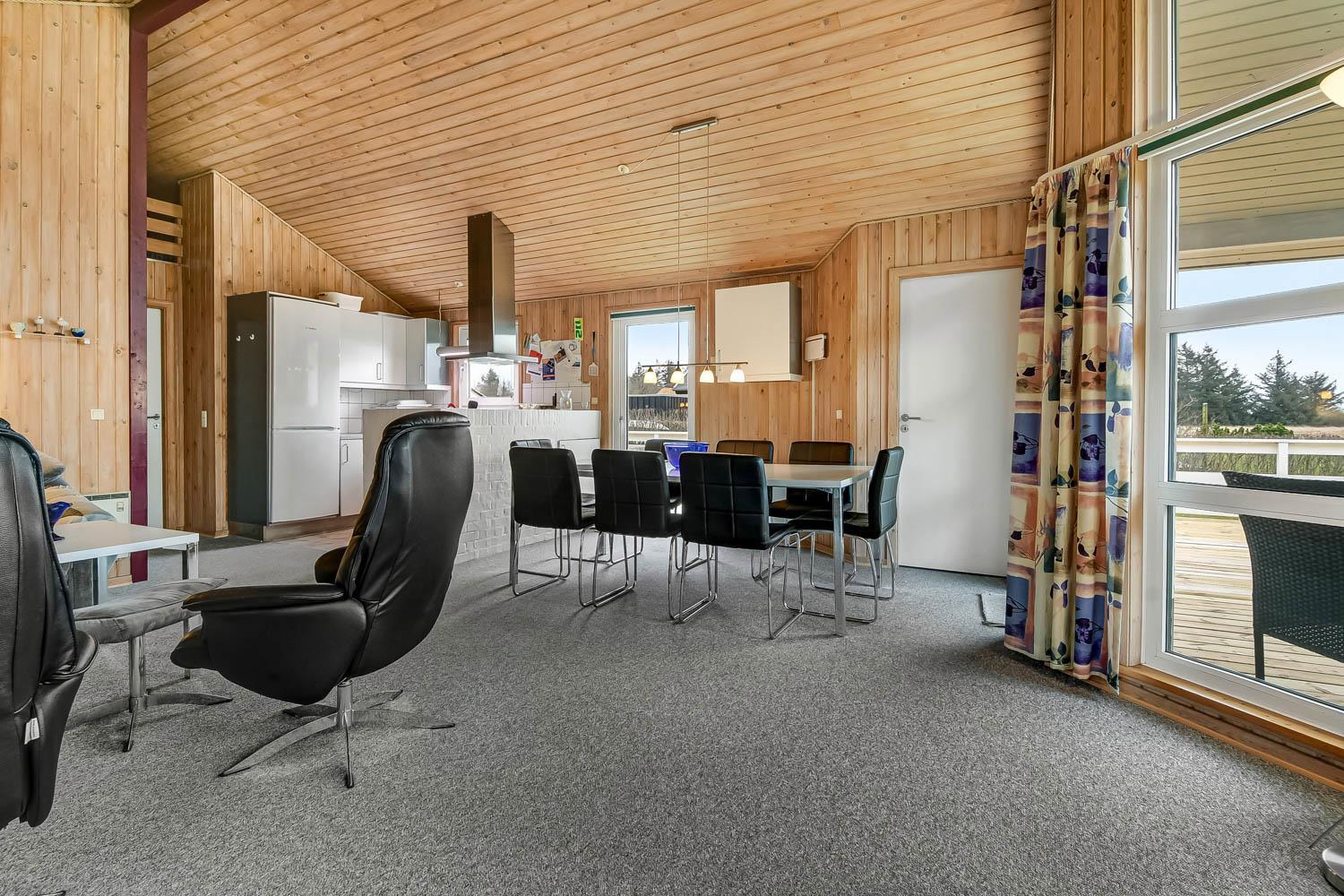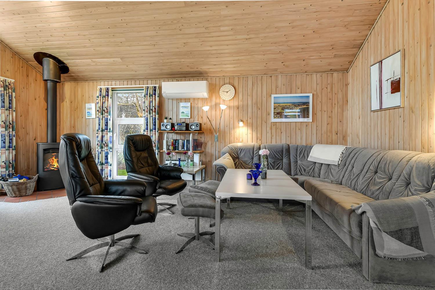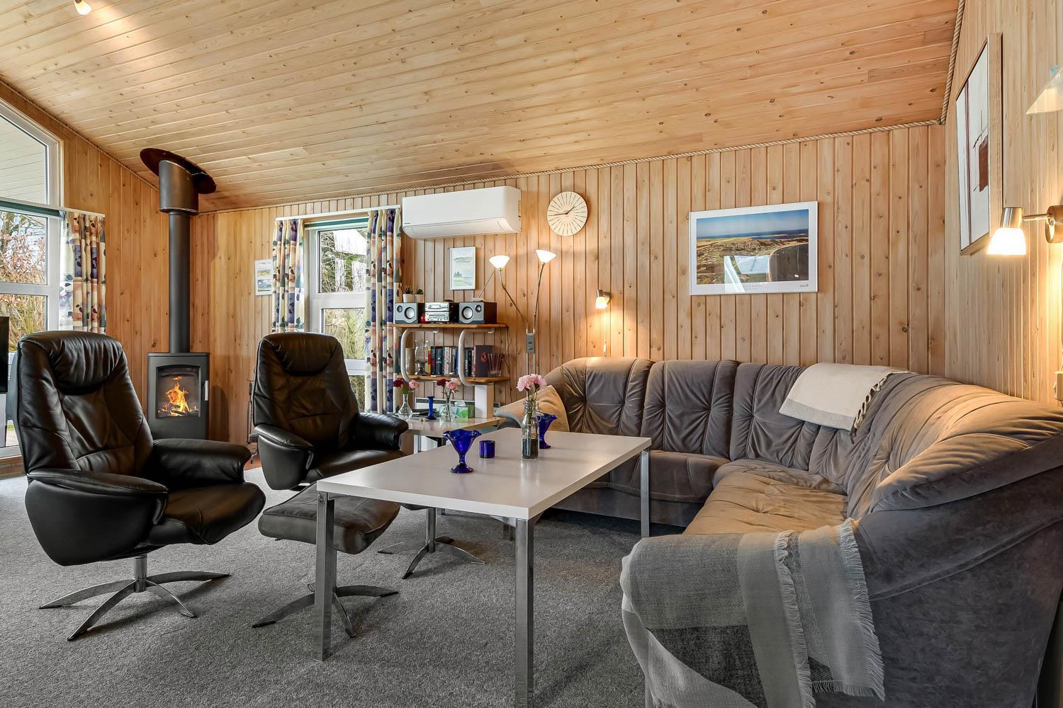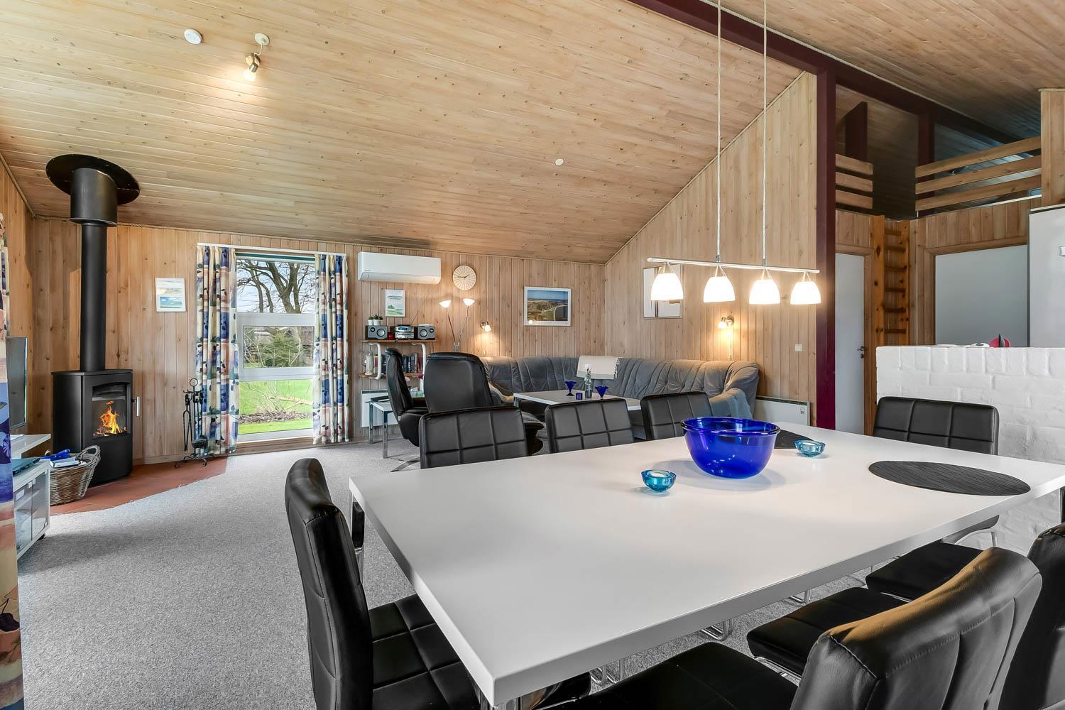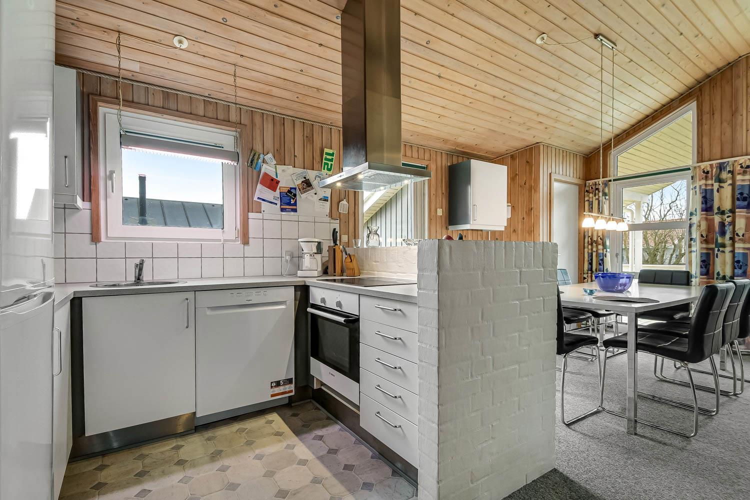 Das Haus hat einen schönen grossen, hellen und geräumigen Wohnraum, der mit der Küche kombiniert ist. Die Küche ist mit Herd mit Cerankochfeld, Kühlschrank mit Gefrierfach, Mikrowelle und Geschirrspüler ausgestattet. Ausserdem gibt es eine separate Gefriertruhe im Haus mit 85 l. Im Wohnraum haben Sie einen Kaminofen, Wärmepumpe, CD-Spieler, DVD und Fernseher mit DR1 TV2 und Parabolantenne für die deutschen Programme. Es gibt einen schönen Esstisch mit Platz für die ganze Familie. Ein Kinderstuhl und Kinderbett gibt es für die kleinsten Gäste. Es gibt 3 Schlafräume im Haus 1 mit 1 DB und 2 mit jeder 2 EZ und ausserdem gibt es 2 Schlafplätze auf dem offenen Schlafboden (hier müssen Sie eine Leiter hochklettern). Es gibt 2 Badezimmern und das grosse Bad ist mit Sauna und Whirlpool und natürlich auch mitDusche, Toilette und Waschbecken. Hier finden Sie auch die Waschmaschine und den Trockner. Das andere Badezimmer ist mit Toilette, Dusche und Waschbecken.
