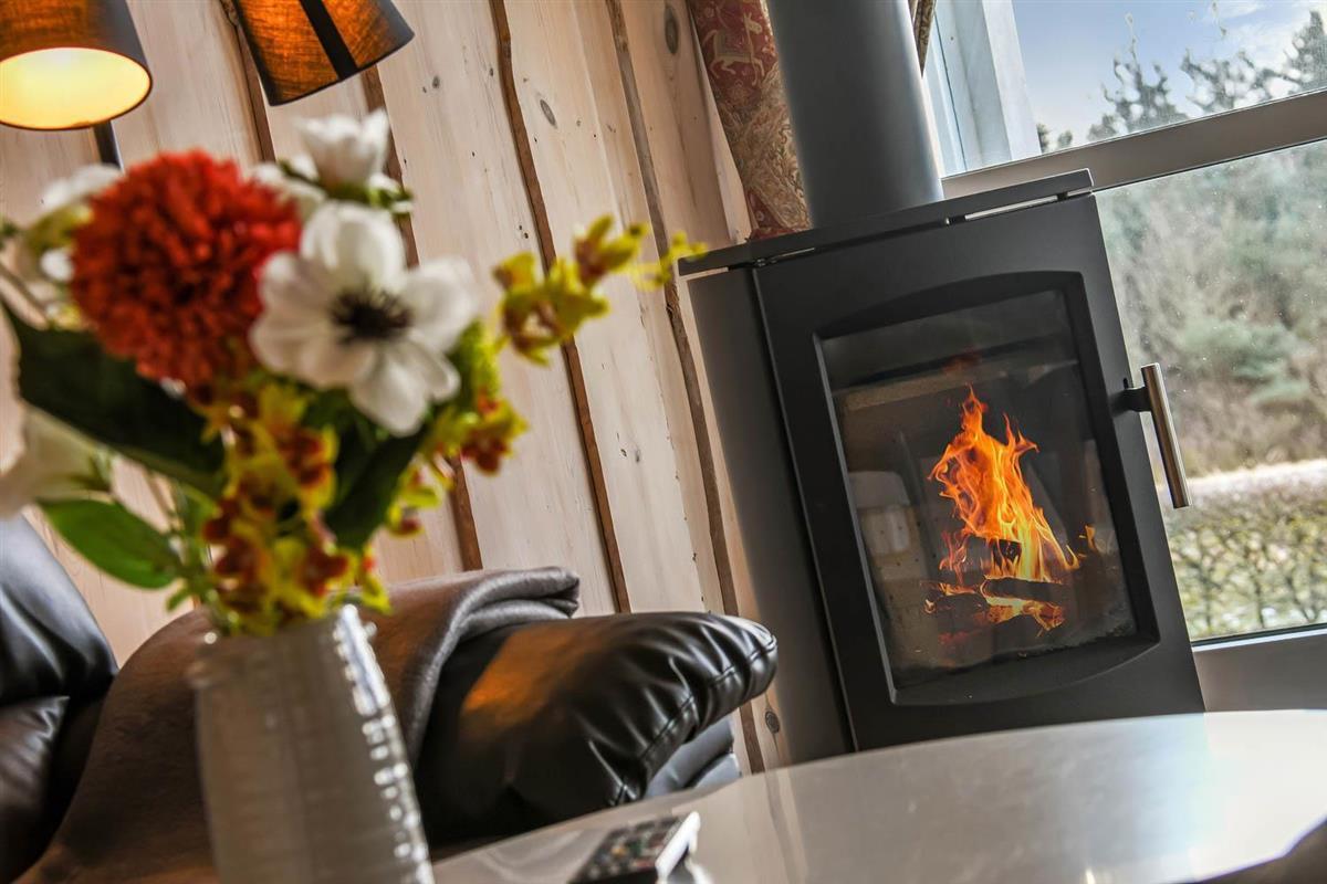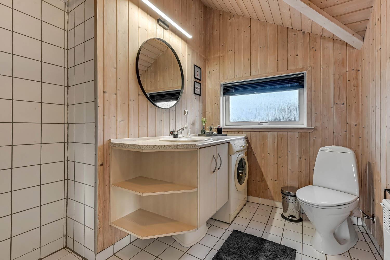 Das Haus ist besonders gut ausgestattet mit Waschmaschine, Wärmepumpe und Holzofen. Badezimmer und Hauswirtschaftsraum haben Fliesenböden.
