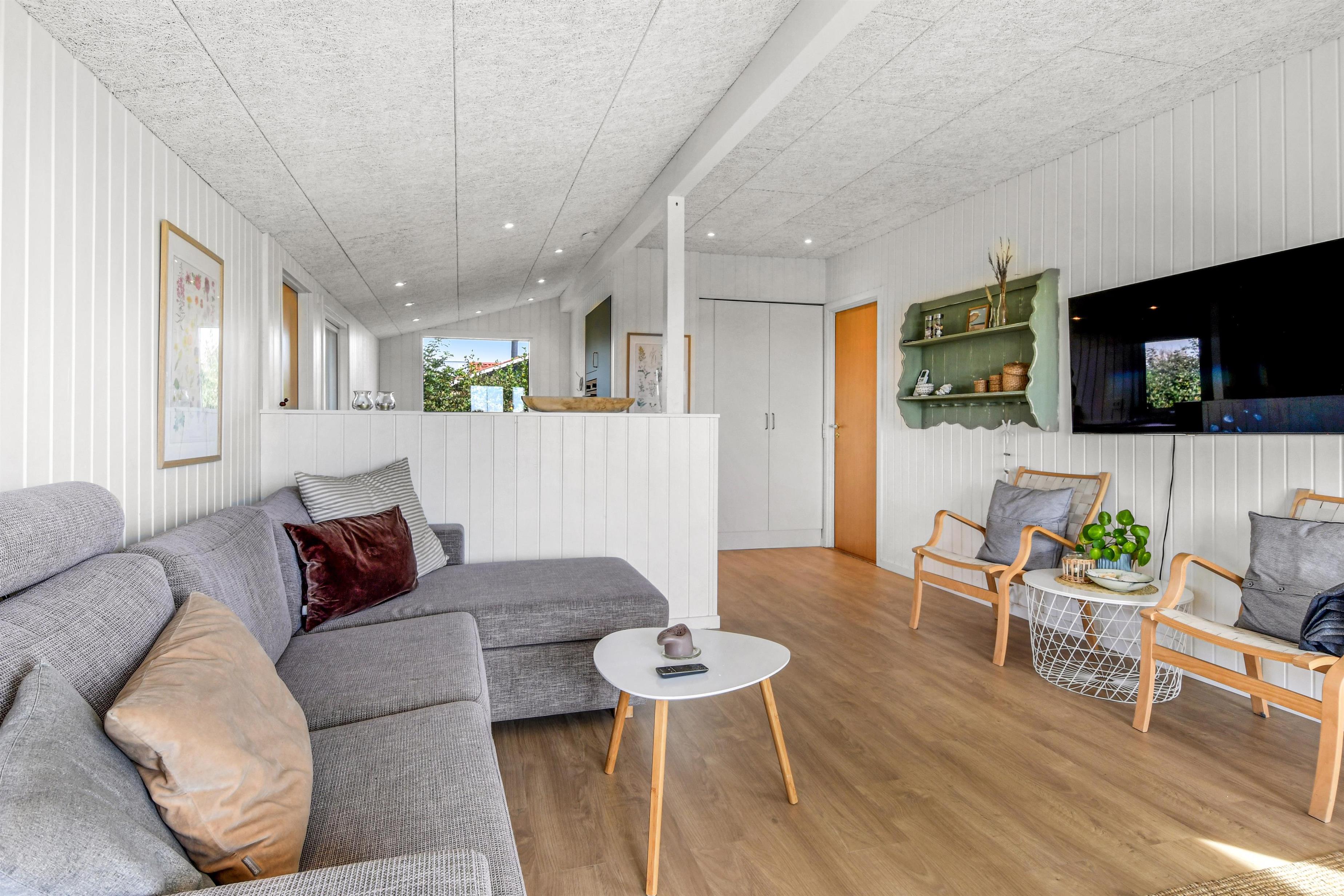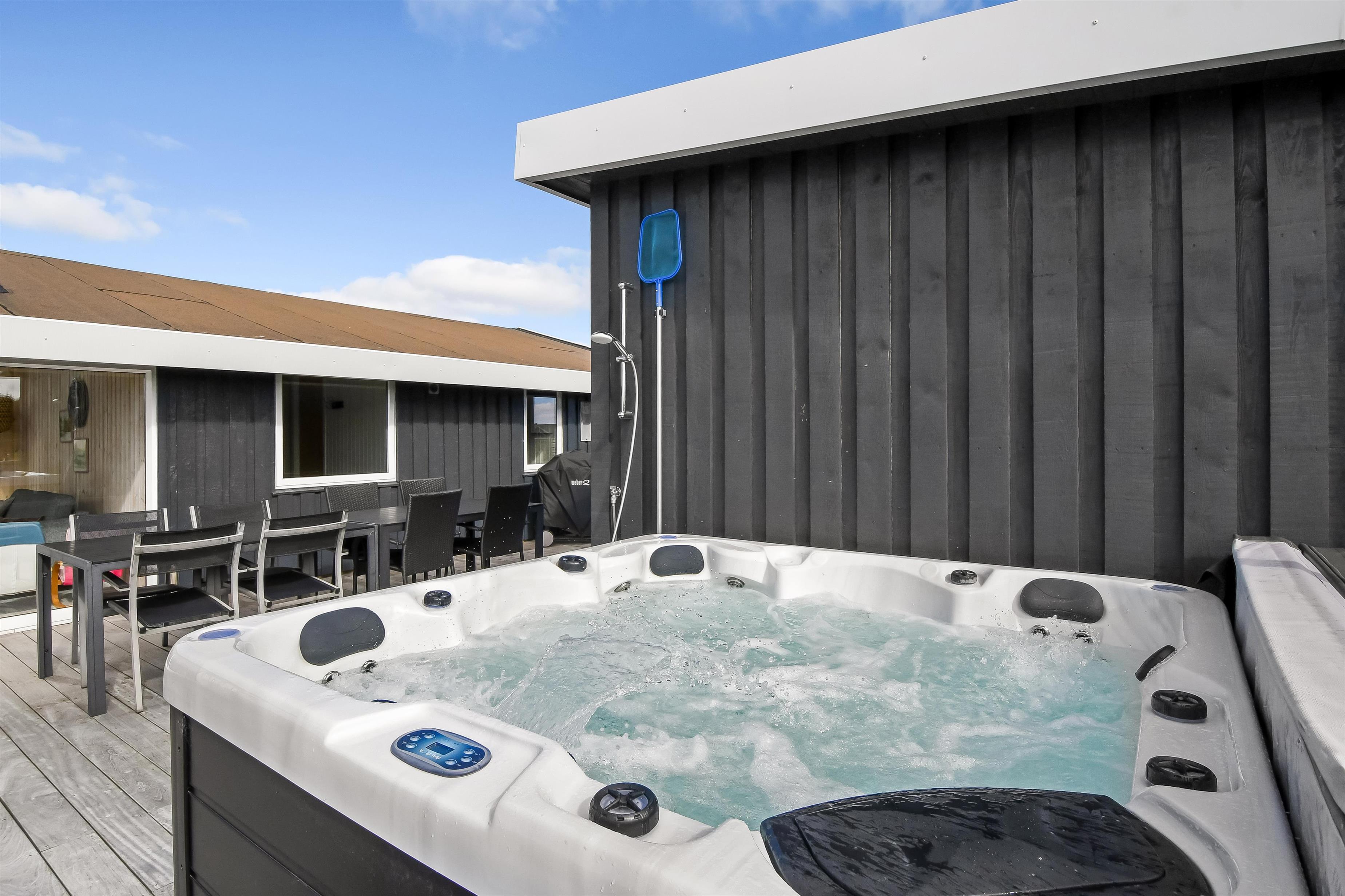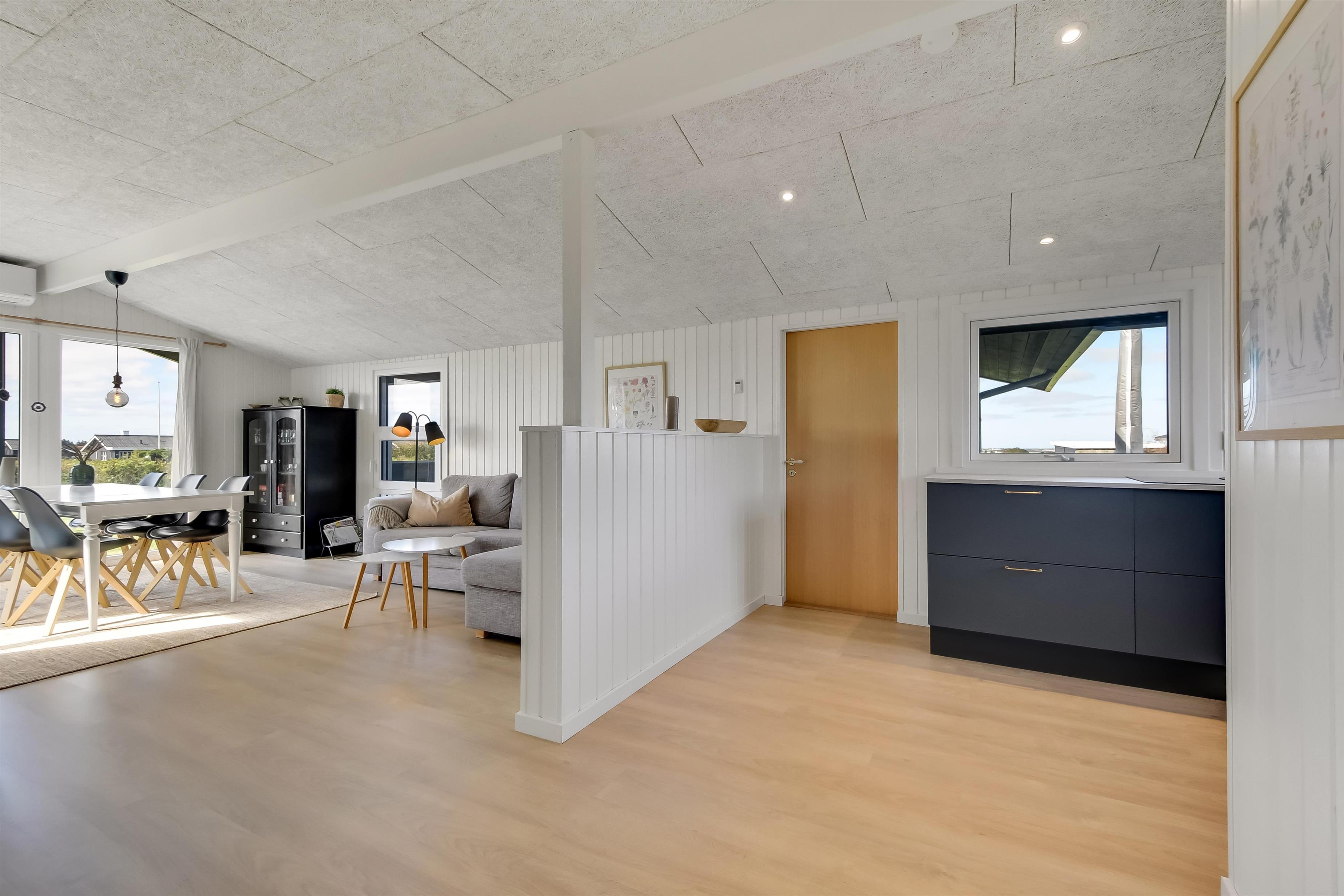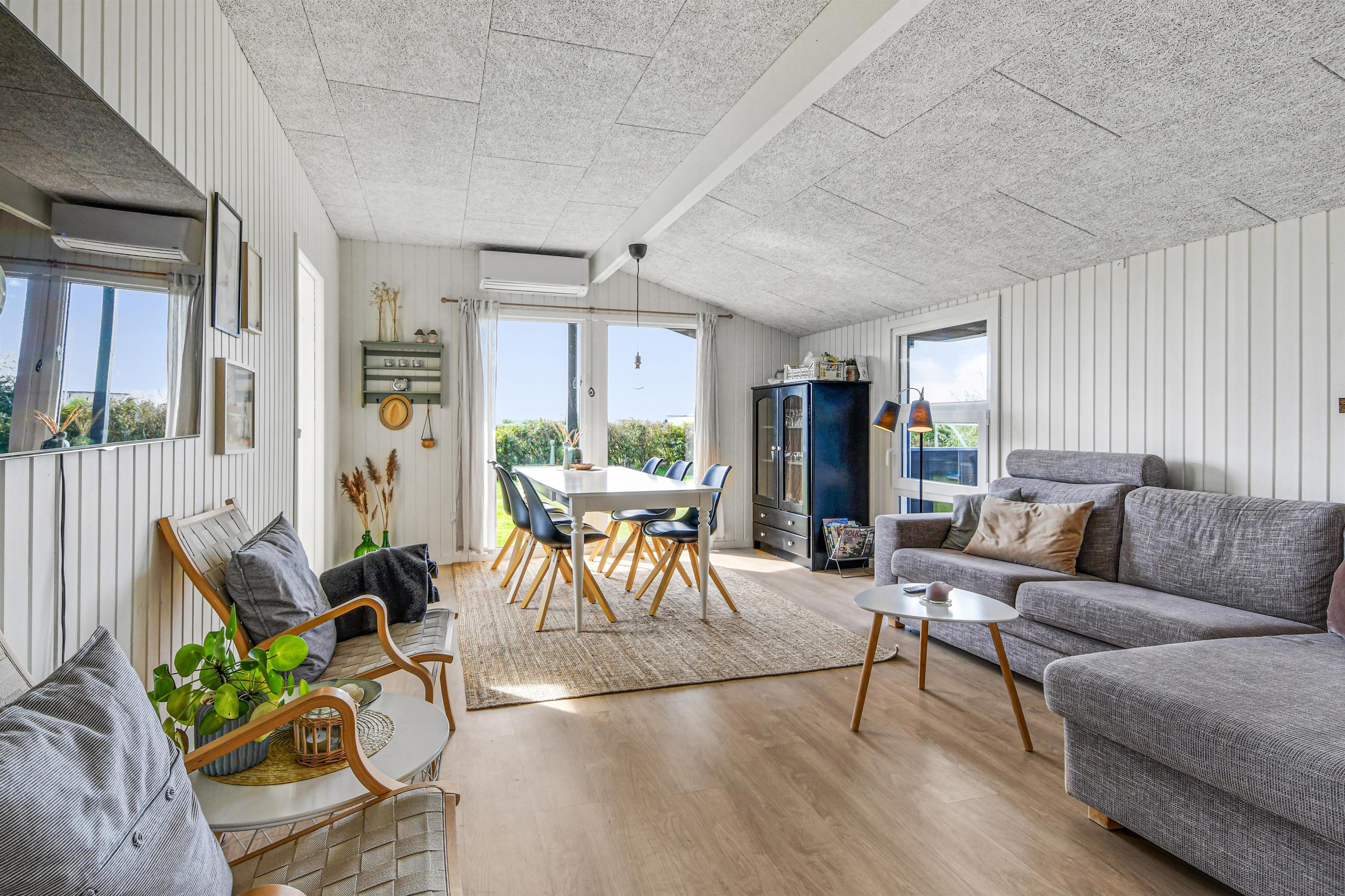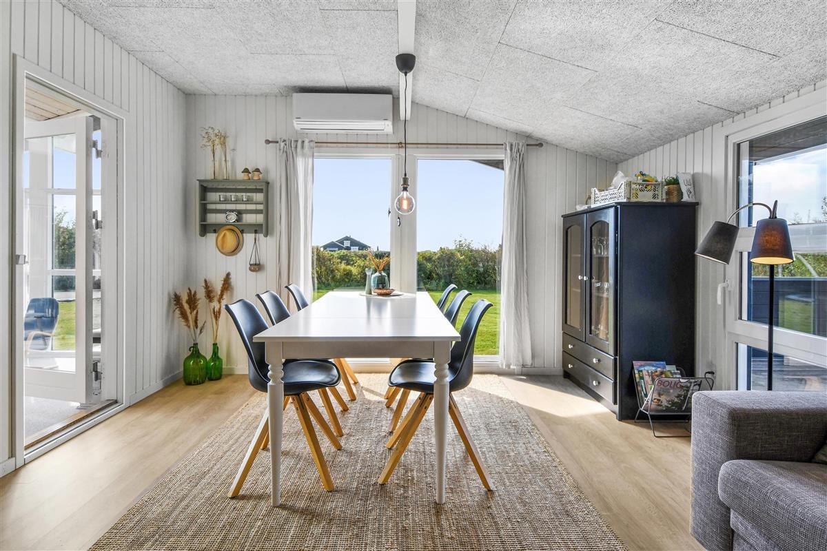 Das Haus mit 97 qm ist gut eingerichtet und im Jahr 2023 neu renoviert. Es hat 5 Schlafräume und 2 Badezimmer. 4 Schlafräume sind im Haus und 1 Schlafraum mit Badezimmer mit Toilette liegt im Anbau. Sie gelangen im Haus über den großen Flur zum Badezimmer und zu 3 von 5 Schlafräumen: 1DB + 1E + 1B. Im Zentrum befindet sich der kombinierte Wohnraum mit TV, (Deutsche und Dänsche Programme) Esszimmer und Küche mit hohen geöffneten Decken. In Verlängerung zum Wohnraum gibt es einen Ausgang zu einer der neuen Terrassen, die geschlossen und mit Außen-Whirlpool versehen ist. Das größte Zimmer (1DB) liegt alleine und hat ein eigenes Badezimmer sowie Ausgang zu einer der Terrassen. Im Anbau (1DB) gibt es Fußbodenheizung und Toilette und ein Trockner. Das Haus ist mit Qualitätsmaterialien renoviert worden und steht hell und schön da. Die moderne Küche ist mit Ceranfeld-Kochplatte, großem Kühlschrank, Mikrowelle und Geschirrspüler ausgestattet. Es gibt Fußbodenheizung im größten Teil des Hauses; eine Wärmepumpe ist vorhanden und kann das ganze Haus aufwärmen und spart auch Energiekosten. Wenn Sie ein Elektroauto oder einen Plug-in-Hybrid haben, verfügt das Haus über eine Ladebox. Rauchen ist nicht erlaubt. 1 Kinderbett und 1 Kinderstuhl. Max. 3 Hund sind erlaubt.