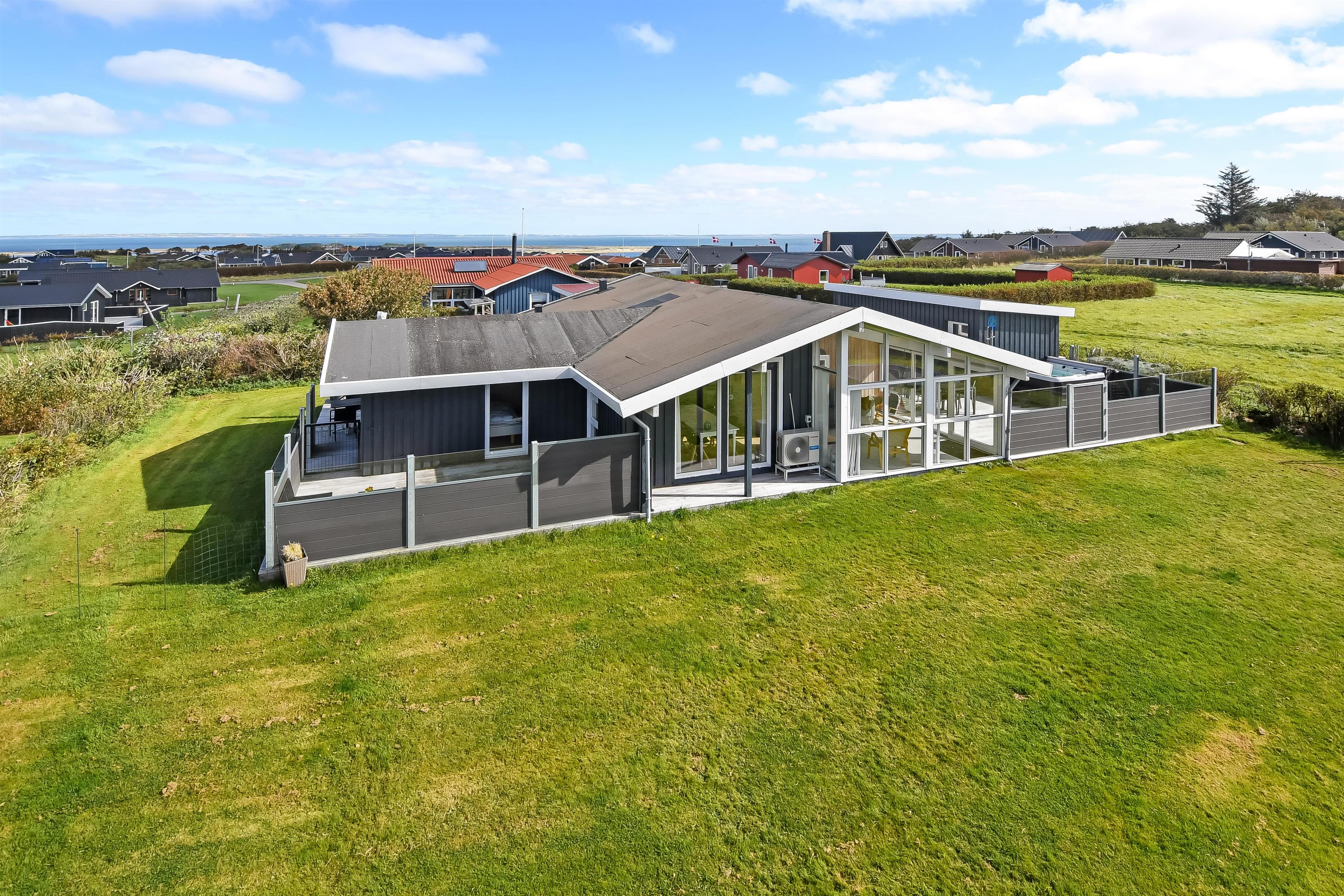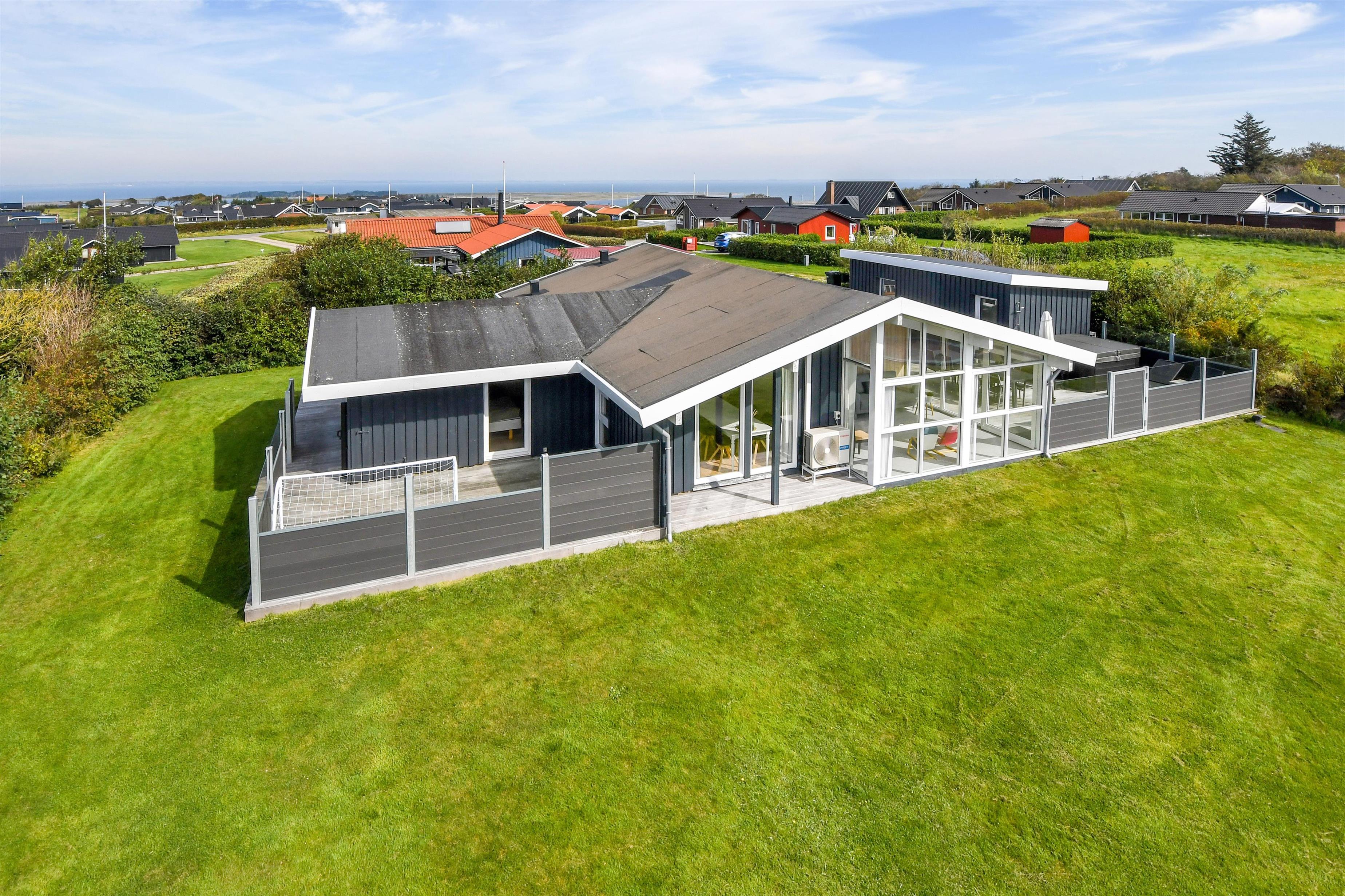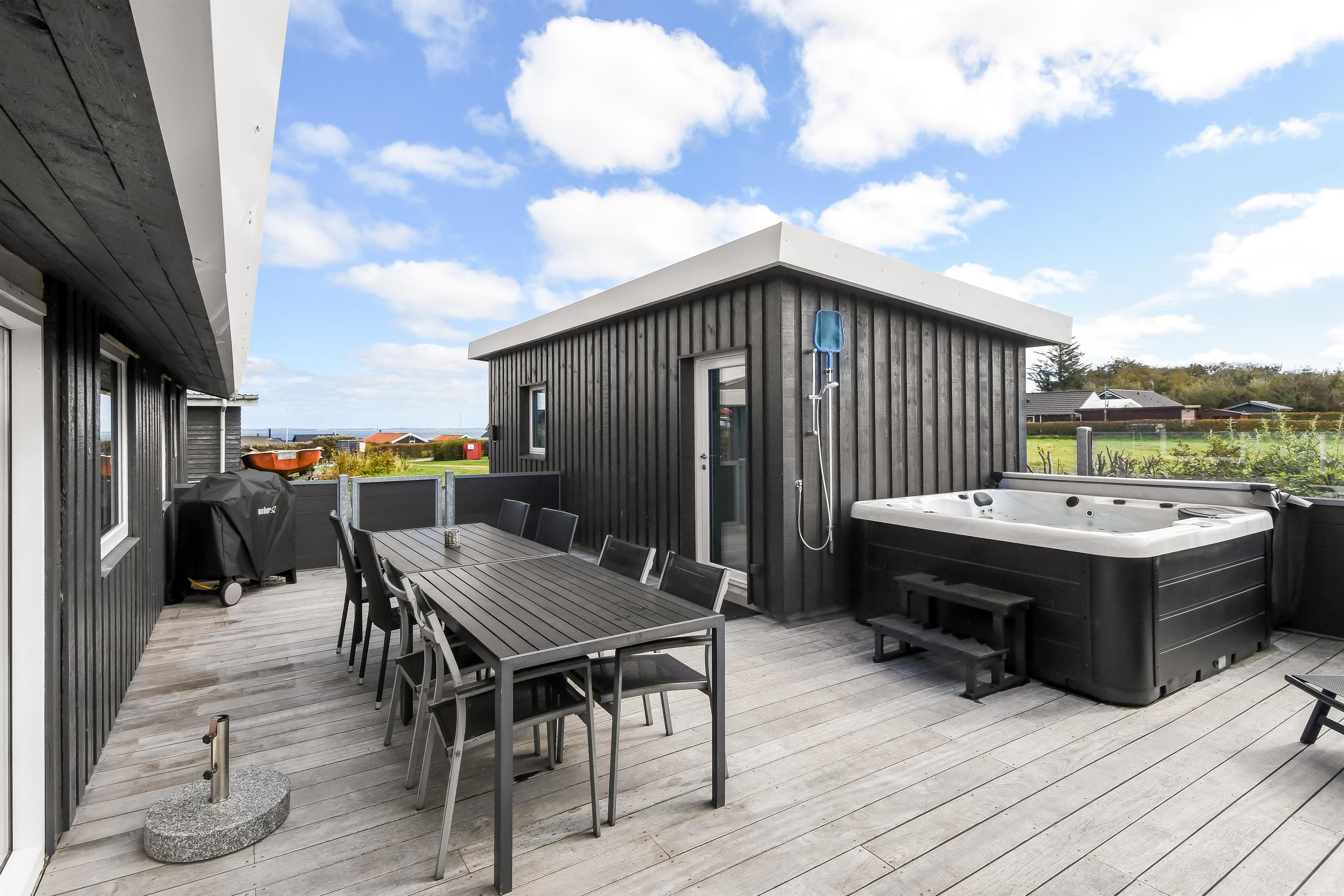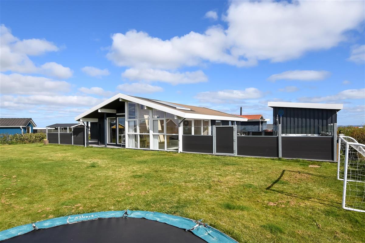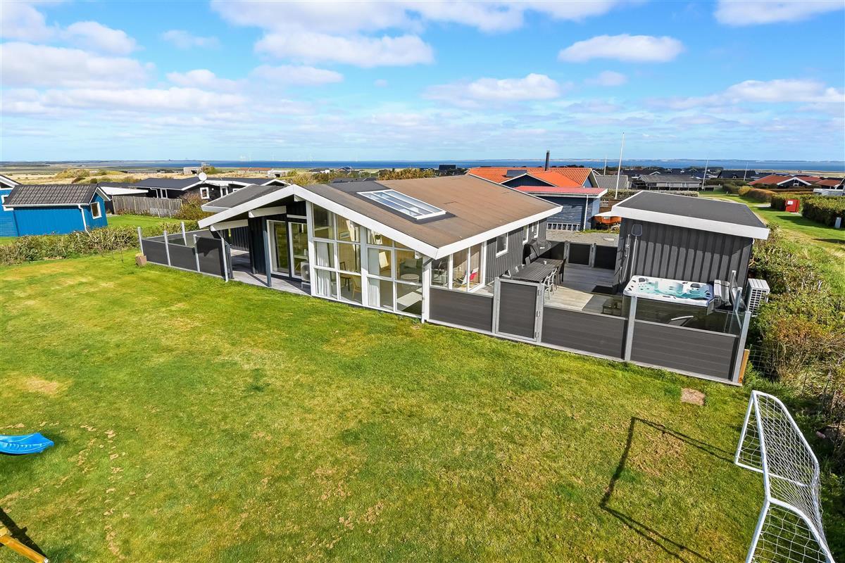 Das Haus liegt auf einem etwa 865 qm großen, eingezäunten Grundstück, in hoher und ungestörter Lage an einem ruhigen Stichweg. Gepflegtes Grundstück mit Trampolin, Schaukel und bloß 700 m vom Strand entfernt. Fantastische, teilweise überdachte Terrassen-Anlage mit Gartenmöbeln, Grill und Sonnenliegen. Hier gibt es auch einen tollen Außen-Whirlpool, den Sie egal wie das Wetter ist, auch abends mit Blick zum Sternenhimmel genießen können. Hier finden Sie immer einen Platz entweder in der Sonne oder windgeschützt und mit Blick zum Limfjord. Gartenmöbel, Sonnenliegen und Grill können nach Bedarf umgestellt werden. Auch auf der hinteren Seite des Hauses gibt es eine Terrasse mit Gartenmöbeln und Blick über die Landschaft. Vom Haus gibt es ein Wegsystem, das Sie in wenigen Minuten zum Fjord, Badestrand und Badebrücken leitet. In der Nähe vom Haus liegt der neue Naturspielplatz aus Naturmaterialien, wo es z.B. Rutsche, Schaukel und vieles andere gibt. Es gibt auch ein Restaurant und einen Eiskiosk, die nur in der Saison geöffnet haben. Außerdem sind es nur 4 km nach Lemvig, einem Handelsort mit vielen Geschäften, Restaurants, Kino, Skaterbahn, Museum u.a.