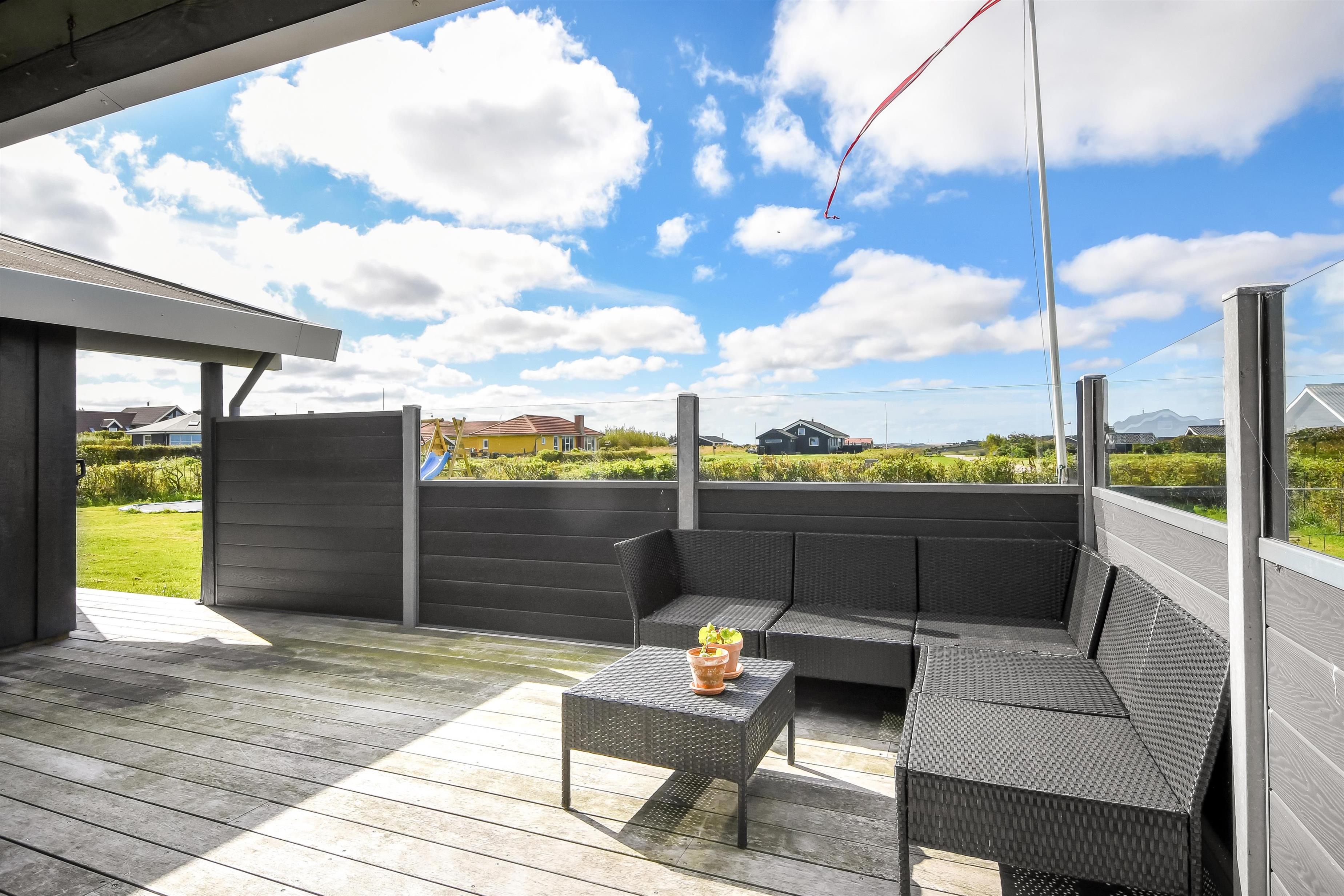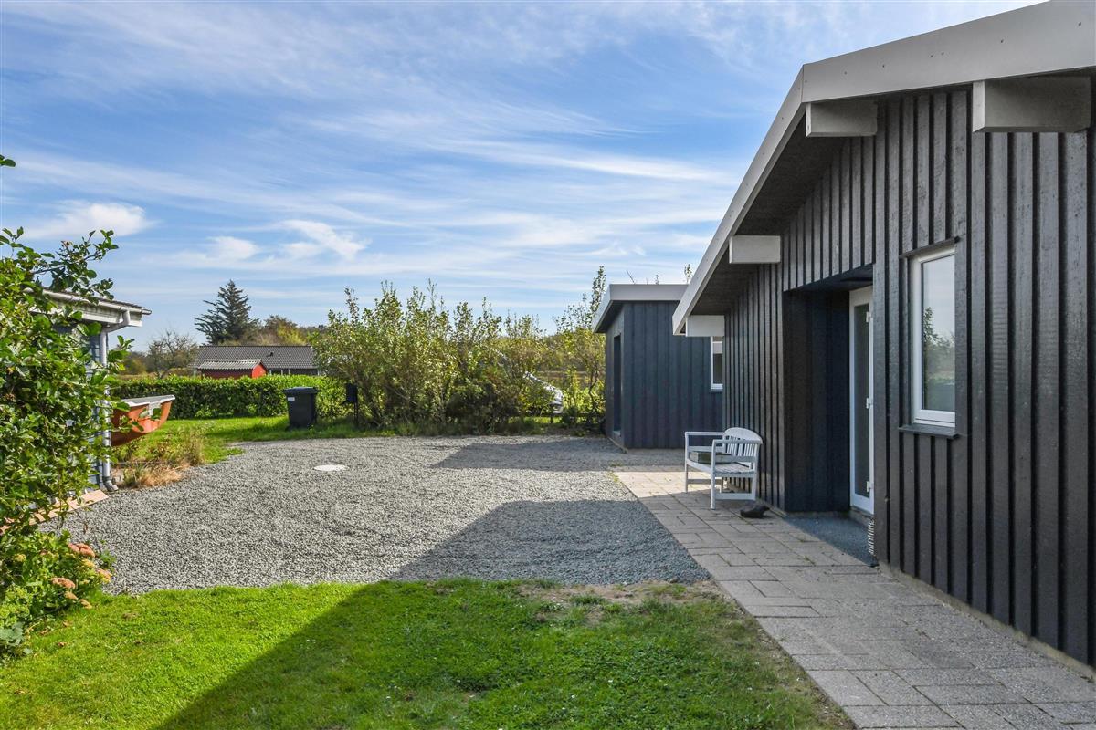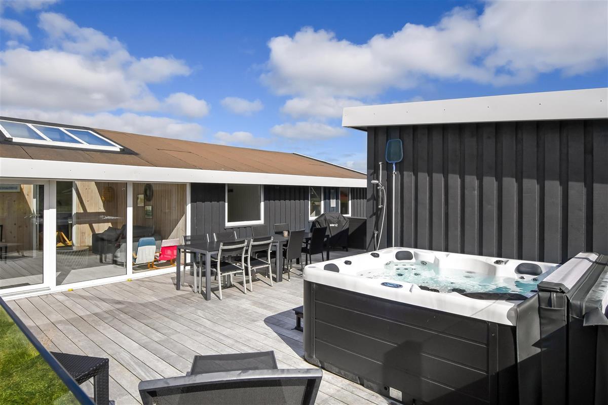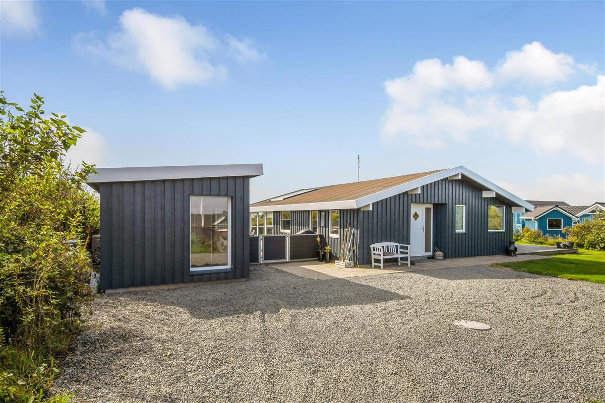 Das Haus liegt auf einem etwa 865 qm großen, eingezäunten Grundstück, in hoher und ungestörter Lage an einem ruhigen Stichweg. Gepflegtes Grundstück mit Trampolin, Schaukel und bloß 700 m vom Strand entfernt. Fantastische, teilweise überdachte Terrassen-Anlage mit Gartenmöbeln, Grill und Sonnenliegen. Hier gibt es auch einen tollen Außen-Whirlpool, den Sie egal wie das Wetter ist, auch abends mit Blick zum Sternenhimmel genießen können. Hier finden Sie immer einen Platz entweder in der Sonne oder windgeschützt und mit Blick zum Limfjord. Gartenmöbel, Sonnenliegen und Grill können nach Bedarf umgestellt werden. Auch auf der hinteren Seite des Hauses gibt es eine Terrasse mit Gartenmöbeln und Blick über die Landschaft. Vom Haus gibt es ein Wegsystem, das Sie in wenigen Minuten zum Fjord, Badestrand und Badebrücken leitet. In der Nähe vom Haus liegt der neue Naturspielplatz aus Naturmaterialien, wo es z.B. Rutsche, Schaukel und vieles andere gibt. Es gibt auch ein Restaurant und einen Eiskiosk, die nur in der Saison geöffnet haben. Außerdem sind es nur 4 km nach Lemvig, einem Handelsort mit vielen Geschäften, Restaurants, Kino, Skaterbahn, Museum u.a.