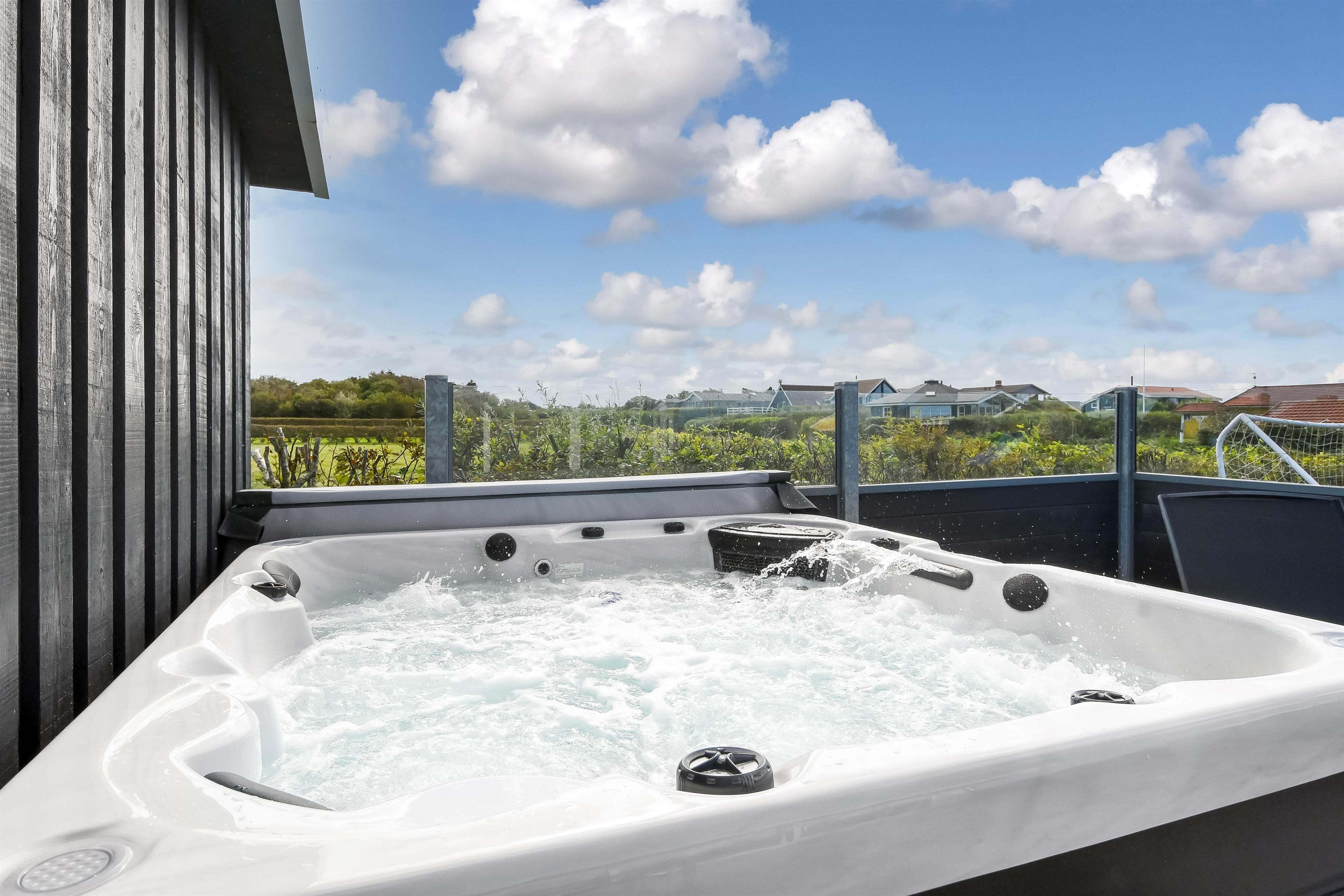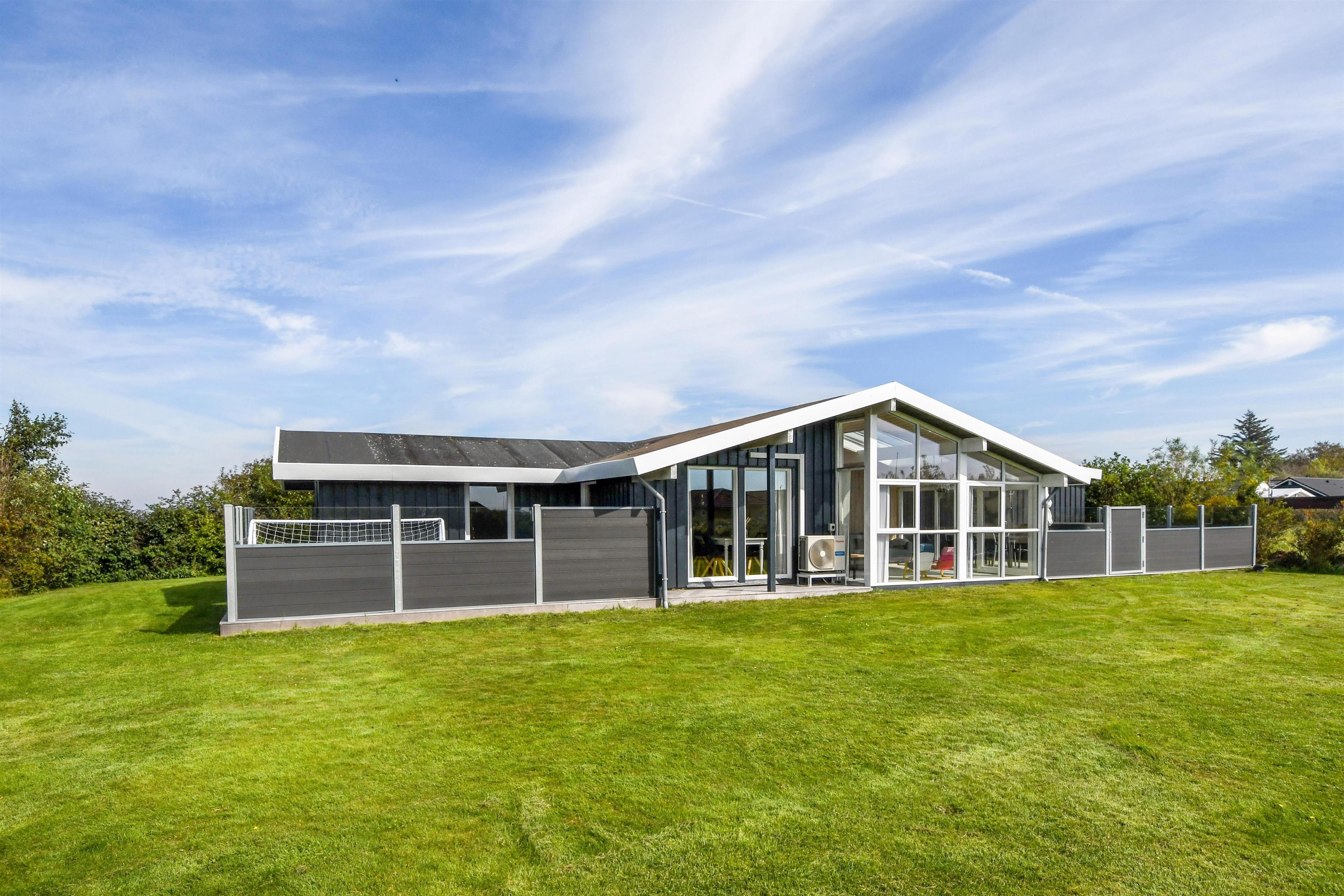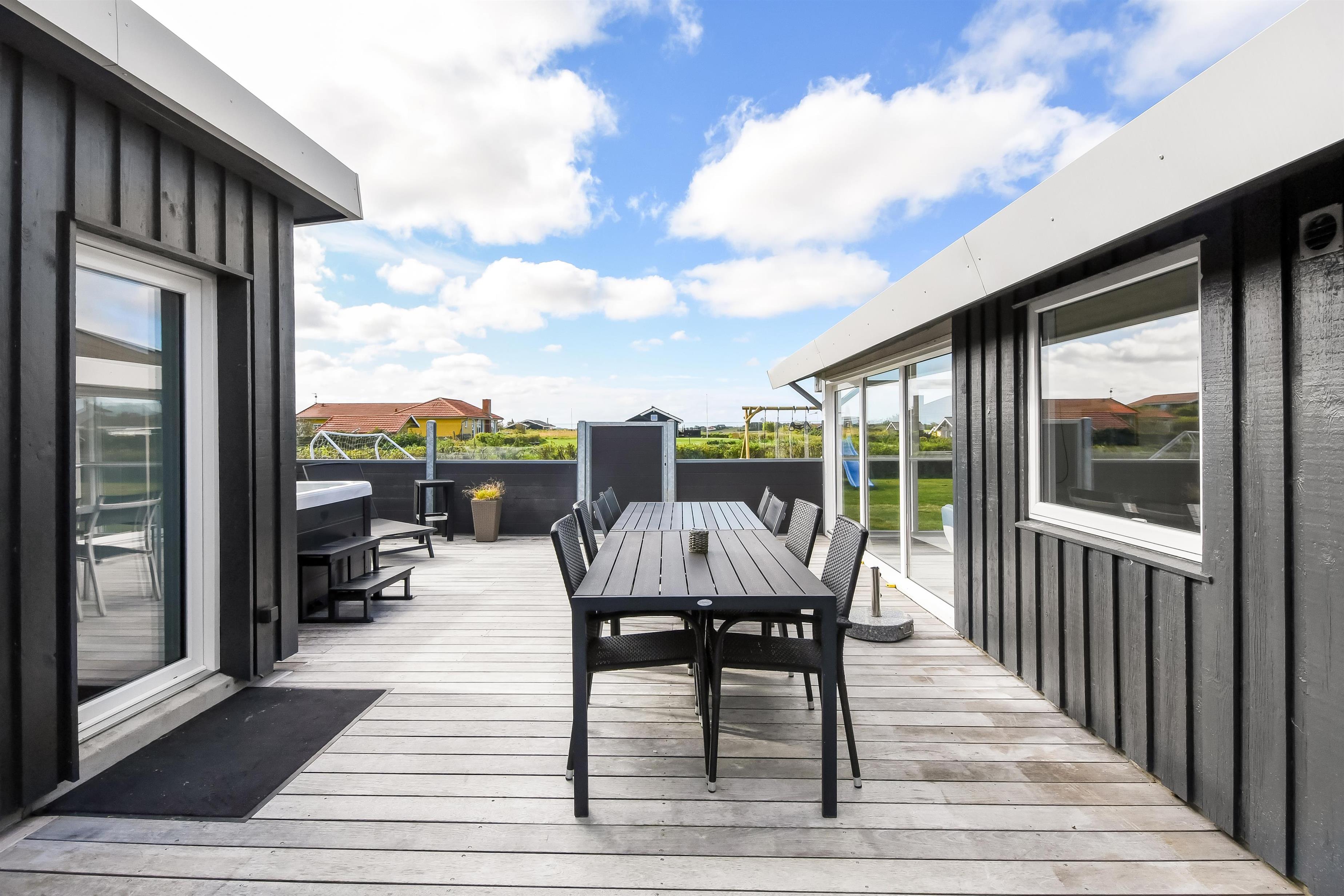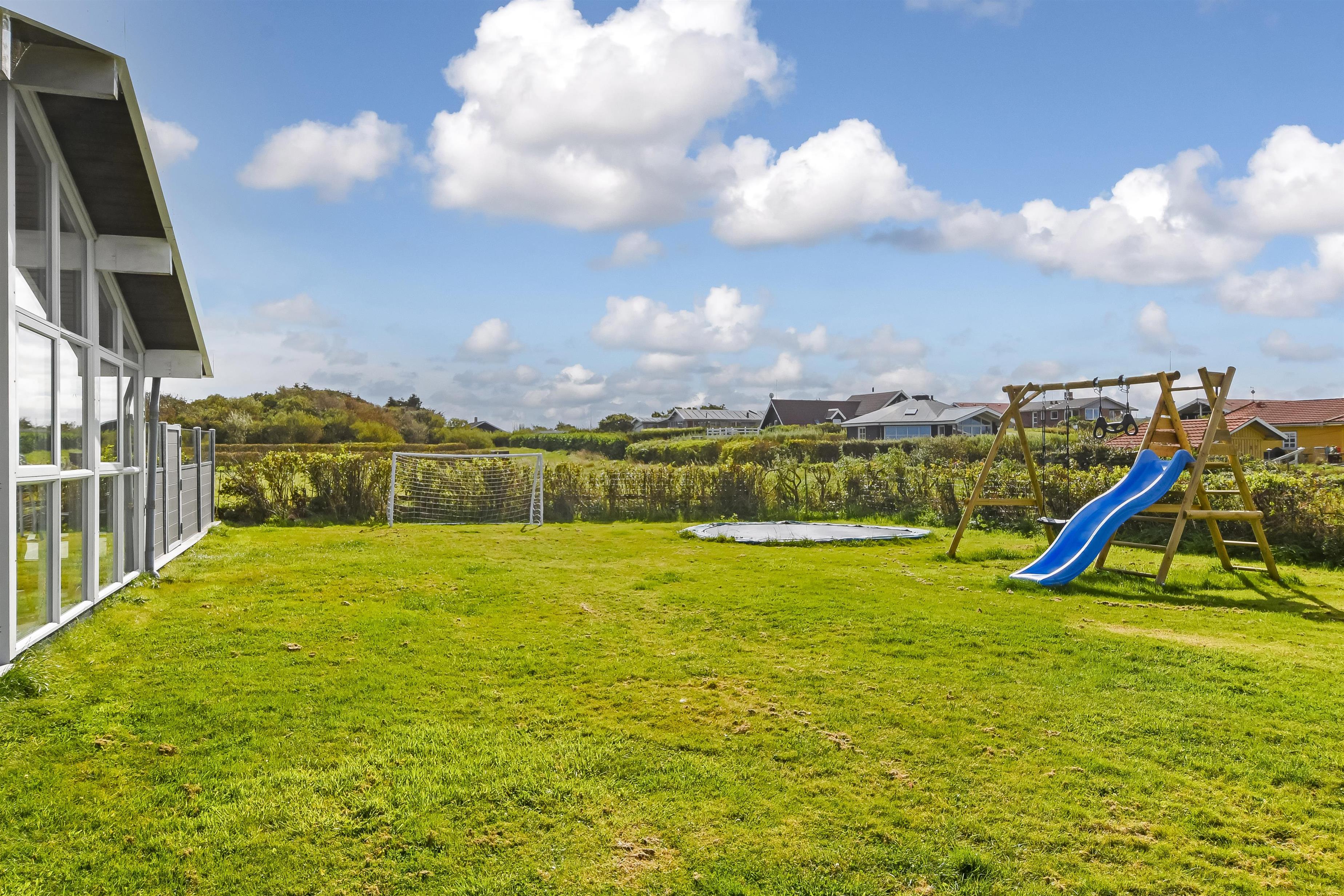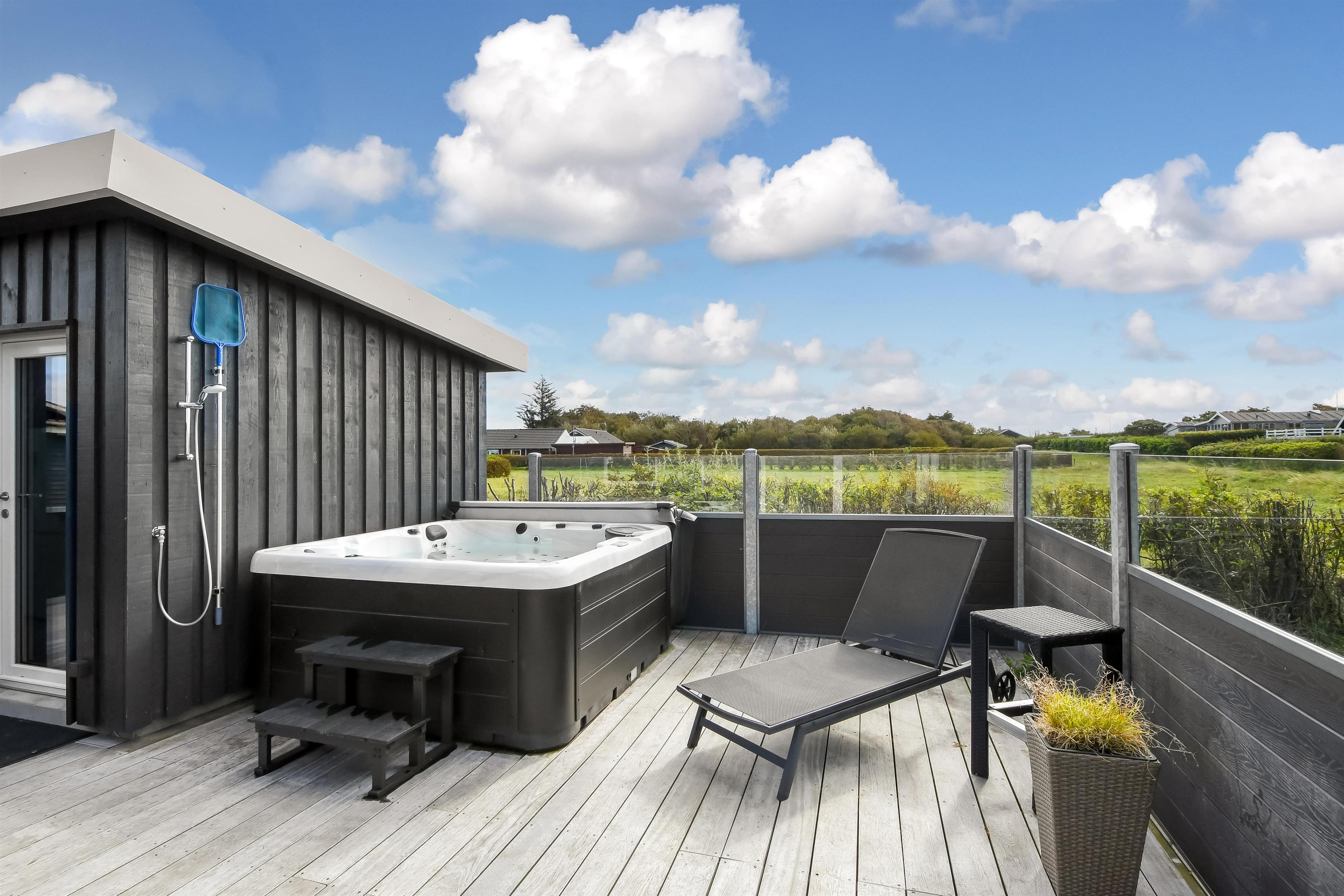 Das Haus liegt auf einem etwa 865 qm großen, eingezäunten Grundstück, in hoher und ungestörter Lage an einem ruhigen Stichweg. Gepflegtes Grundstück mit Trampolin, Schaukel und bloß 700 m vom Strand entfernt. Fantastische, teilweise überdachte Terrassen-Anlage mit Gartenmöbeln, Grill und Sonnenliegen. Hier gibt es auch einen tollen Außen-Whirlpool, den Sie egal wie das Wetter ist, auch abends mit Blick zum Sternenhimmel genießen können. Hier finden Sie immer einen Platz entweder in der Sonne oder windgeschützt und mit Blick zum Limfjord. Gartenmöbel, Sonnenliegen und Grill können nach Bedarf umgestellt werden. Auch auf der hinteren Seite des Hauses gibt es eine Terrasse mit Gartenmöbeln und Blick über die Landschaft. Vom Haus gibt es ein Wegsystem, das Sie in wenigen Minuten zum Fjord, Badestrand und Badebrücken leitet. In der Nähe vom Haus liegt der neue Naturspielplatz aus Naturmaterialien, wo es z.B. Rutsche, Schaukel und vieles andere gibt. Es gibt auch ein Restaurant und einen Eiskiosk, die nur in der Saison geöffnet haben. Außerdem sind es nur 4 km nach Lemvig, einem Handelsort mit vielen Geschäften, Restaurants, Kino, Skaterbahn, Museum u.a.