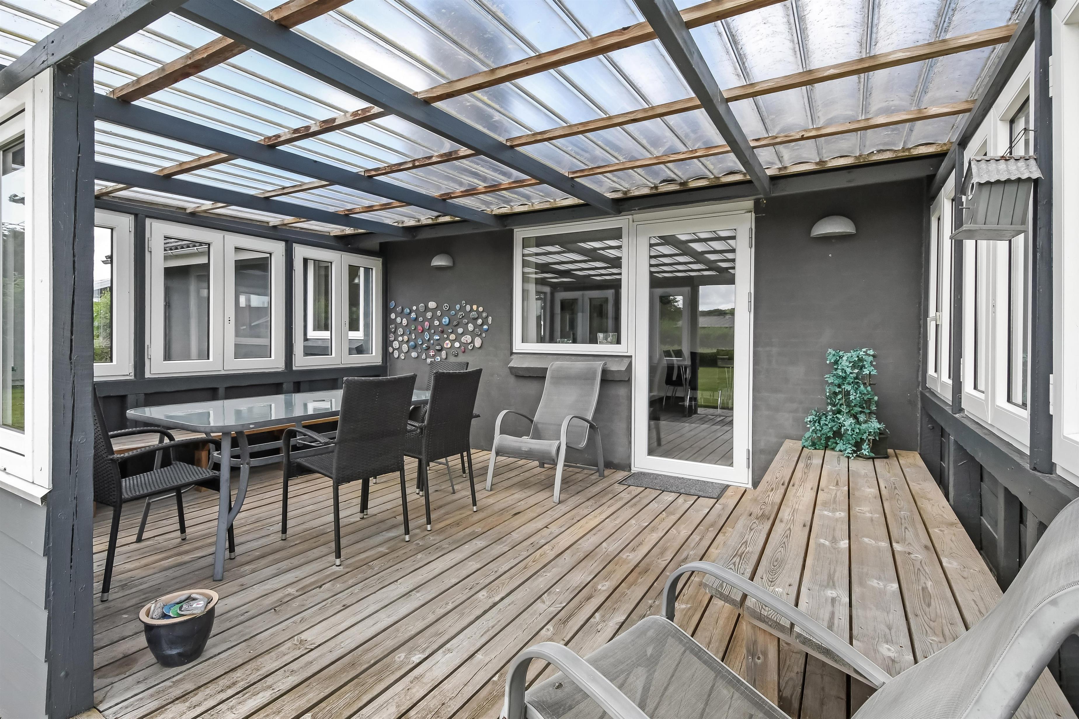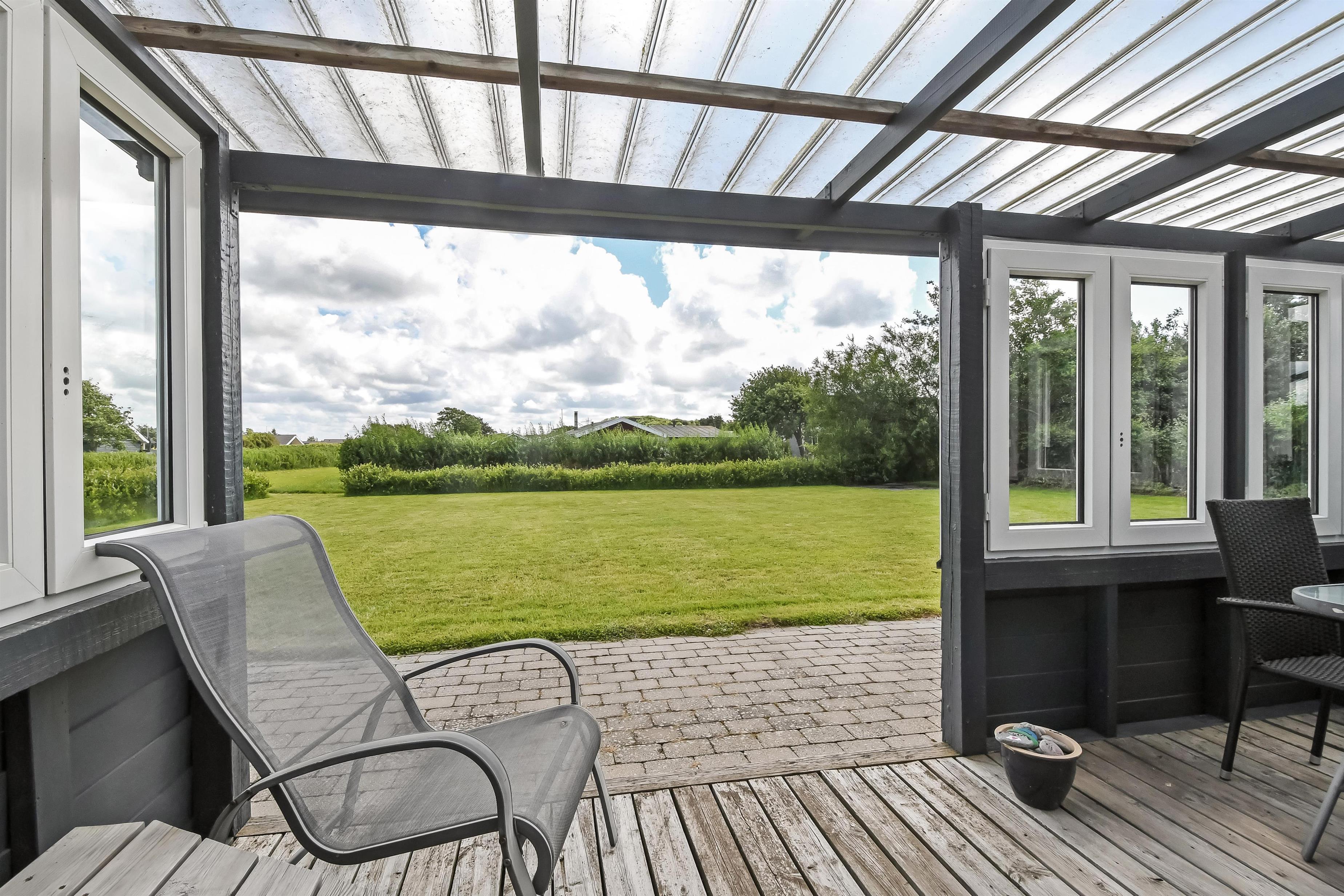 Dieses Haus liegt auf einem etwa 930 qm großen, gepflegten Grundstück. Es gibt eine ganz geschlossene Terrasse/Gartenstube mit Ausgang vom Wohnraum. Hier gibt es Gartentisch und Stühle. Um das Haus herum gibt es mehrere Terrassen; hier können Sie Gartenmöbel, Sonnenliegen und Grill nach Bedarf umstellen, damit Sie immer eine Stelle in der Sonne oder Windschutz finden können.