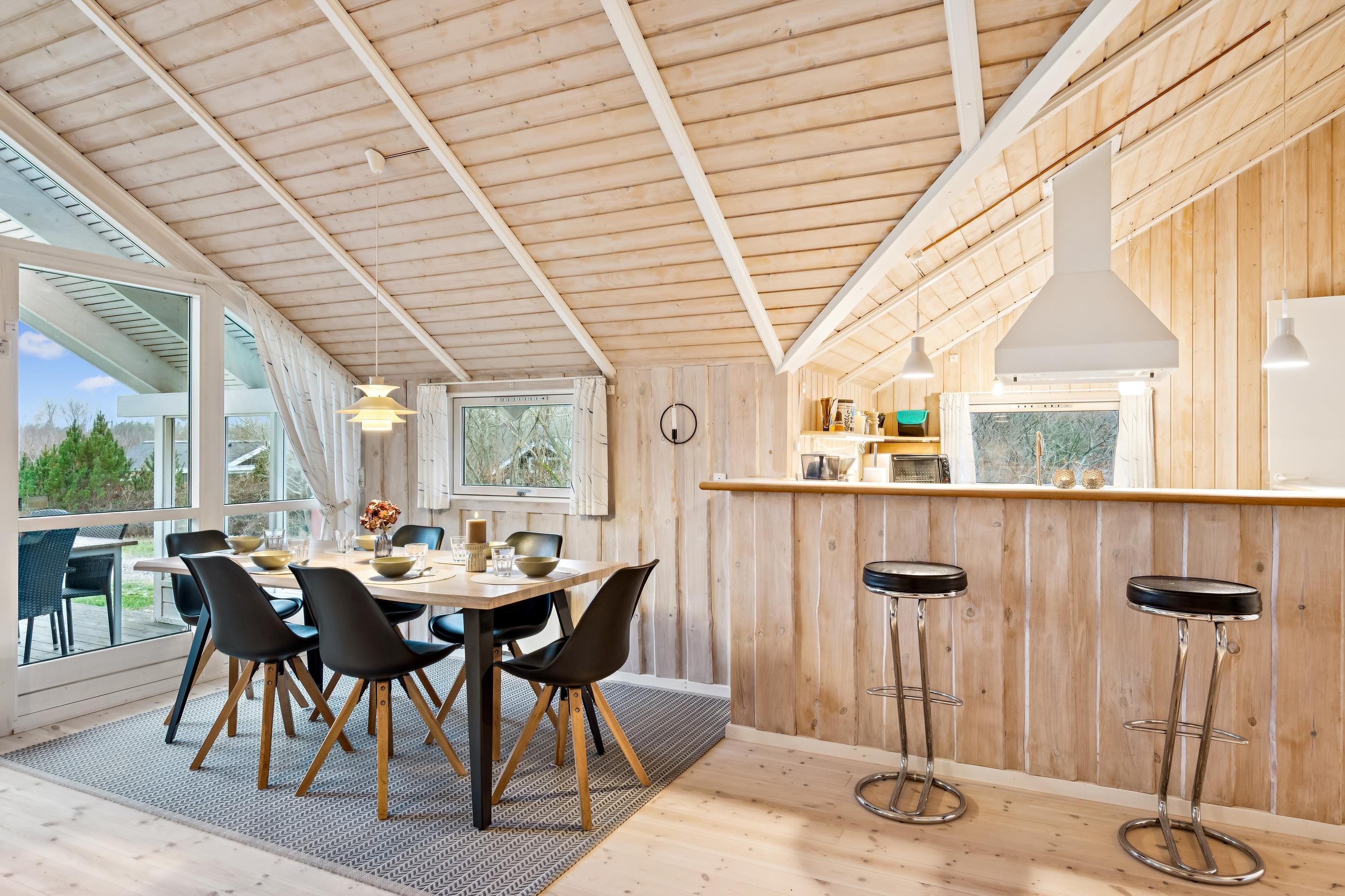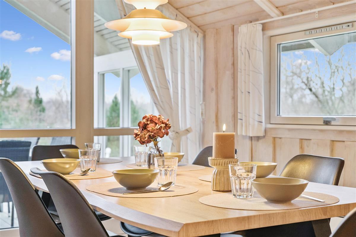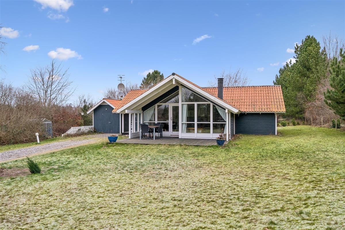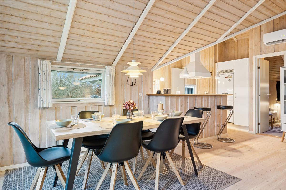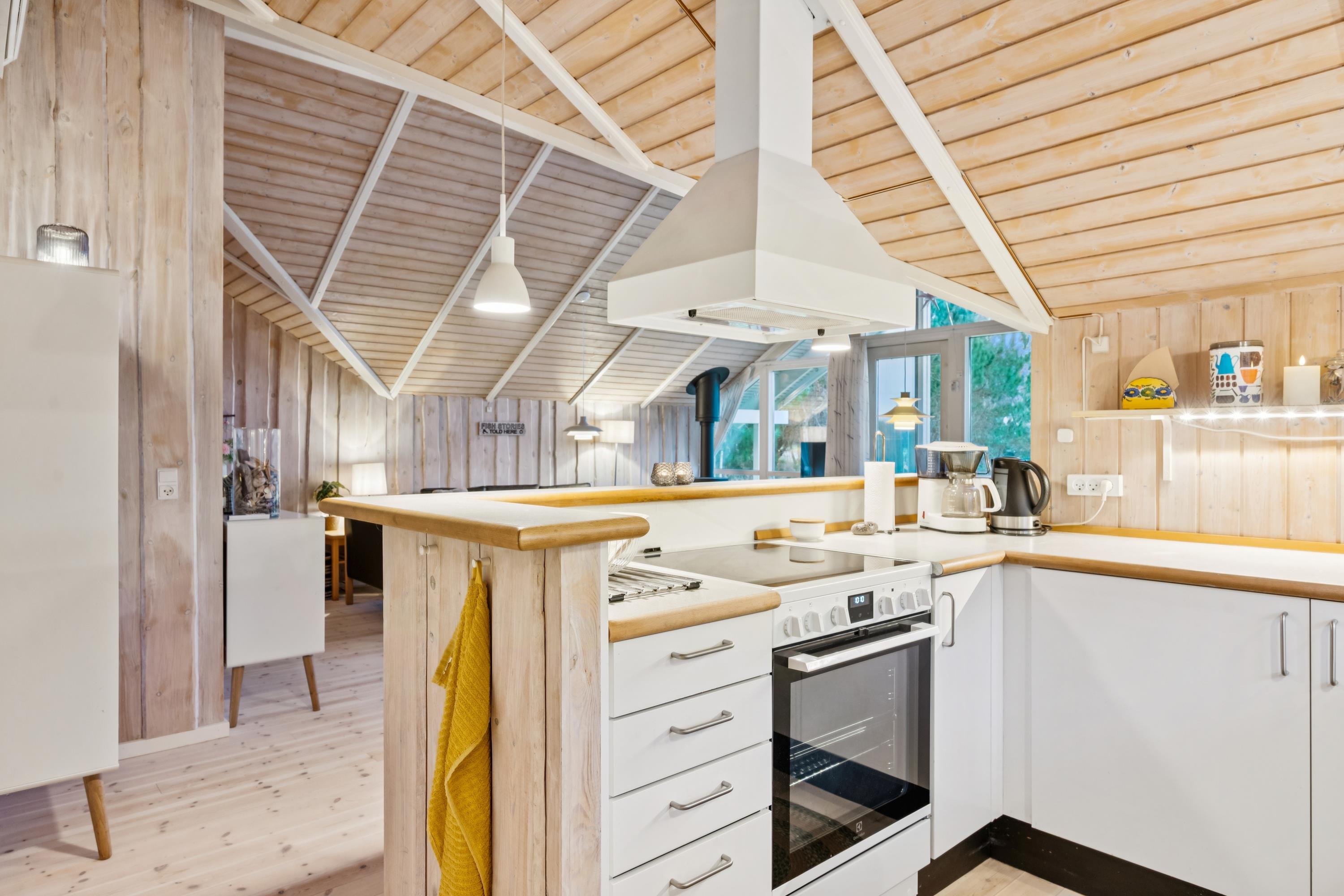 Welcome to this particularly cosy and well-maintained holiday home. The house features a well-furnished and inviting living room with comfortable furniture, a wood-burning stove, and a heat pump. From the living room, there is direct access to a lovely covered terrace with garden furniture. Adjacent to the living room is the cosy kitchen, which includes a dishwasher, as well as a pleasant dining area.