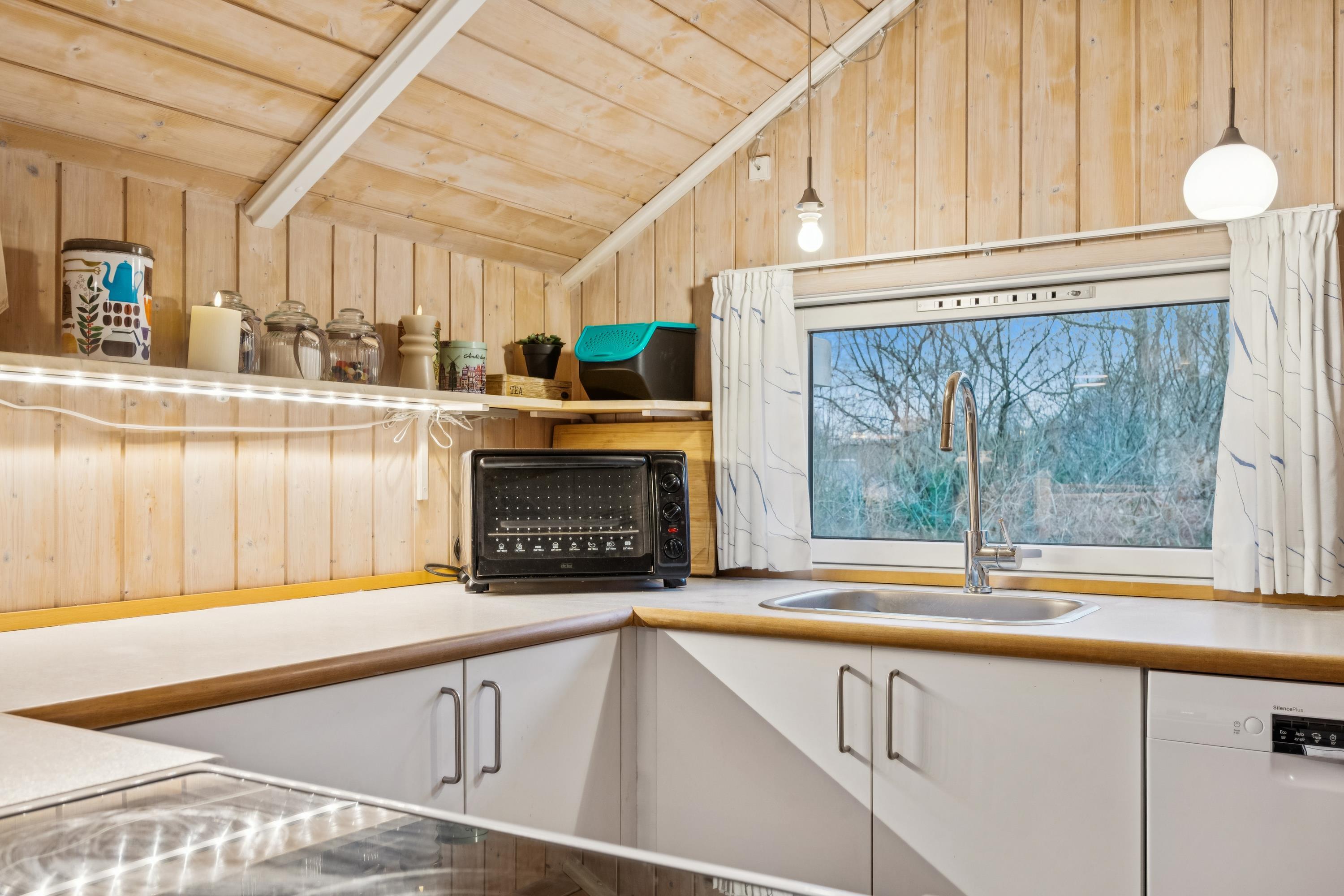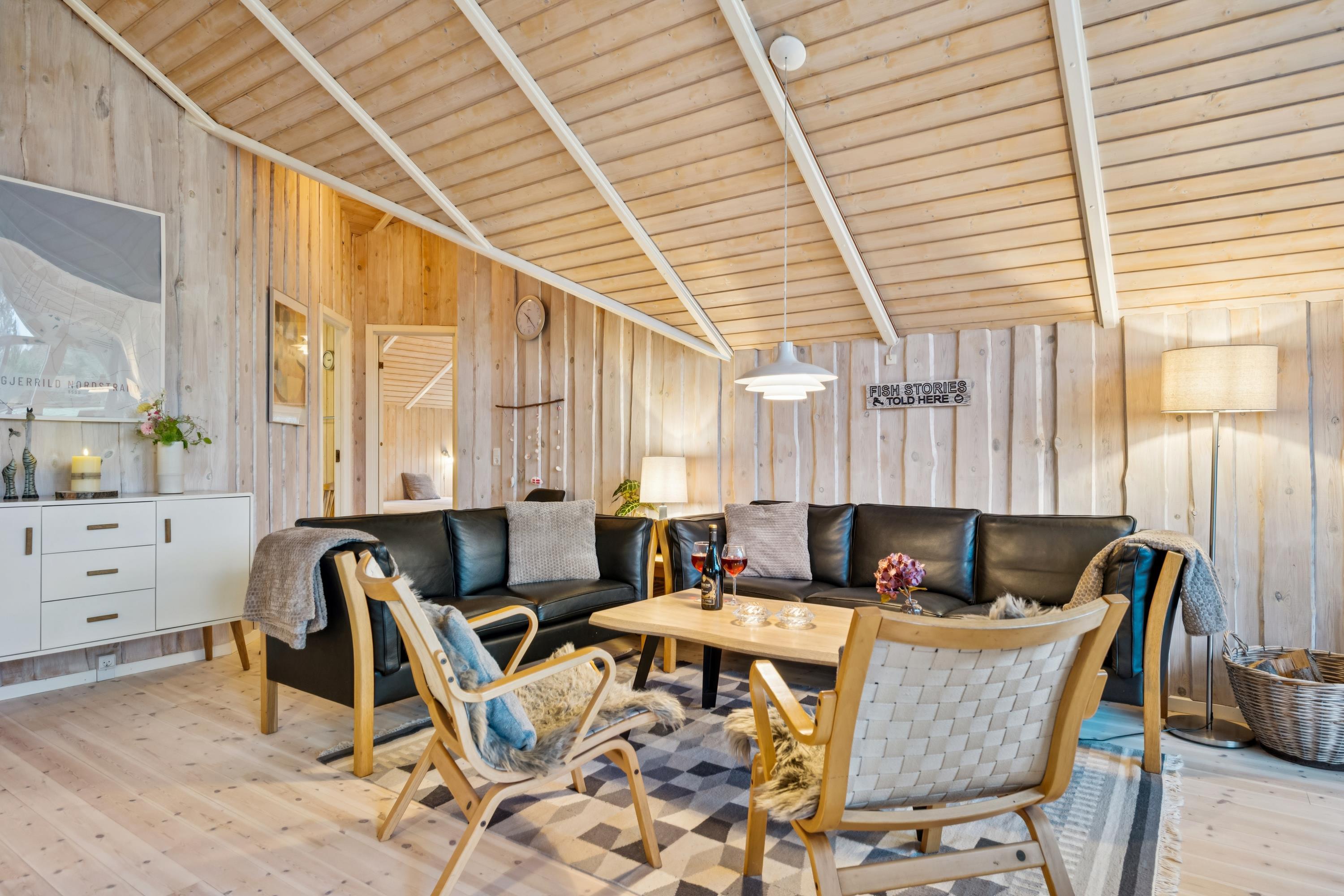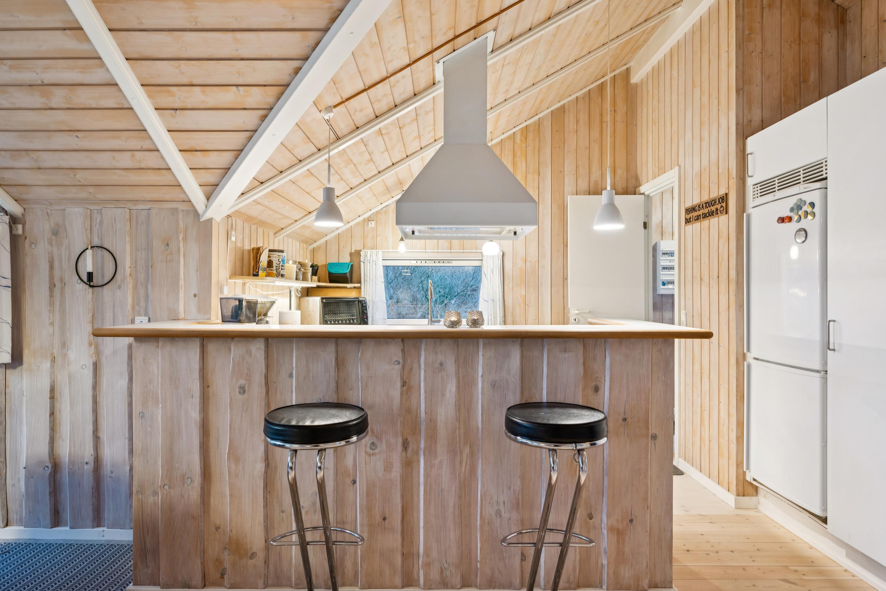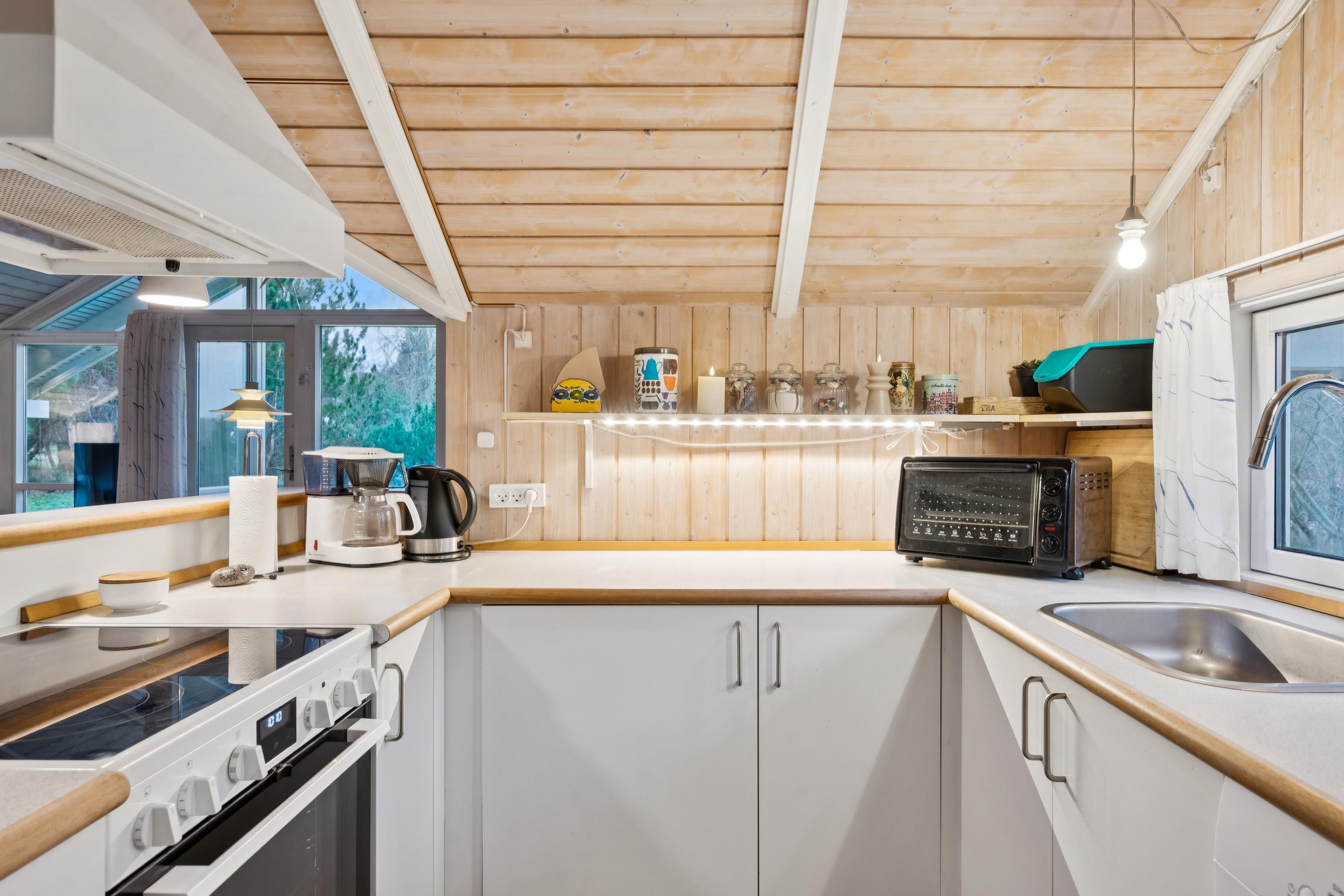 Welcome to this particularly cosy and well-maintained holiday home. The house features a well-furnished and inviting living room with comfortable furniture, a wood-burning stove, and a heat pump. From the living room, there is direct access to a lovely covered terrace with garden furniture. Adjacent to the living room is the cosy kitchen, which includes a dishwasher, as well as a pleasant dining area.