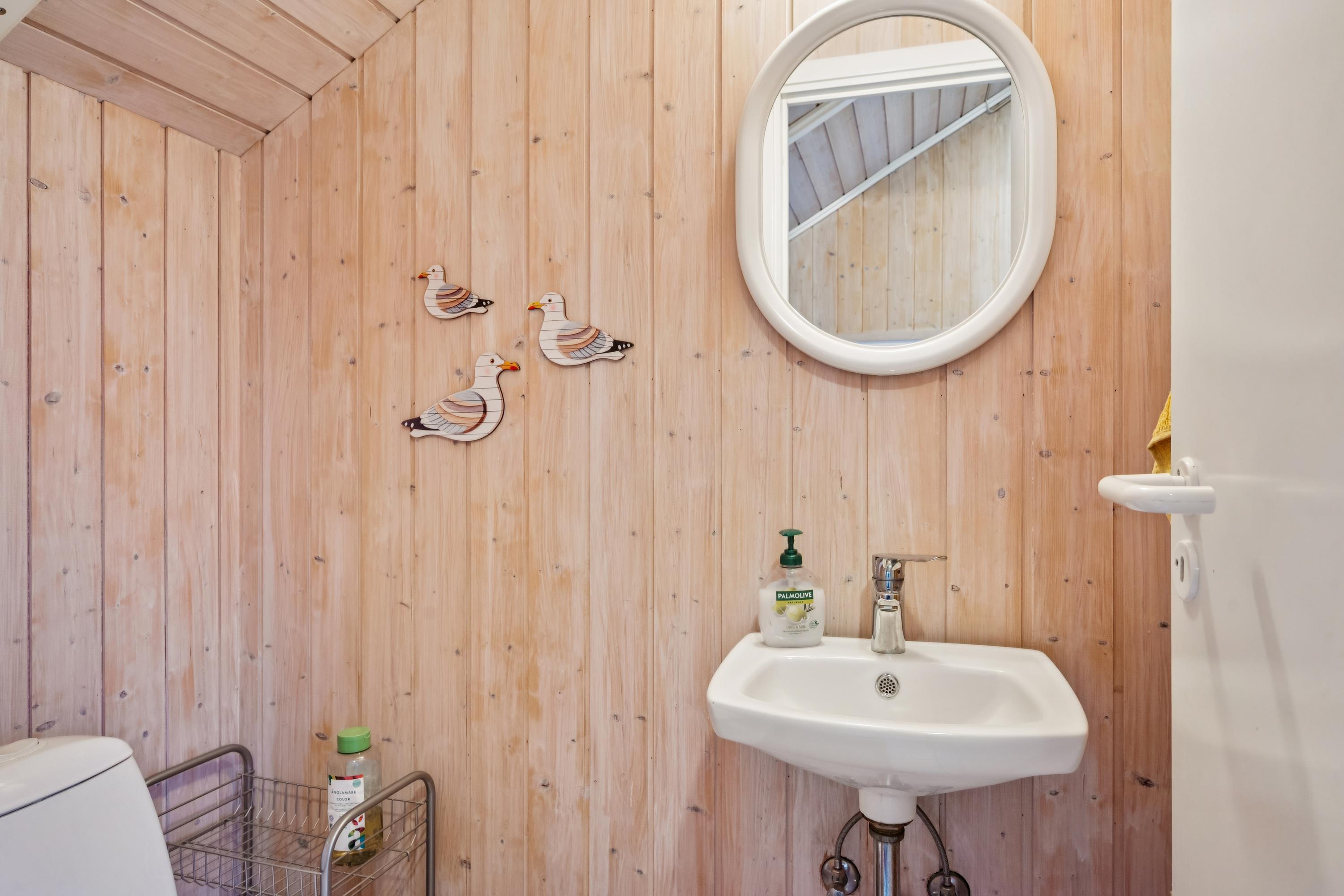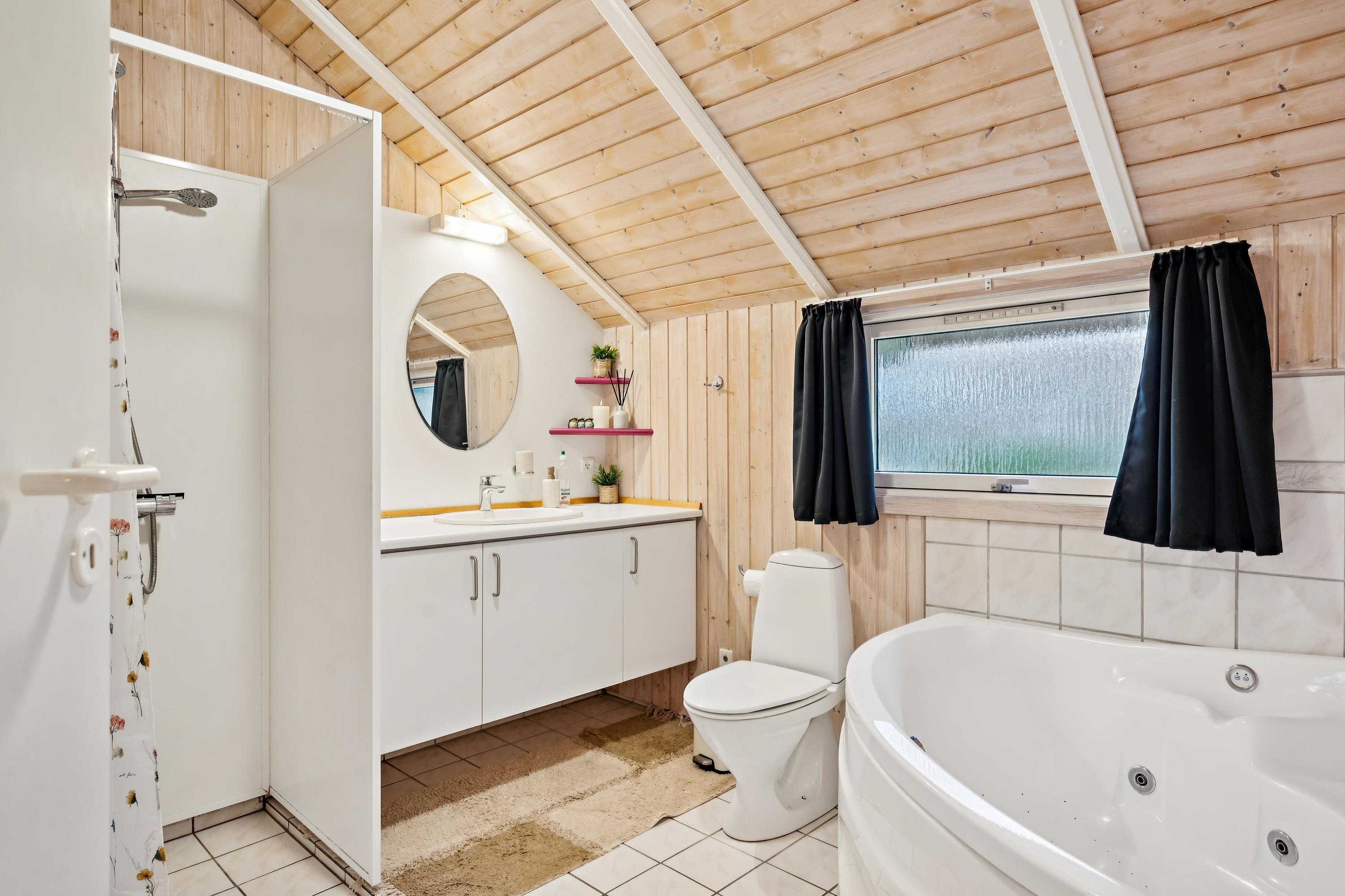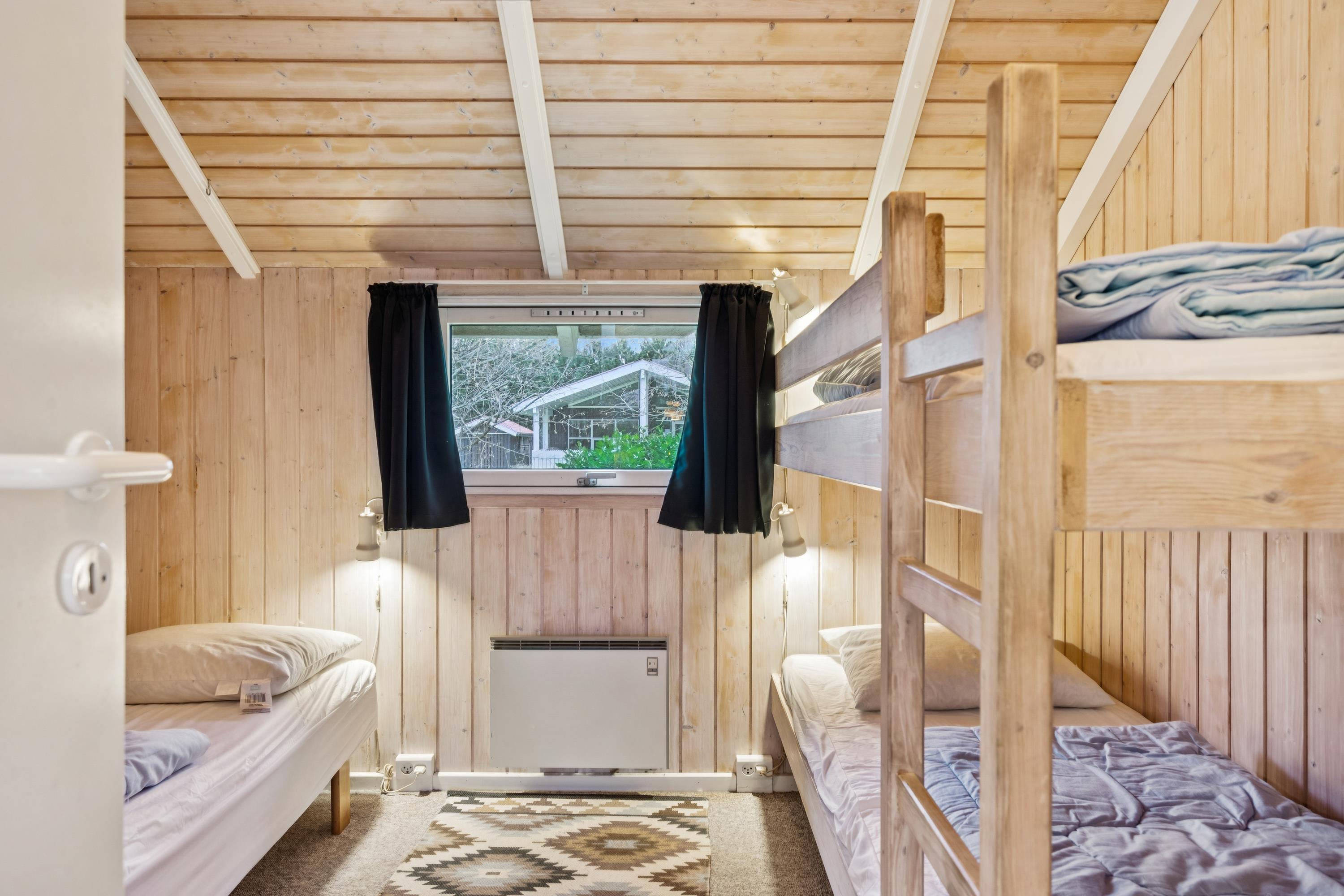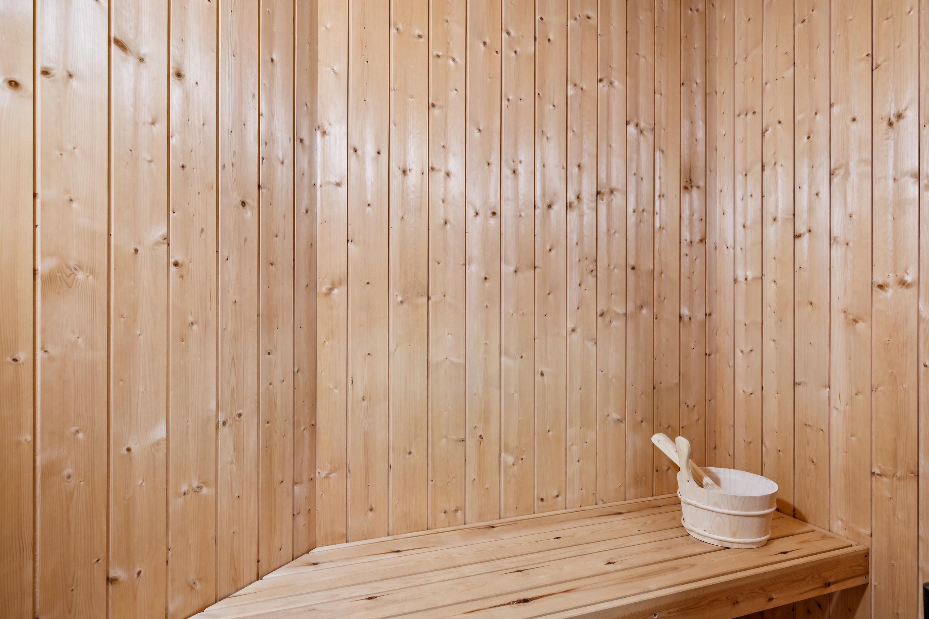 The sleeping accommodation is spread across three comfortable bedrooms: one room with a bunk bed and a single bed, and two rooms with double beds. The house offers a modern bathroom with a bathtub, separate shower, and access to the private sauna. Additionally, there is a guest toilet with a washbasin.