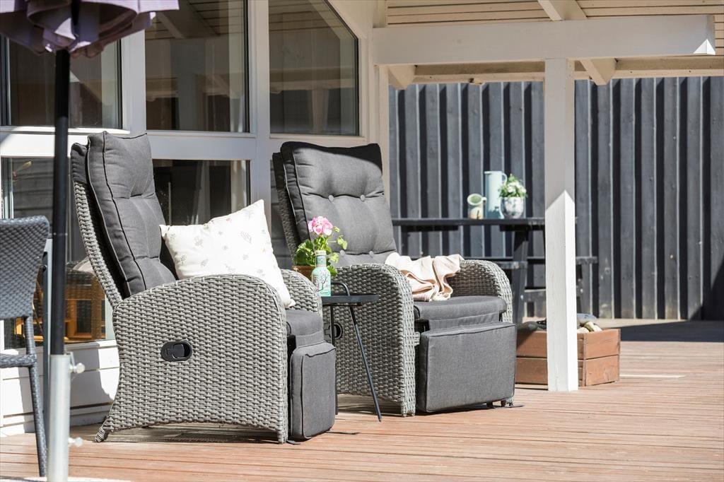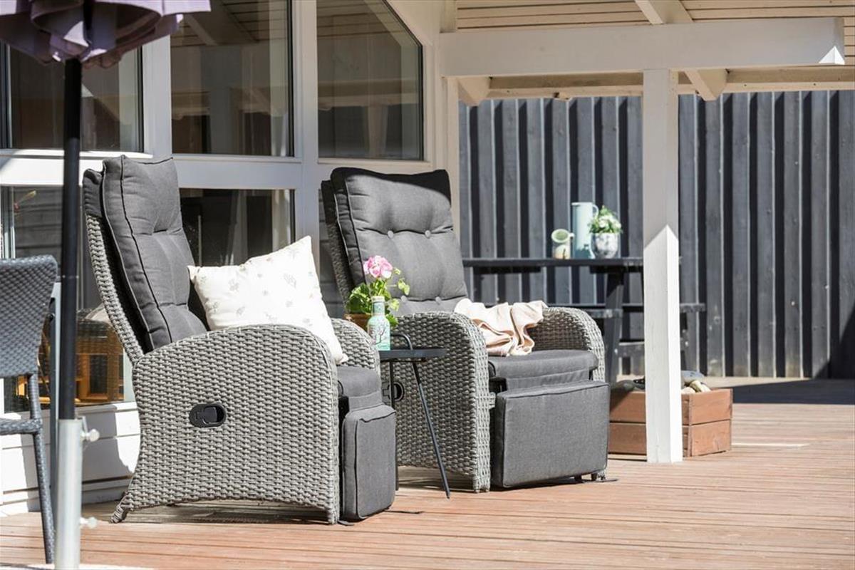 Dein schönes, klassisches Kalmar-Ferienhaus strahlt viel Gemütlichkeit und Wärme aus. Die hohen Decken verleihen dem Haus eine luftige Atmosphäre. Durch die Fenster fällt viel natürliches Licht in die Räumlichkeiten. Unterstrichen wird die gemütliche, natürliche Wohnatmosphäre durch den schönen Holzfußboden. Wohnraum, Küche und Essbereich fügen sich offen zu einem tollen Aufenthaltsraum zusammen. In einer Ecke des Raumes ist ein Kaminofen platziert, der an kühlen Abenden mit behaglicher Wärme und viel Gemütlichkeit verwöhnt. Die Küche ist gut ausgestattet und macht die Zubereitung der täglichen Mahlzeiten zum Vergnügen. Im komfortabel möblierten Wohnraum wirst du dich im Kreise deiner Lieben in vollen Zügen entspannen und erholen. Vom Wohnraum aus gelangst du auf eine herrliche Terrasse, auf der unter anderem ein Outdoor-Whirlpool bereit steht. Das helle, schöne Badezimmer bietet mit seinem Whirlpool und dem Saunazugang ebenfalls beste Entspannungsmöglichkeiten mit einem Hauch von Wellnessflair. Zwei der insgesamt drei ansprechenden Schlafräume sind mit je einem Doppelbett eingerichtet. Im dritten Raum stehen zwei Einzelbetten zur Verfügung. Bei Bedarf könnt ihr das große Nebengebäude im Garten nutzen, in dem ein weiteres Doppelbett und ein Etagenbett untergebracht sind.