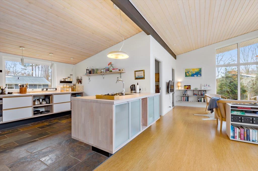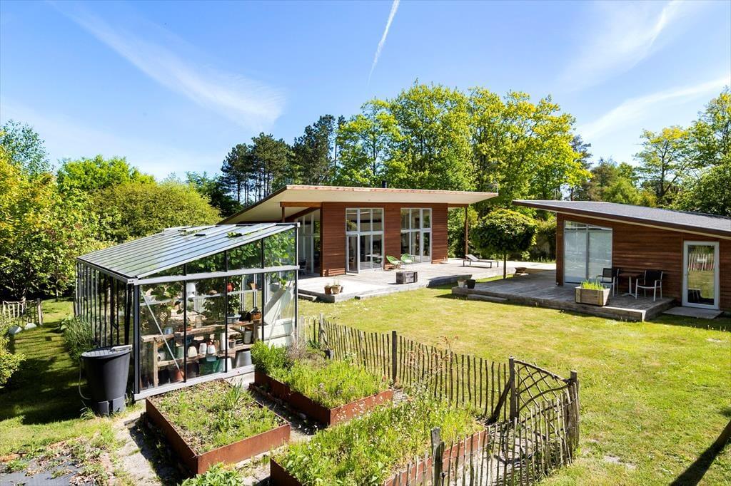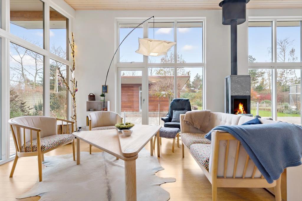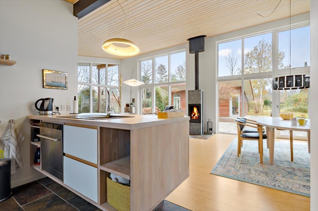 Nur 450 Meter vom herrlichen Badestrand Gjerrild Nordstrand entfernt, begrüßt dich dieses einzigartige, überaus reizende Urlaubsparadies. Das außergewöhnliche Urlaubsdomizil ist der Inbegriff von Qualität und wohldurchdachtem Design - geschaffen mit viel Liebe und Sinn für Ästhetik. Die Badezimmer, die Küche und der Eingangsbereich bestechen mit einem eleganten Schieferboden. Der Rest des Hauses ist mit einem Bambusboden versehen, der dazu einlädt, die Schuhe auszuziehen und das angenehm Gefühl unter den Fußsohlen zu genießen. Die Decken des Hauses sind hoch. Die großen Fenster gewähren einen tollen Tageslichteinfall und schaffen eine schöne Verbindung zur umliegenden Natur. Unmittelbar nach dem ersten Betreten spürst du schon im Eingangsbereich deines Ferienhauses, dass du dich für ein angenehm geräumiges, überaus funktionelles Mietobjekt entschieden hast. Im Eingangsbereich kannst du Strandtaschen und Ähnliches abstellen, Jacken aufhängen und dergleichen. Von dort gelangst du direkt in den hellen Wohnraum, der mit einem tollen Panoramablick in den Garten, auf die Orangerie und das gemütliche Nebengebäude zu überzeugen weiß. Ganz gleich, ob du in der Küche Kartoffeln schälst, den Esstisch deckst oder es dir mit einem spannenden Buch auf dem Sofa gemütlich machst, zu jeder Zeit genießt du den hübschen Ausblick. Der im Wohnraum platzierte Kaminofen untermalt das wertvolle Beisammensein mit deinen Lieben an kühlen Abenden mit behaglicher Wärme und einem Maximum an echter Ferienhausstimmung. Im Haupthaus stehen zwei gemütliche Schlafräume und ein schönes Duschbadezimmer bereit. Einer der Schlafräume empfängt dich mit einem Doppelbett, der andere mit einem doppelten Schlafsofa. Das schöne Nebengebäude umfasst zwei zusätzliche Schlafräume mit doppelten Schlafsofas und ein weiteres Badezimmer. Dieses Ferienhaus eignet sich hervorragend für Urlauber, die ein Urlaubsdomizil weit abseits des Gewöhnlichen suchen.