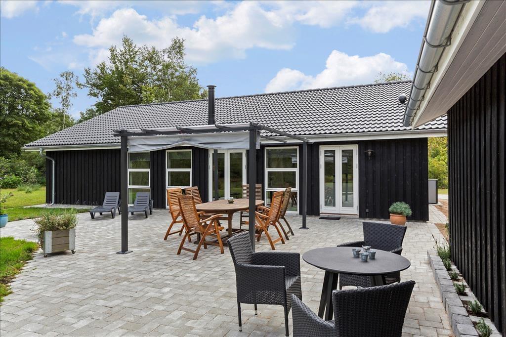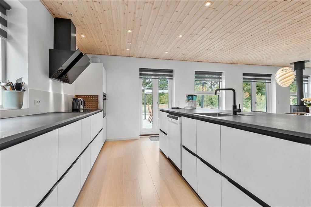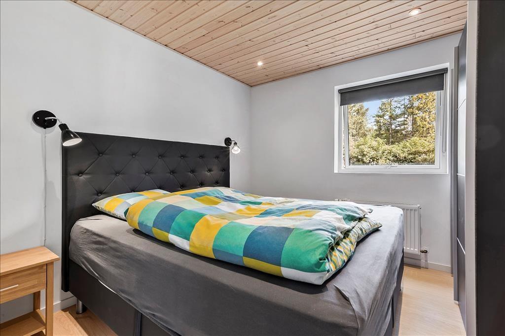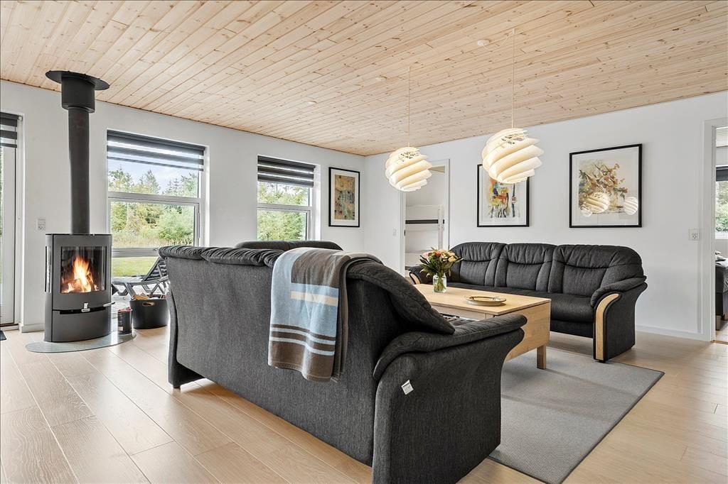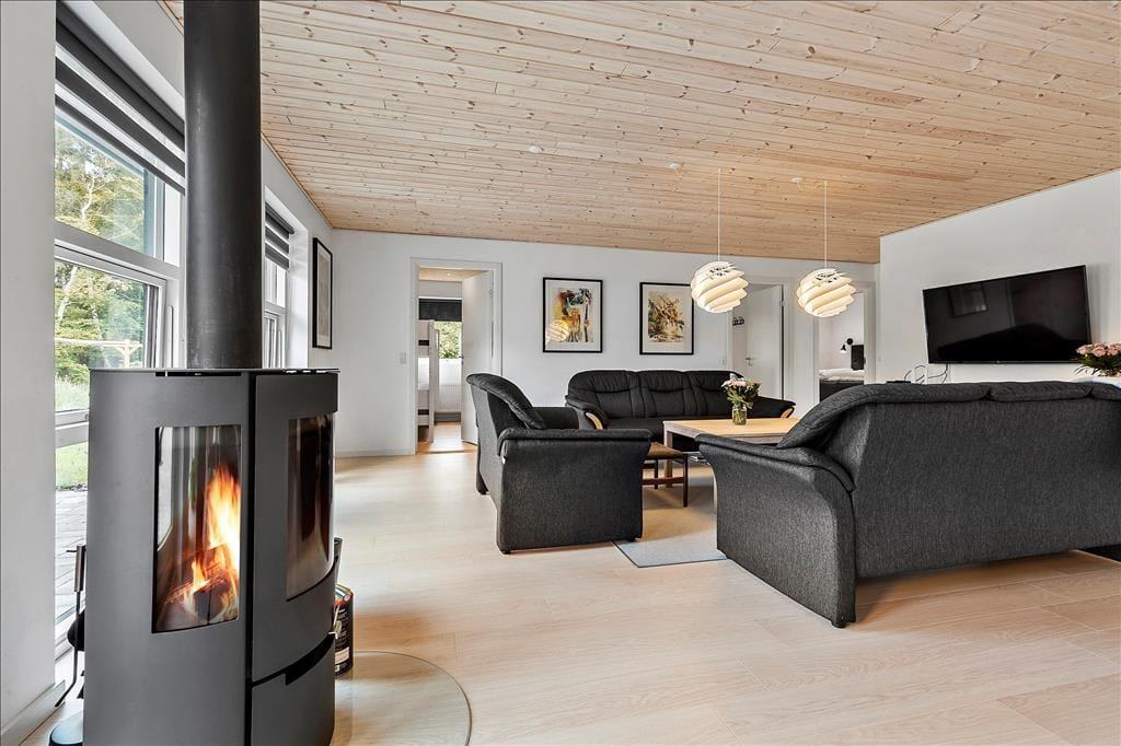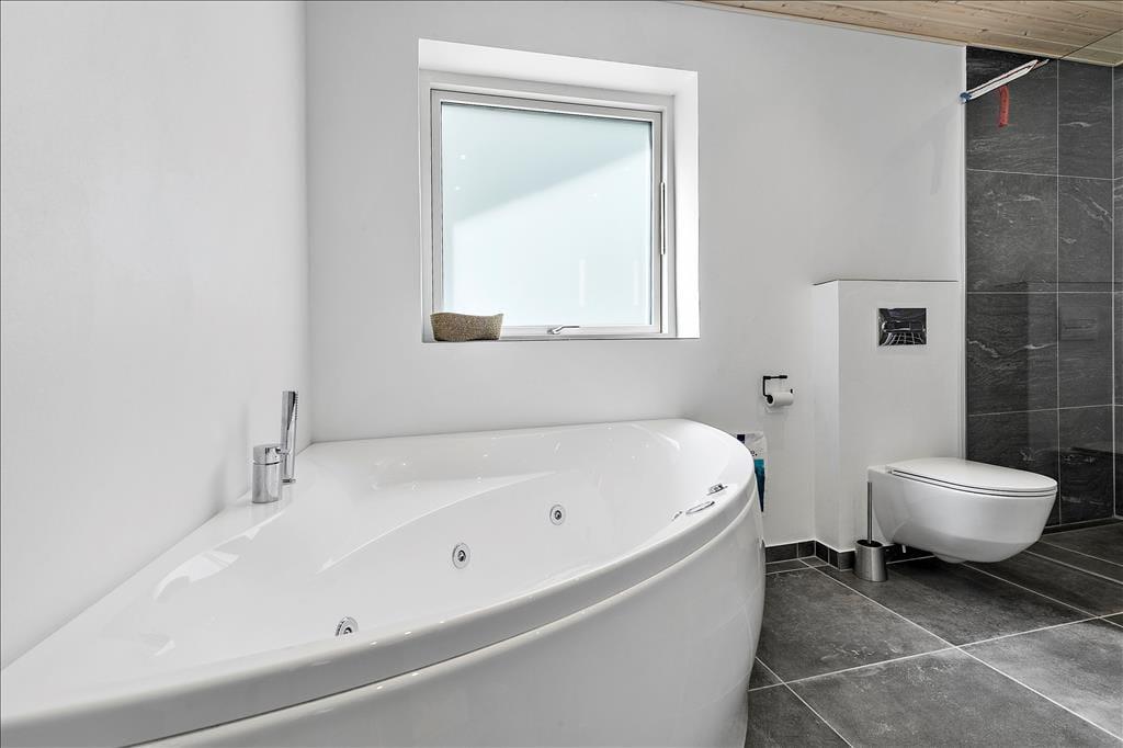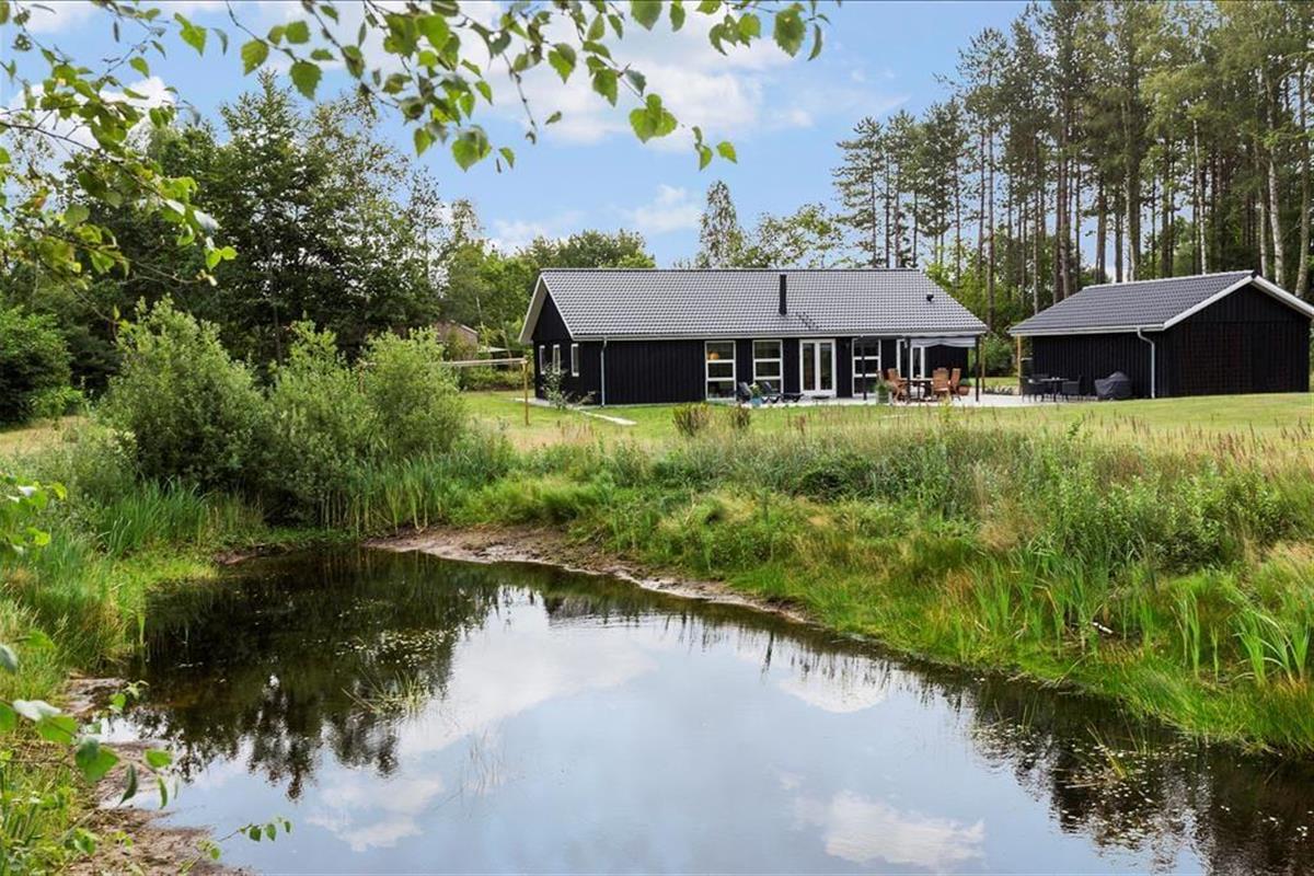 Nahe einem der besten Badestrände Jütlands erwartet Sie dieses fantastische Freizeithaus, das sich mit einem idyllischen See im Garten präsentiert, der direkt vor dem Fenster platziert ist. Die herrliche Aussicht auf den See genießen Sie natürlich nicht nur im Hausinneren, sondern von der schönen Steinterrasse. Die tolle Küche, die sich direkt neben dem schönen Essplatz befindet, präsentiert sich stilvoll, schlicht und mit ansprechendem Design. Sie bietet Ihnen wirklich ALLE Annehmlichkeiten, die die Zubereitung köstlicher Mahlzeiten zum reinsten Vergnügen machen - inklusive eines Geschirrspülers, eines großen Kühl- und Gefrierschranks, eines modernen Backofens, großer Kochplatten und eines tollen, effektiven Dunstabzuges. Die Küche grenzt wie erwähnt direkt und offen an den geräumigen Essbereich, von dem Sie weiter in den gemütlichen Wohnraum gelangen. In diesem stimmungsvollen Raum können Sie sich wunderbar in ein gutes Buch vertiefen, gemeinsam spielen oder den ein oder anderen spannenden Film auf dem Fernseher anschauen. Untermalt werden Ihre wertvollen gemeinsamen Stunden vom behaglichen Knistern des Kaminofens. Vom Essbereich und von der Küche aus haben Sie direkten Zugang zu einer stimmungsvollen Steinterrasse, auf der Sie nach Herzenslust die Sonne, das Beisammensein und gesellige, entspannte Grillabende genießen können. Die Schlafplätze verteilen sich auf vier richtig gute Schlafzimmer, von denen drei mit je einem Doppelbett eingerichtet sind. Im letzten Schlafraum stehen vier Schlafplätze in Form von Etagenbetten für Sie bereit. Der geräumige Eingangsbereich beherbergt problemlos einen Kinderwagen oder andere sperrige Dinge. Zwei schöne Badezimmer stehen selbstverständlich ebenfalls zu Ihrer Verfügung. Eines der Bäder begeistert mit einem Whirlpool, der zu traumhaft erholsamen Momenten voller Wellnessflair und Ruhe einlädt.