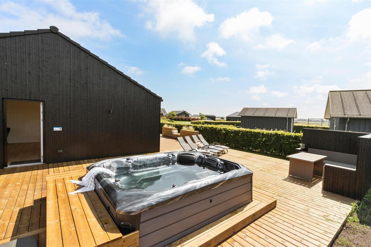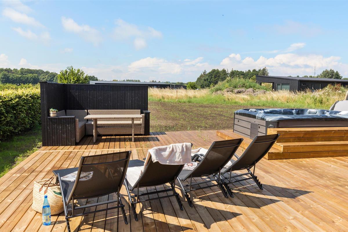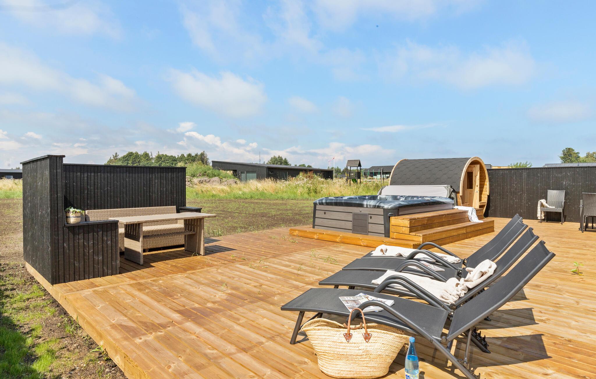 Je grote houten terras is ontworpen voor ontspanning. Op zonnige dagen kun je je ontbijt serveren in de beschutte openluchtruimte, nieuwe energie opdoen op de comfortabele ligstoelen en gezellige momenten doorbrengen in de whirlpool of sauna.