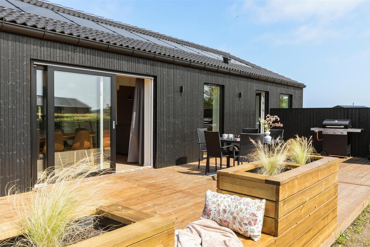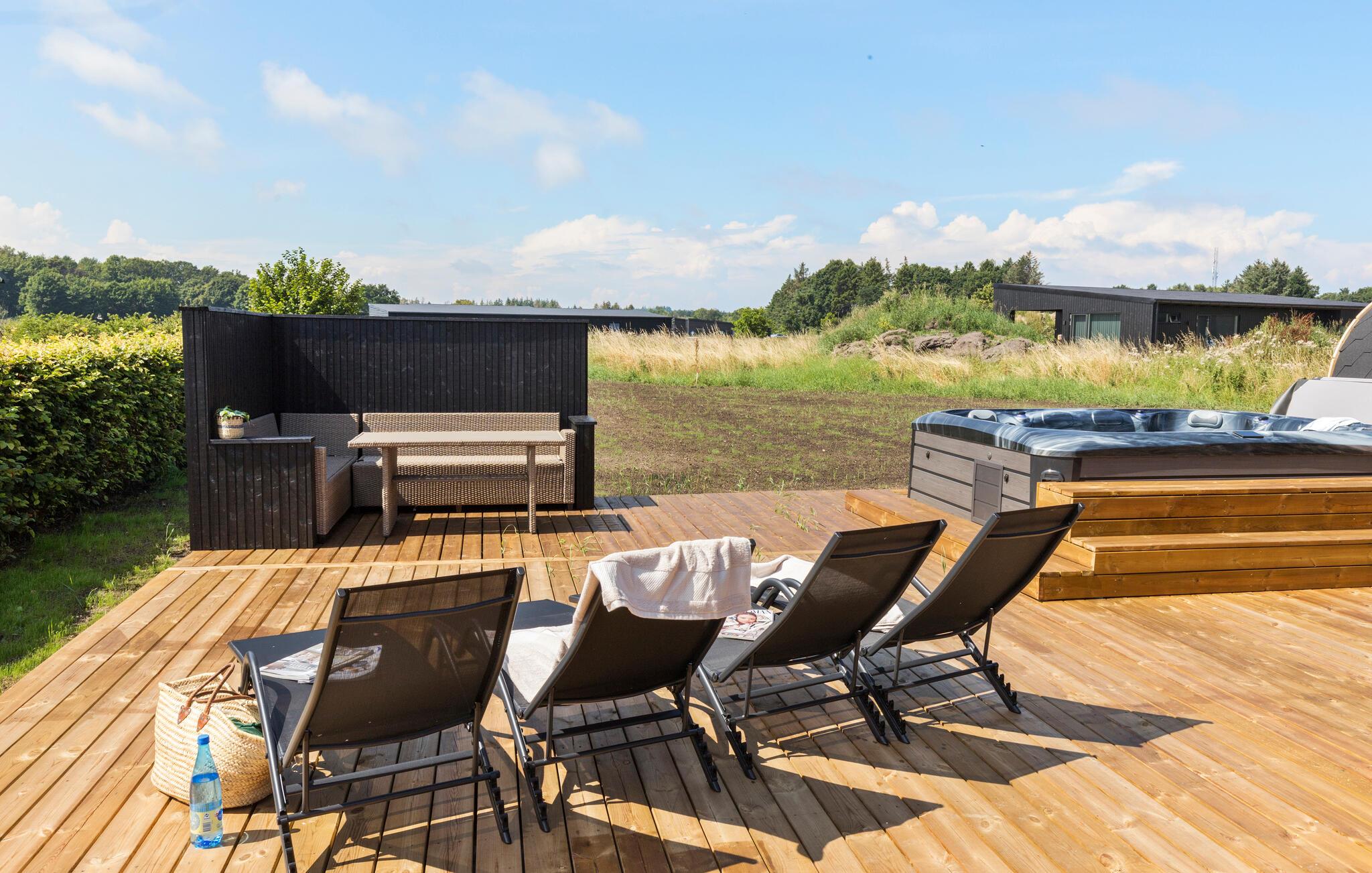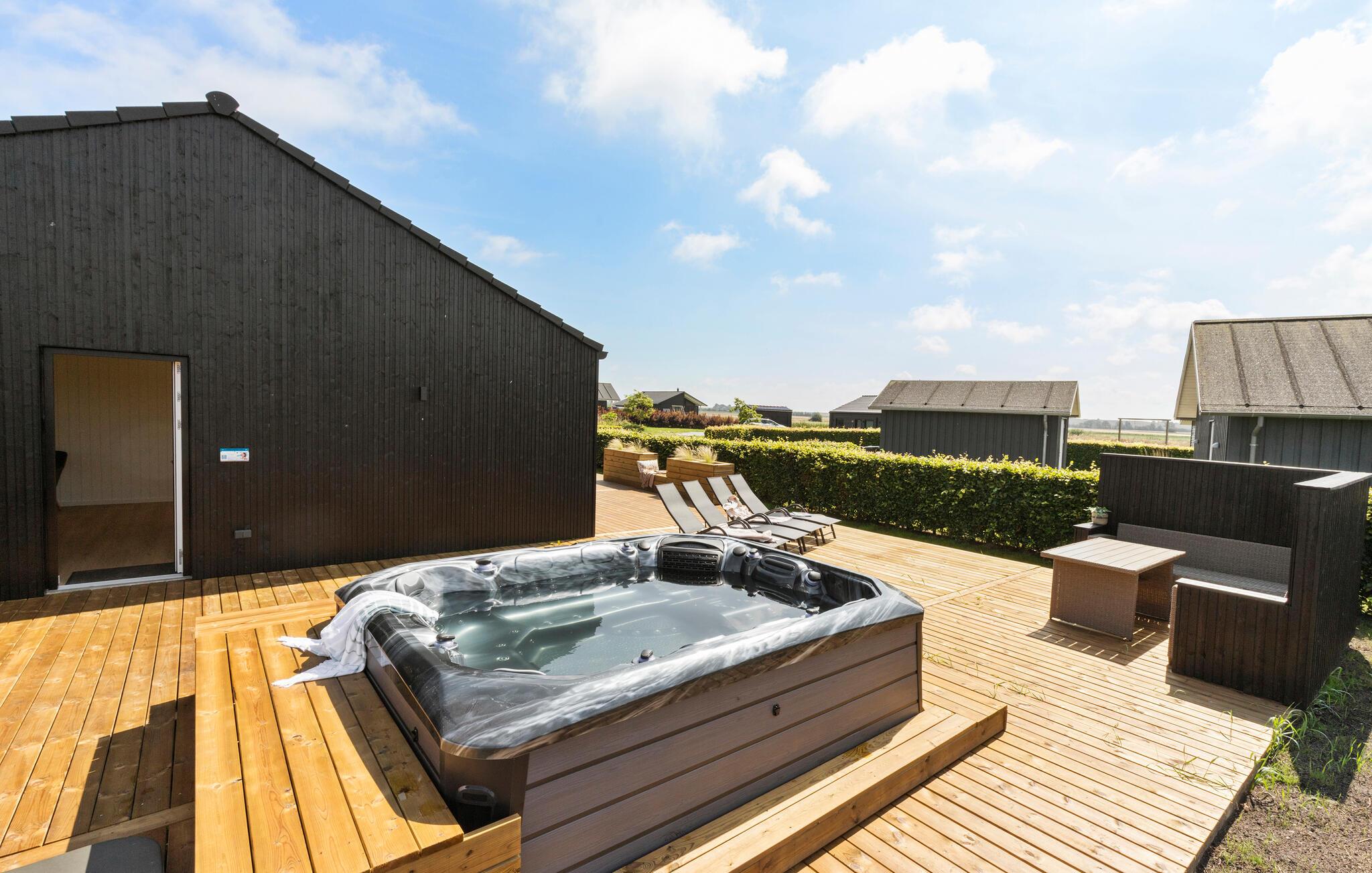 Je grote houten terras is ontworpen voor ontspanning. Op zonnige dagen kun je je ontbijt serveren in de beschutte openluchtruimte, nieuwe energie opdoen op de comfortabele ligstoelen en gezellige momenten doorbrengen in de whirlpool of sauna.