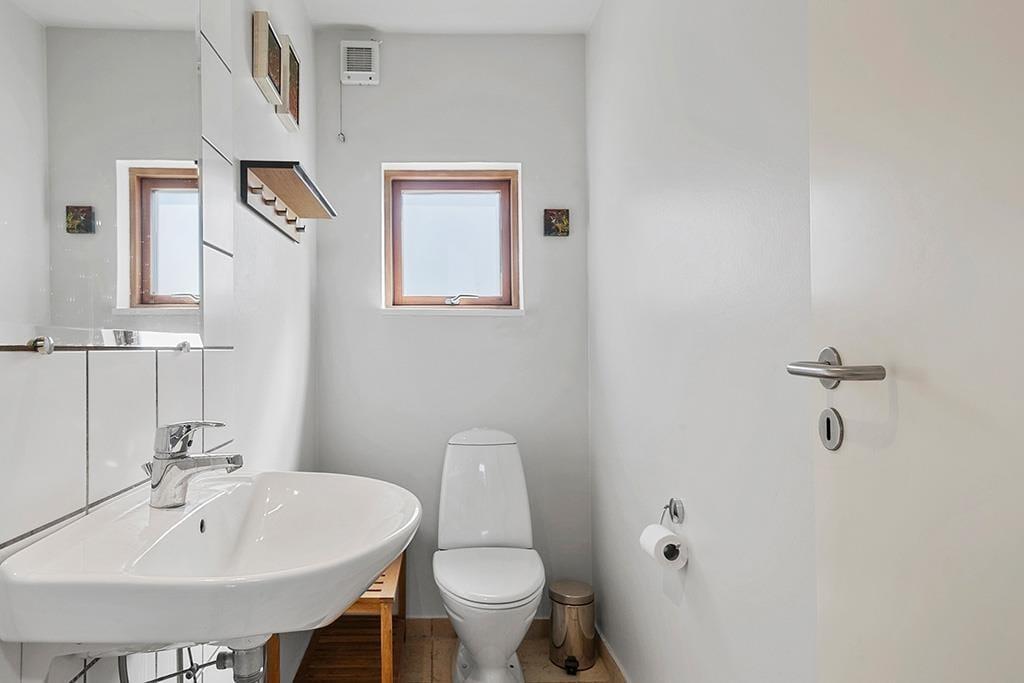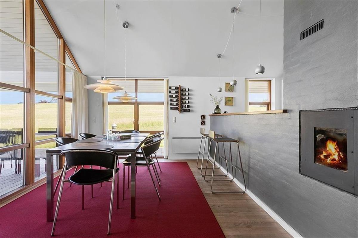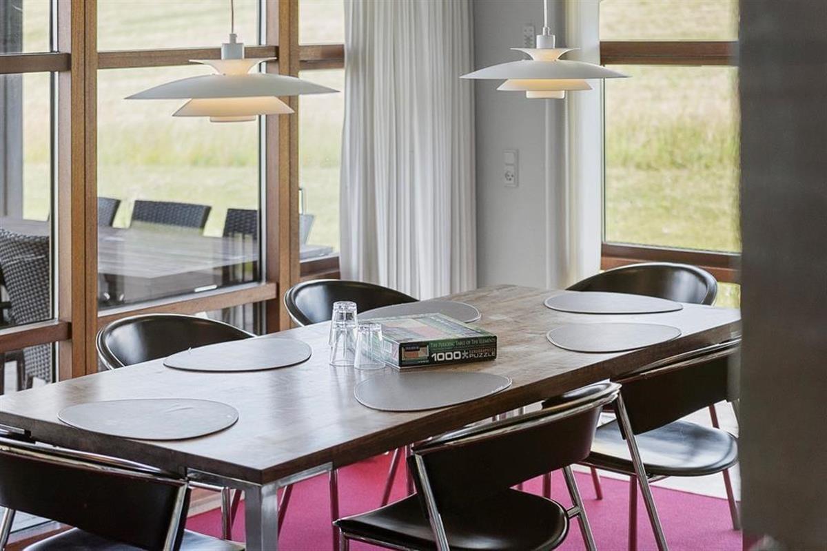 Når du træder ind ad døren, bliver du mødt af en atmosfære, der inviterer til et afslappet ophold. Det åbne og lyse opholdsrum har masser af plads til både socialt samvær og ro. En blanding af hyggelige siddeområder, spiseplads og et hjørne til kort- eller brætspil gør huset ideelt til feriedage med familie eller venner. Indretningen er enkel, men personlig, med varme farver og komfortable møbler—alt er tænkt til, at du skal føle dig hjemme med det samme. De store vinduespartier trækker både lys og den betagende havudsigt ind i rummene, og uanset hvor du slår dig ned, er udsigten med dig. Huset åbner sig for samvær og gode stunder – i et rumligt miljø hvor alle kan finde deres plads.